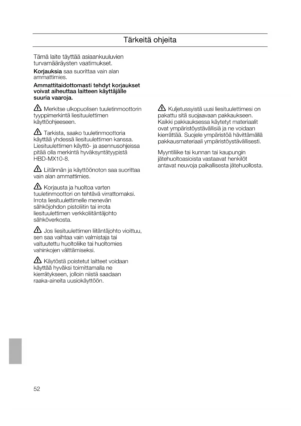 forbindelsene fra viften til damphetten. Tilleggsdekselet på kontakten må av sikkerhetsgrunner alltid være satt på og må være lukket.52 Tärkeitä ohjeita Tämä laite täyttää asiaankuuluvien turvamääräysten vaatimukset. Korjauksia saa suorittaa vain alan ammattimies. Ammattitaidottomasti tehdyt korjaukset voivat aiheuttaa laitteen käyttäjälle suuria vaaroja. Merkitse ulkopuolisen tuuletinmoottorin tyyppimerkintä liesituulettimen käyttöohjeeseen. Tarkista, saako tuuletinmoottoria käyttää yhdessä liesituulettimen kanssa. Liesituulettimen käyttö- ja asennusohjeissa pitää olla merkintä hyväksyntätyypistä HBD-MX10-8. Liitännän ja käyttöönoton saa suorittaa vain alan ammattimies. Korjausta ja huoltoa varten tuuletinmoottori on tehtävä virrattomaksi. Irrota liesituulettimelle menevän sähköjohdon pistoliitin tai irrota liesituulettimen verkkoliitäntäjohto sähköverkosta. Jos liesituulettimen liitäntäjohto vioittuu, sen saa vaihtaa vain valmistaja tai valtuutettu huoltoliike tai huoltomies vahinkojen välttämiseksi. Käytöstä poistetut laitteet voidaan käyttää hyväksi toimittamalla ne kierrätykseen, jolloin niistä saadaan raaka-aineita uusiokäyttöön. Tämä laite täyttää asiaankuuluvien turvamääräysten vaatimukset. Korjauksia saa suorittaa vain alan ammattimies. Ammattitaidottomasti tehdyt korjaukset voivat aiheuttaa laitteen käyttäjälle suuria vaaroja. Kuljetussyistä uusi liesituulettimesi on pakattu sitä suojaavaan pakkaukseen. Kaikki pakkauksessa käytetyt materiaalit ovat ympäristöystävällisiä ja ne voidaan kierrättää. Suojele ympäristöä hävittämällä pakkausmateriaali ympäristöystävällisesti. Myyntiliike tai kunnan tai kaupungin jätehuoltoasioista vastaavat henkilöt antavat neuvoja paikallisesta jätehuollosta.53 Ennen asennusta