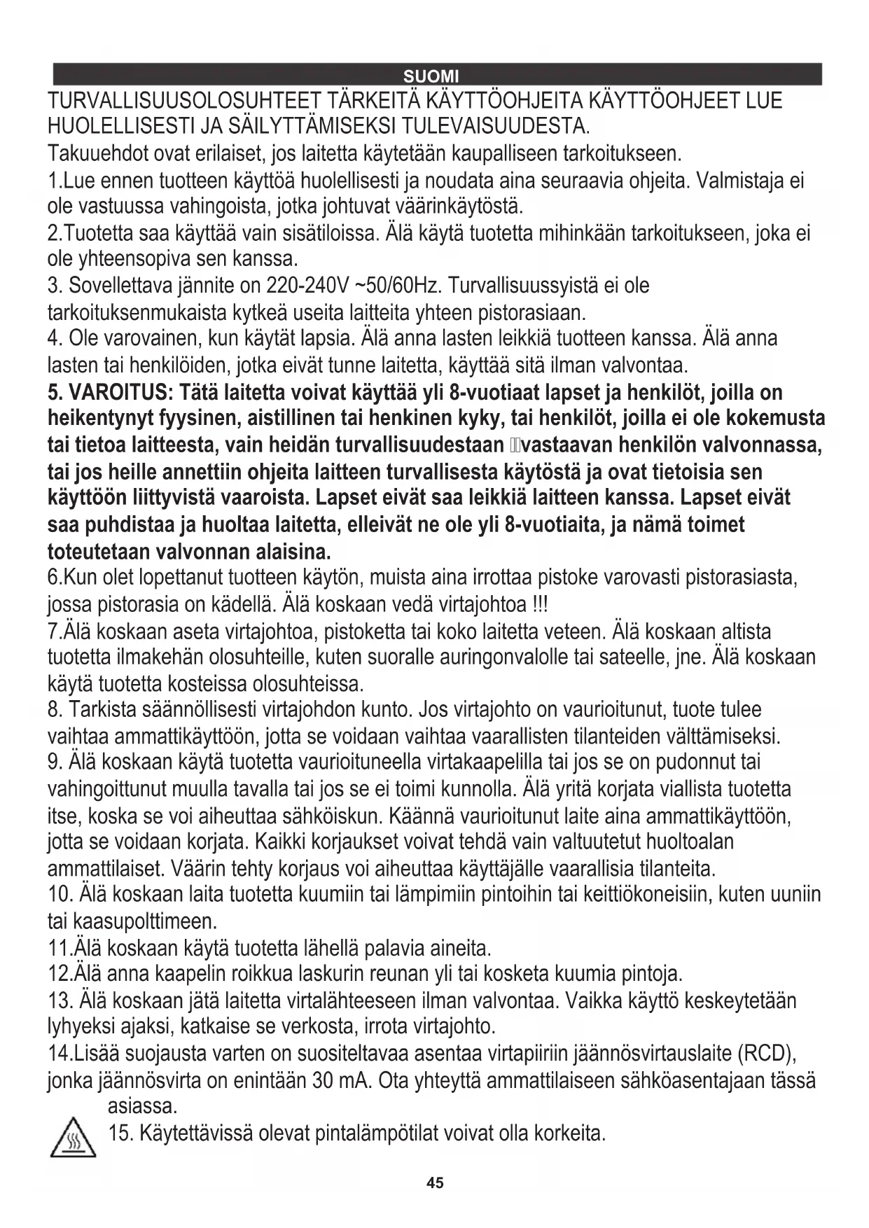 vaihtaa ammattikäyttöön, jotta se voidaan vaihtaa vaarallisten tilanteiden välttämiseksi. 12.Älä anna kaapelin roikkua laskurin reunan yli tai kosketa kuumia pintoja. TURVALLISUUSOLOSUHTEET TÄRKEITÄ KÄYTTÖOHJEITA KÄYTTÖOHJEET LUE HUOLELLISESTI JA SÄILYTTÄMISEKSI TULEVAISUUDESTA. Takuuehdot ovat erilaiset, jos laitetta käytetään kaupalliseen tarkoitukseen. 6.Kun olet lopettanut tuotteen käytön, muista aina irrottaa pistoke varovasti pistorasiasta, jossa pistorasia on kädellä. Älä koskaan vedä virtajohtoa !!! 14.Lisää suojausta varten on suositeltavaa asentaa virtapiiriin jäännösvirtauslaite (RCD), jonka jäännösvirta on enintään 30 mA. Ota yhteyttä ammattilaiseen sähköasentajaan tässä asiassa. SUOMI46