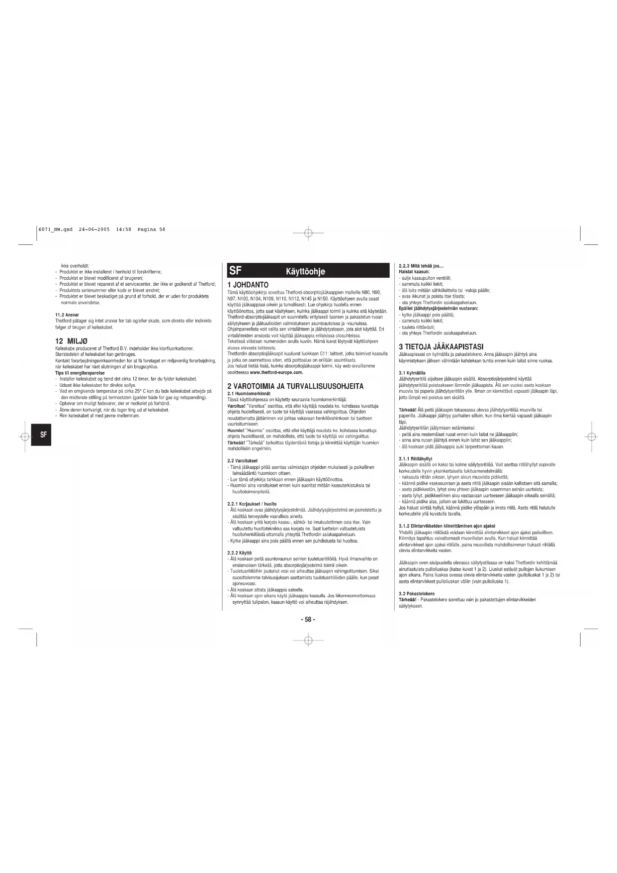 Varoitus! ”Varoitus” osoittaa, että ellei käyttäjä noudata ko. kohdassa kuvattuja ohjeita huolellisesti, on tuote tai käyttäjä vaarassa vahingoittua. Ohjeidennoudattamatta jättäminen voi johtaa vakavaan henkilövahinkoon tai tuotteenvaurioitumiseen. Huomio! ”Huomio” osoittaa, että ellei käyttäjä noudata ko. kohdassa kuvattuja ohjeita huolellisesti, on mahdollista, että tuote tai käyttäjä voi vahingoittua.Tärkeää! ”Tärkeää” tarkoittaa täydentäviä tietoja ja kiinnittää käyttäjän huomionmahdollisiin ongelmiin.2.2 Varoitukset- Tämä jääkaappi pitää asentaa valmistajan ohjeiden mukaisesti ja paikallinenlainsäädäntö huomioon ottaen.- Lue tämä ohjekirja tarkkaan ennen jääkaapin käyttöönottoa.- Huomioi aina varoitukset ennen kuin suoritat mitään kaasutarkistuksia taihuoltotoimenpiteitä.2.2.1 Korjaukset / huolto- Älä koskaan avaa jäähdytysjärjestelmää. Jäähdytysjärjestelmä on paineistettu jasisältää terveydelle vaarallisia aineita.- Älä koskaan yritä korjata kaasu-, sähkö- tai imutuulettimen osia itse. Vainvaltuutettu huoltoteknikko saa korjata ne. Saat luettelon valtuutetuistahuoltohenkilöistä ottamalla yhteyttä Thetfordin asiakaspalveluun.- Kytke jääkaappi aina pois päältä ennen sen puhdistusta tai huoltoa.2.2.2 Käyttö- Älä koskaan peitä asuntovaunun seinien tuuletusritilöitä. Hyvä ilmanvaihto onensiarvoisen tärkeää, jotta absorptiojärjestelmä toimii oikein.- Tuuletusritilöihin joutunut vesi voi aiheuttaa jääkaapin vahingoittumisen. Siksisuosittelemme talvisuojuksen asettamista tuuletusritilöiden päälle, kun pesetajoneuvoasi.- Älä koskaan altista jääkaappia sateelle.- Älä koskaan ajon aikana käytä jääkaappia kaasulla. Jos liikenneonnettomuussynnyttää tulipalon, kaasun käyttö voi aiheuttaa räjähdyksen.2.2.3 Mitä tehdä jos...Haistat kaasun:- sulje kaasupullon venttiili;- sammuta kaikki liekit;- älä laita mitään sähkölaitteita tai -valoja päälle;- avaa ikkunat ja poistu itse tilasta;- ota yhteys Thetfordin asiakaspalveluun.Epäilet jäähdytysjärjestelmän vuotavan:- kytke jääkaappi pois päältä;- sammuta kaikki liekit;- tuuleta riittävästi;- ota yhteys Thetfordin asiakaspalveluun.