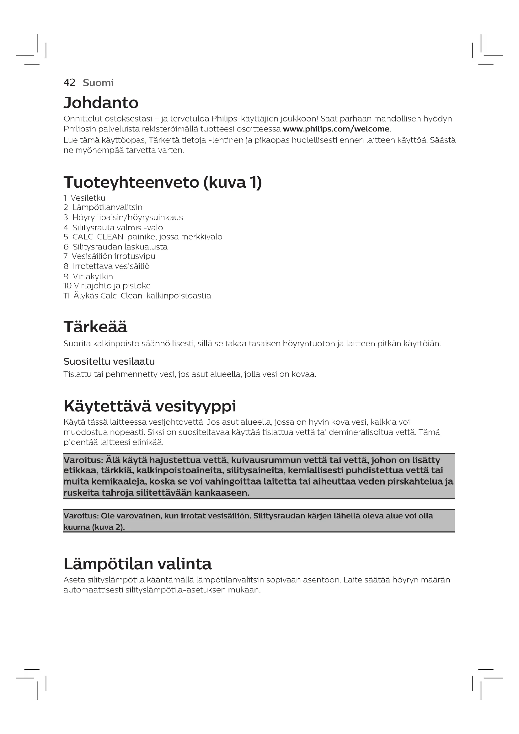 Villa, viskoosi, polyesteri ja silkki 3 PELLAVA Puuvilla, pellava Aloita silittäminen pitämällä höyrypainiketta painettuna. Saat parhaan tuloksen suorittamalla höyrysilityksen jälkeen muutaman viimeisen vedon ilman höyryä. Automaattinen virrankatkaisutila Tämän sarjan tietyissä malleissa automaattinen virrankatkaisu. - Säästääkseen energiaa laite katkaisee virran automaattisesti, kun sitä ei ole käytetty 5 minuuttiin. Silitysrauta valmis -valo vilkkuu. - Käynnistä laite uudelleen katkaisemalla ja kytkemällä virta virtakytkimestä. Laite alkaa kuumentua uudelleen. Puhdistus ja huolto Älykäs Calc-Clean-kalkinpoistojärjestelmä Laitteen älykäs Calc-Clean-järjestelmä takaa, että kalkinpoisto ja puhdistus tehdään säännöllisesti. Tämä ylläpitää laitteen höyryntuottotehoa ja estää lian ja tahrojen kertymisen pitkän käyttöiän aikana. Höyrylaite muistuttaa puhdistuksesta säännöllisesti. Calc-Clean-äänimerkki ja -merkkivalo 1–3 kuukauden käytön jälkeen Calc-Clean-kalkinpoiston merkkivalo alkaa vilkkua ja äänimerkki ilmaisee, että on Calc-Clean-puhdistuksen (kuva 3) aika. Vinkki: Voit jatkaa silittämistä ilman höyryä eli painamatta höyrypainiketta. Lisäksi kalkin kertymistä estetään toisella varotoimella: höyrytoimintoa ei voi käyttää, jos kalkinpoistoa ei suoriteta. Kun kalkinpoisto on suoritettu, höyrytoiminto palaa takaisin käyttöön. Suojatoiminto toimii käytetystä vesilaadusta riippumatta. Huomautus: Calc-Clean-puhdistus voidaan suorittaa milloin tahansa, myös silloin, kun ääni- ja valomerkkejä ei ole vielä annettu. Calc-Clean-puhdistus Calc-Clean-kalkinpoistoastiassa Varoitus: Älä jätä laitetta ilman valvontaa Calc-Clean-puhdistuksen aikana. Varoitus: Älä keskeytä puhdistusta nostamalla silitysrautaa kalkinpoistoastiasta. Muuten pohjasta vapautuu kuumaa vettä ja höyryä. 1 Täytä vesisäiliö puoliksi (kuva 4) täyteen. Huomautus: Varmista, että laite on kytketty pistorasiaan ja sen virta on kytkettynä Calc-Clean- puhdistuksen aikana.44 Suomi 2 Aseta Calc-Clean-kalkinpoistoastia silityslaudalle tai muulle tasaiselle ja tukevalle alustalle. 3 Aseta silitysrauta Calc-Clean-kalkinpoistoastiaan (kuva 5). Huomautus: Calc-Clean-kalkinpoistoastia on tarkoitettu keräämään kalkkia ja kuumaa vettä kalkinpoiston aikana. On täysin turvallista pitää silitysrautaa astian päällä koko puhdistuksen ajan. 4 Paina Calc-Clean-painiketta 2 sekuntia, kunnes kuulet lyhyitä äänimerkkejä (kuva 6). 5 Calc-Clean-puhdistuksen aikana kuulet lyhyitä äänimerkkejä ja pumppaavan äänen (kuva 7). 6 Kun Calc-Clean-puhdistus on päättynyt, silitysrauta ei anna enää äänimerkkejä, ja CALC-CLEAN- merkkivalo lakkaa vilkkumasta (kuva 8). 7 Pyyhi silitysrauta kankaalla ja aseta se takaisin laskualustalle (kuva 9). 8 Calc-Clean-kalkinpoistoastia kuumenee puhdistuksen aikana, joten anna sen jäähtyä 5 minuuttia ennen kuin kosket siihen. Tyhjennä sitten Calc-Clean-kalkinpoistoastia pesualtaaseen ja pane astia takaisin säilöön seuraavaa käyttökertaa varten (kuva 10). 9 Toista tarvittaessa vaiheet 1–7. Muista tyhjentää Calc-Clean-kalkinpoistoastia ennen Calc-Clean- puhdistuksen aloittamista. Huomautus: Calc-Clean-puhdistuksen aikana pohjasta voi valua puhdasta vettä, jos silitysraudan sisään ei ole muodostunut kalkkia. Tämä on normaalia. Vianmääritys Tähän osaan on koottu tavallisimmat laitteen käytössä ilmenevät ongelmat. Ellet löydä ongelmaasi ratkaisua seuraavista tiedoista, lue osoitteesta www.philips.com/support vastauksia usein kysyttyihin kysymyksiin tai ota yhteys maasi asiakaspalveluun. Ongelma Mahdollinen syy Ratkaisu Höyrysilitysraudasta ei tule höyryä. Olet asettanut lämpötilanvalitsimen asentoon SYNTH to 1. Aseta lämpötilanvalitsin vähintään asentoon 2. Höyrytoiminto on poistettu käytöstä, kunnes Calc- Clean-toimenpide on suoritettu. Voit palauttaa höyrytoiminnon suorittamalla Calc-Clean-toimenpiteen. (katso kohta Puhdistus ja hoito) Höyryliipaisinta ei ole painettu silitystä aloitettaessa tarpeeksi pitkään. Paina höyrypainiketta, kunnes laite alkaa tuottaa höyryä. Voi kestää jopa 30 sekuntia, ennen kuin laite alkaa tuottaa höyryä. Calc-Clean-merkkivalo vilkkuu. Pohjasta ei tule höyryä, ja/tai laitteesta kuuluu merkkiääni. Et ole suorittanut Calc- Clean-puhdistusta tai puhdistus on jäänyt kesken. Saat höyrytoiminnon uudelleen käyttöön suorittamalla Calc-Clean-puhdistuksen (katso kohta Puhdistus ja hoito). Laitteesta on katkaistu virta. Laitteen virta katkeaa automaattisesti, kun sitä ei ole käytetty viiteen minuuttiin. Käynnistä laite uudelleen katkaisemalla ja kytkemällä virta virtakytkimestä. Laite alkaa kuumentua uudelleen. Laitteesta kuuluu kova pumppausääni. Vesisäiliö on tyhjä. Täytä vesisäiliö vedellä ja pidä höyrypainike painettuna, kunnes pumppausääni hiljenee ja laite alkaa tuottaa höyryä.45 Suomi Ongelma Mahdollinen syy Ratkaisu Pohjasta tippuu vesipisaroita. Calc-Clean-puhdistuksen jälkeen pohjasta saattaa tippua hiukan vettä. Pyyhi pohja kuivalla liinalla. Jos Calc-Clean- merkkivalo vilkkuu ja äänimerkki kuuluu edelleen, suorita Calc-Clean-puhdistus (katso kohta Puhdistus ja hoito). Pohjasta tulee likaista vettä ja epäpuhtauksia (esimerkiksi ruskeita tai valkoisia kalkkihiukkasia). Vedessä olevia epäpuhtauksia tai kemikaaleja on kertynyt höyrysilitysraudan höyryaukkoihin ja/tai pohjaan. Suorita Calc-Clean-puhdistus säännöllisesti (katso kohta Puhdistus ja hoito). Pohjasta tulee vettä. Olet vahingossa käynnistänyt Calc-Clean- puhdistuksen (katso kohta Puhdistus ja hoito). Katkaise laitteesta virta. Kytke laitteeseen virta uudelleen. Anna silitysraudan kuumentua, kunnes Silitysrauta valmis -merkkivalo palaa.46 Svenska Inledning Grattis till ditt inköp och välkommen till Philips! Få ut mesta möjliga av den support Philips erbjuder genom att registrera din produkt på www.philips.com/welcome. 