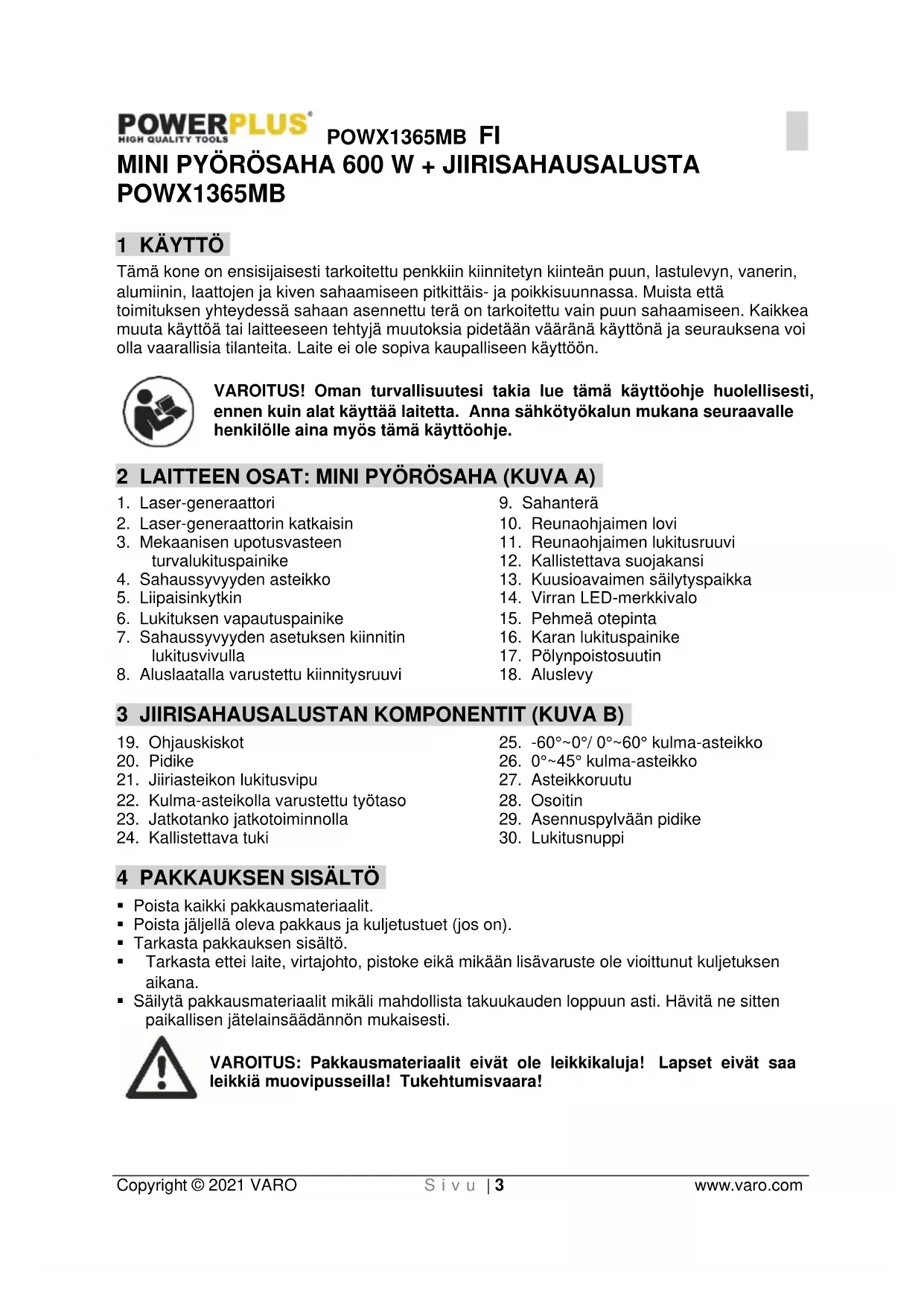 Poista kaikki pakkausmateriaalit. Poista jäljellä oleva pakkaus ja kuljetustuet (jos on). Tarkasta pakkauksen sisältö. Tarkasta ettei laite, virtajohto, pistoke eikä mikään lisävaruste ole vioittunut kuljetuksen aikana. Säilytä pakkausmateriaalit mikäli mahdollista takuukauden loppuun asti. Hävitä ne sitten paikallisen jätelainsäädännön mukaisesti. VAROITUS: Pakkausmateriaalit eivät ole leikkikaluja! Lapset eivät saa leikkiä muovipusseilla! Tukehtumisvaara!POWX1365MB FI Copyright © 2021 VARO S i v u | 4 www.varo.com 1x työkalu 1x ohjekirja 1x sahanterä kovametallihampailla (A): sopiva kohde: pehmeä puu, kovapuu, erityyppiset levyt 1x timantti sahanterä (D): sopiva kohde: keraaminen laatta 1x HSS-sahanterä (E): sopiva kohde: pehmeä metalli, alumiini 1x pölynpoistoletku (B) 1x kuusiokoloavain (F) 1x reunaohjain (G) 1x jiirisahausalusta