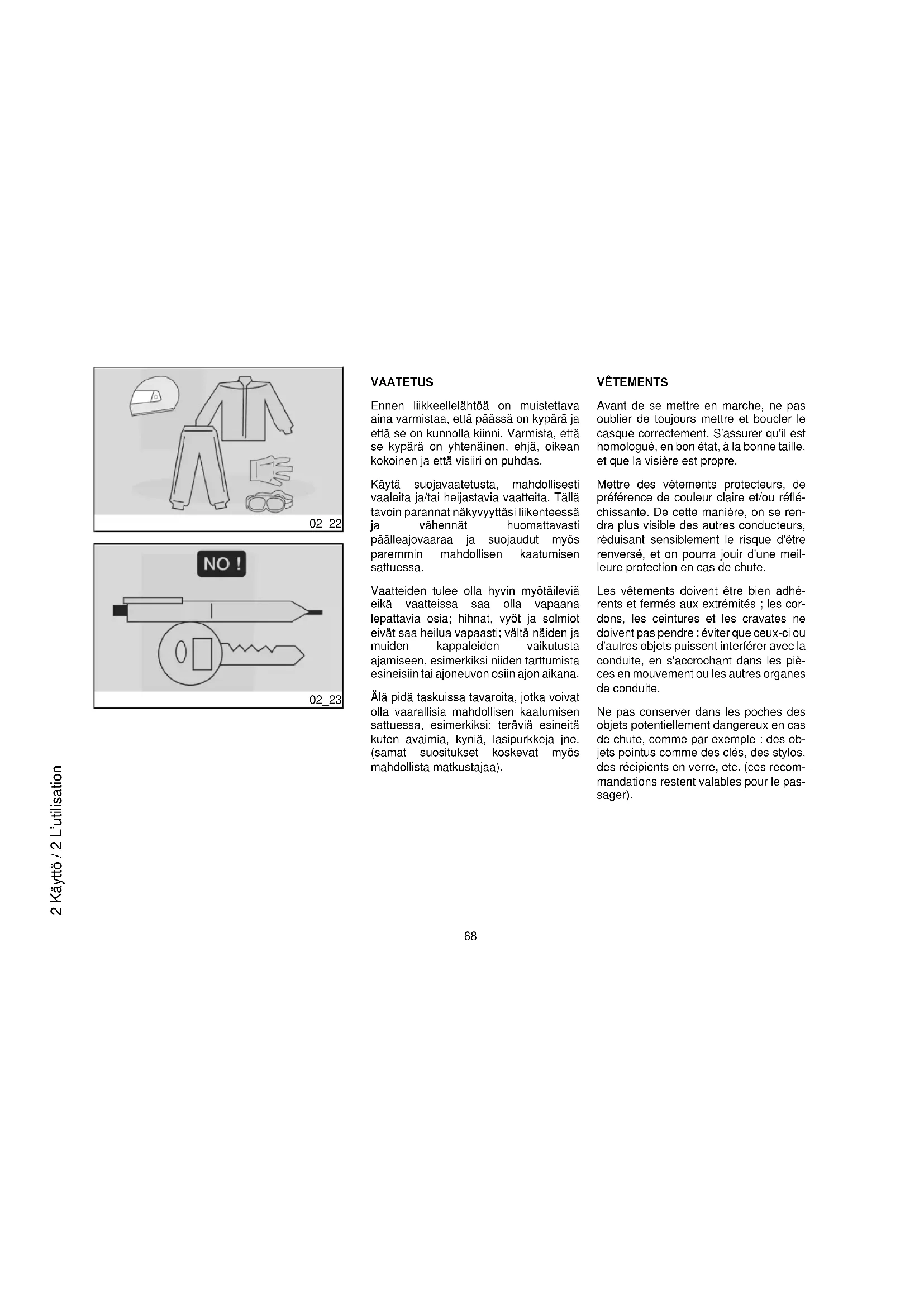 2 Käyttö / 2 L’utilisationMikäli tarpeen, säädä tai kiristä niitä. Polttoainesäiliö Tarkasta polttoaineen määrä ja lisää, mikäli tarpeen. Tarkasta, onko piirissä vuotoja tai tukoksia. Tarkasta, että polttoainesäiliön korkki on suljettu oikein. Jäähdytysneste Jäähdytysnesteen tasaussäiliön nestetaso tulee olla merkkien «MIN» ja «MAX» välillä. Moottorin sammutuskatkaisin Tarkasta oikea toiminta. Valot, merkkivalot, suihkutuksen merkkivalo, äänimerkki ja sähkölaitteet Tarkasta, että äänimerkit sekä näkyvät merkit toimivat oikein. Vaihda vioittuneet lamput. Suihkutuspumppu Tarkasta oikea toiminto. Éléments de fixation Vérifier le bon serrage des éléments de fixation. Le cas échéant, régler ou serrer. Réservoir de carburant Contrôler le niveau et ravitailler, si nécessaire. Contrôler les éventuelles fuites ou occlusions dans le circuit. Contrôler la bonne fermeture du bouchon de carburant. Liquide de refroidissement Le niveau de liquide dans le vase d'expansion doit être compris entre les repères « MIN » et « MAX ». Commutateur d'arrêt moteur Contrôler le bon fonctionnement. Feux, voyants, voyant injection, klaxon et dispositifs électriques Contrôler le fonctionnement correct des dispositifs sonores et visuels. Remplacer les ampoules ou intervenir en cas de panne. Pompe d'injection Contrôler le fonctionnement correct. Täytöt HUOMIO