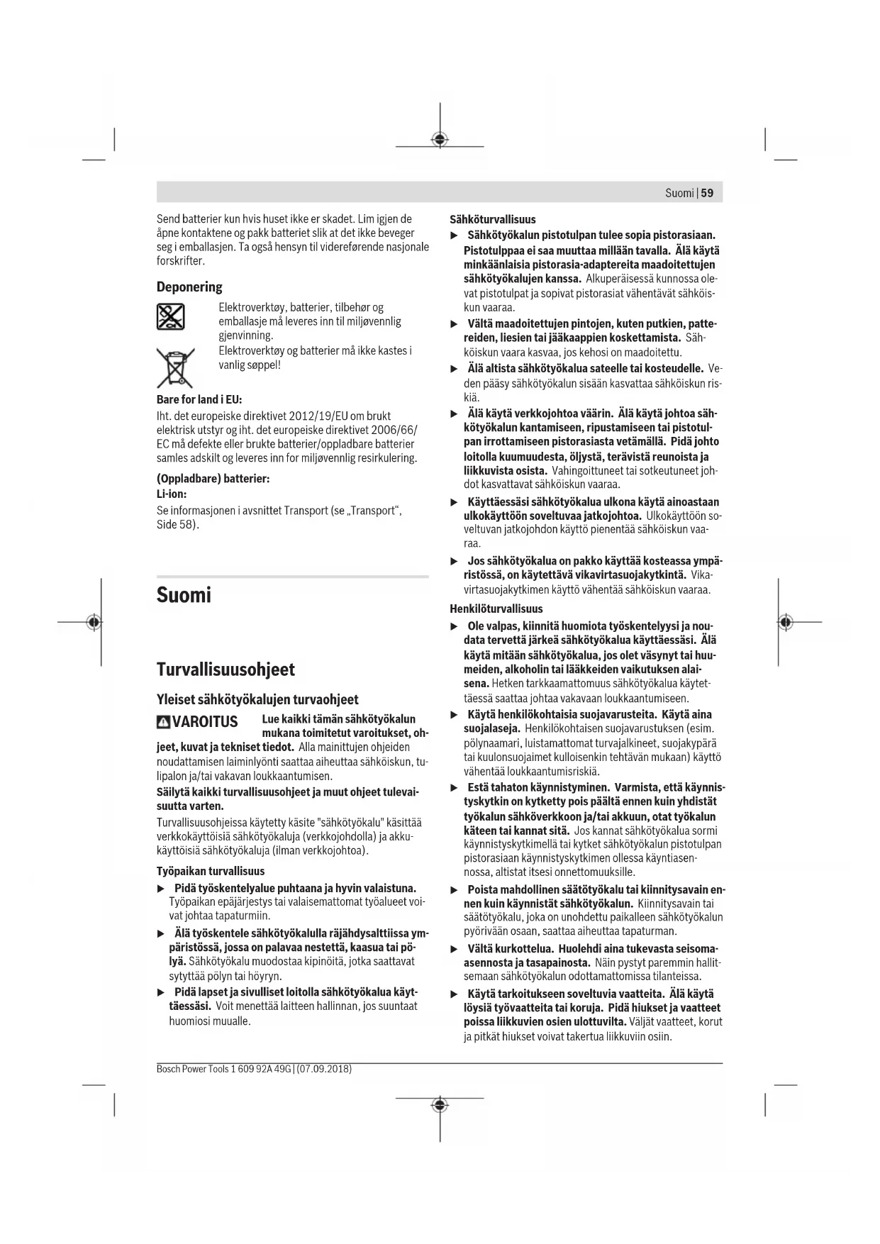 skruelengden. Service og vedlikehold Vedlikehold og rengjøring u Ta alltid batteriet ut av elektroverktøyet før arbeider på elektroverktøyet utføres (f.eks. vedlikehold, verktøyskifte osv.) og før transport og oppbevaring. Det er fare for skader hvis du trykker på av/på-bryteren ved en feiltagelse. u Hold selve elektroverktøyet og ventilasjonsslissene alltid rene, for å kunne arbeide bra og sikkert. Hvis elektroverktøyet til tross for omhyggelige produksjons- og kontrollmetoder en gang skulle svikte, må reparasjonen utføres av et autorisert serviceverksted for Bosch elektroverktøy. Kundeservice og kundeveiledning Kundeservice hjelper deg ved spørsmål om reparasjon og vedlikehold av produktet ditt og reservedelene. Du finner også sprengskisser og informasjon om reservedeler på www.bosch-pt.com Boschs kundeveilederteam hjelper deg gjerne hvis du har spørsmål om våre produkter og tilbehør. Ved alle forespørsler og reservedelsbestillinger må du oppgi det 10‑sifrede produktnummeret som er angitt på produktets typeskilt. Norsk Robert Bosch AS Postboks 350 1402 Ski Tel.: 64 87 89 50 Faks: 64 87 89 55 Transport Li-ion-batteriene i verktøyet underligger kravene for farlig gods. Batteriene kan transporteres på veier av brukeren uten ytterligere krav. Ved forsendelse gjennom tredje personer (f.eks.: lufttransport eller spedisjon) må det oppfylles spesielle krav til emballasje og merking. Du må konsultere en ekspert for farlig gods ved forberedelse av forsendelsen.Send batterier kun hvis huset ikke er skadet. Lim igjen de åpne kontaktene og pakk batteriet slik at det ikke beveger seg i emballasjen. Ta også hensyn til videreførende nasjonale forskrifter. Deponering Elektroverktøy, batterier, tilbehør og emballasje må leveres inn til miljøvennlig gjenvinning. Elektroverktøy og batterier må ikke kastes i vanlig søppel! Bare for land i EU: Iht. det europeiske direktivet 2012/19/EU om brukt elektrisk utstyr og iht. det europeiske direktivet 2006/66/ EC må defekte eller brukte batterier/oppladbare batterier samles adskilt og leveres inn for miljøvennlig resirkulering. (Oppladbare) batterier: Li-ion: Se informasjonen i avsnittet Transport (se „Transport“, Side58). Suomi Turvallisuusohjeet Yleiset sähkötyökalujen turvaohjeet VAROITUS Lue kaikki tämän sähkötyökalun mukana toimitetut varoitukset, oh- jeet, kuvat ja tekniset tiedot. Alla mainittujen ohjeiden noudattamisen laiminlyönti saattaa aiheuttaa sähköiskun, tu- lipalon ja/tai vakavan loukkaantumisen. Säilytä kaikki turvallisuusohjeet ja muut ohjeet tulevai- suutta varten. Turvallisuusohjeissa käytetty käsite "sähkötyökalu" käsittää verkkokäyttöisiä sähkötyökaluja (verkkojohdolla) ja akku- käyttöisiä sähkötyökaluja (ilman verkkojohtoa). Työpaikan turvallisuus u Pidä työskentelyalue puhtaana ja hyvin valaistuna. Työpaikan epäjärjestys tai valaisemattomat työalueet voi- vat johtaa tapaturmiin. u Älä työskentele sähkötyökalulla räjähdysalttiissa ym- päristössä, jossa on palavaa nestettä, kaasua tai pö- lyä. Sähkötyökalu muodostaa kipinöitä, jotka saattavat sytyttää pölyn tai höyryn. u Pidä lapset ja sivulliset loitolla sähkötyökalua käyt- täessäsi. Voit menettää laitteen hallinnan, jos suuntaat huomiosi muualle. Sähköturvallisuus u Sähkötyökalun pistotulpan tulee sopia pistorasiaan. Pistotulppaa ei saa muuttaa millään tavalla. Älä käytä minkäänlaisia pistorasia-adaptereita maadoitettujen sähkötyökalujen kanssa. Alkuperäisessä kunnossa ole- vat pistotulpat ja sopivat pistorasiat vähentävät sähköis- kun vaaraa. u Vältä maadoitettujen pintojen, kuten putkien, patte- reiden, liesien tai jääkaappien koskettamista. Säh- köiskun vaara kasvaa, jos kehosi on maadoitettu. u Älä altista sähkötyökalua sateelle tai kosteudelle. Ve- den pääsy sähkötyökalun sisään kasvattaa sähköiskun ris- kiä. u Älä käytä verkkojohtoa väärin. Älä käytä johtoa säh- kötyökalun kantamiseen, ripustamiseen tai pistotul- pan irrottamiseen pistorasiasta vetämällä. Pidä johto loitolla kuumuudesta, öljystä, terävistä reunoista ja liikkuvista osista. Vahingoittuneet tai sotkeutuneet joh- dot kasvattavat sähköiskun vaaraa. u Käyttäessäsi sähkötyökalua ulkona käytä ainoastaan ulkokäyttöön soveltuvaa jatkojohtoa. Ulkokäyttöön so- veltuvan jatkojohdon käyttö pienentää sähköiskun vaa- raa. u Jos sähkötyökalua on pakko käyttää kosteassa ympä- ristössä, on käytettävä vikavirtasuojakytkintä. Vika- virtasuojakytkimen käyttö vähentää sähköiskun vaaraa. Henkilöturvallisuus u Ole valpas, kiinnitä huomiota työskentelyysi ja nou- data tervettä järkeä sähkötyökalua käyttäessäsi. Älä käytä mitään sähkötyökalua, jos olet väsynyt tai huu- meiden, alkoholin tai lääkkeiden vaikutuksen alai- sena. Hetken tarkkaamattomuus sähkötyökalua käytet- täessä saattaa johtaa vakavaan loukkaantumiseen. u Käytä henkilökohtaisia suojavarusteita. Käytä aina suojalaseja. Henkilökohtaisen suojavarustuksen (esim. pölynaamari, luistamattomat turvajalkineet, suojakypärä tai kuulonsuojaimet kulloisenkin tehtävän mukaan) käyttö vähentää loukkaantumisriskiä. u Estä tahaton käynnistyminen. Varmista, että käynnis- tyskytkin on kytketty pois päältä ennen kuin yhdistät työkalun sähköverkkoon ja/tai akkuun, otat työkalun käteen tai kannat sitä. Jos kannat sähkötyökalua sormi käynnistyskytkimellä tai kytket sähkötyökalun pistotulpan pistorasiaan käynnistyskytkimen ollessa käyntiasen- nossa, altistat itsesi onnettomuuksille. u Poista mahdollinen säätötyökalu tai kiinnitysavain en- nen kuin käynnistät sähkötyökalun. Kiinnitysavain tai säätötyökalu, joka on unohdettu paikalleen sähkötyökalun pyörivään osaan, saattaa aiheuttaa tapaturman. u Vältä kurkottelua. Huolehdi aina tukevasta seisoma- asennosta ja tasapainosta. Näin pystyt parem