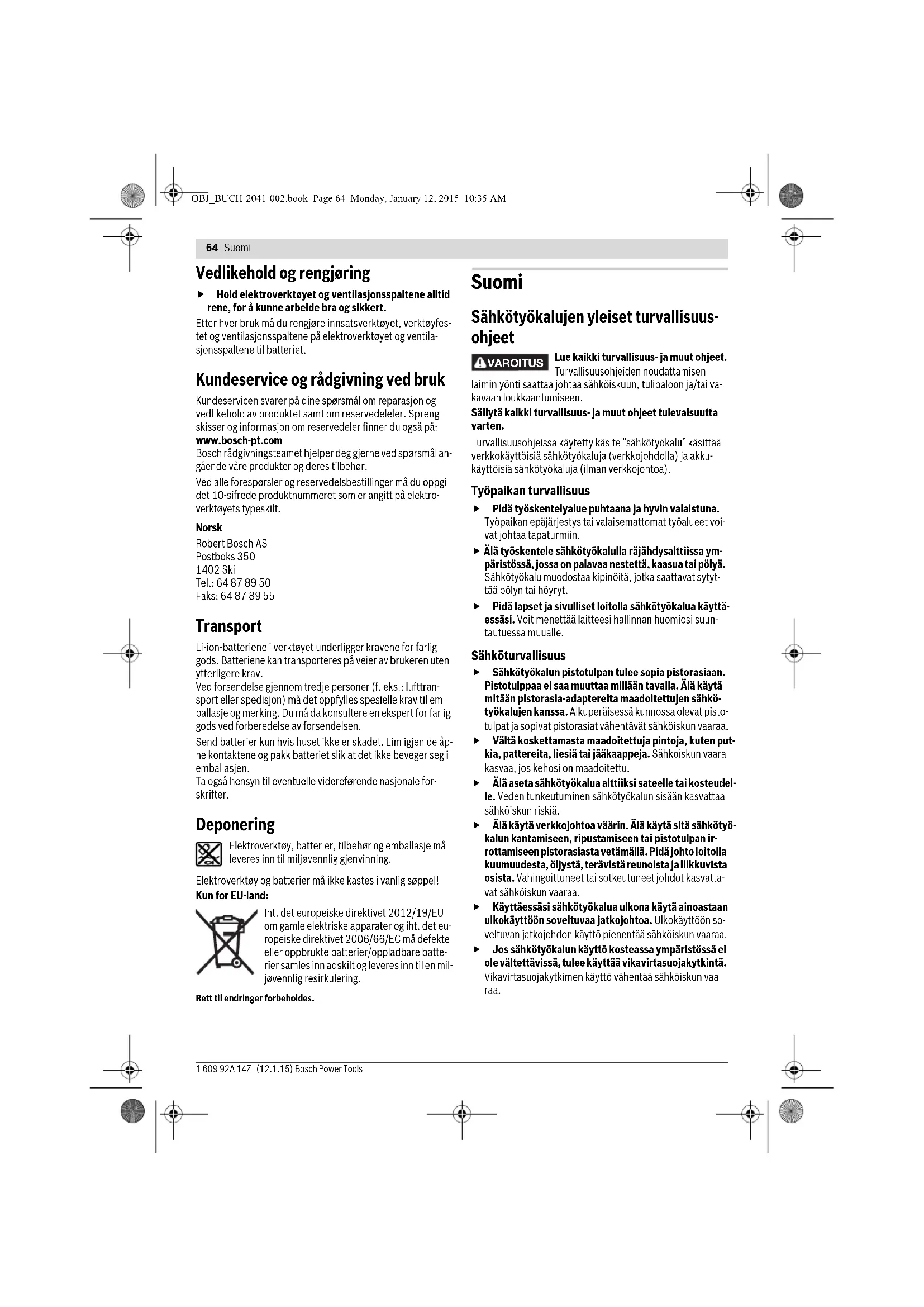 Montere/demontere fargeklemme 12 209 Montere/demontere bitsholder 13 209 Mekanisk girvalg 14 209 Inn-/utkopling 15 210 Kontroll av batteri-ladetilstand 16 210 Valg av tilbehør – 211 – 212 Mål for aktiviteten Bilde Ta da hensyn til Side OBJ_BUCH-2041-002.book Page 63 Monday, January 12, 2015 10:35 AM64 | Suomi 1 609 92A 14Z | (12.1.15) Bosch Power Tools Vedlikehold og rengjøring Hold elektroverktøyet og ventilasjonsspaltene alltid rene, for å kunne arbeide bra og sikkert. Etter hver bruk må du rengjøre innsatsverktøyet, verktøyfes- tet og ventilasjonsspaltene på elektroverktøyet og ventila- sjonsspaltene til batteriet. Kundeservice og rådgivning ved bruk Kundeservicen svarer på dine spørsmål om reparasjon og vedlikehold av produktet samt om reservedeleler. Spreng- skisser og informasjon om reservedeler finner du også på: www.bosch-pt.com Bosch rådgivningsteamet hjelper deg gjerne ved spørsmål an- gående våre produkter og deres tilbehør. Ved alle forespørsler og reservedelsbestillinger må du oppgi det 10-sifrede produktnummeret som er angitt på elektro- verktøyets typeskilt. Norsk Robert Bosch AS Postboks 350 1402 Ski Tel.: 64 87 89 50 Faks: 64 87 89 55 Transport Li-ion-batteriene i verktøyet underligger kravene for farlig gods. Batteriene kan transporteres på veier av brukeren uten ytterligere krav. Ved forsendelse gjennom tredje personer (f. eks.: lufttran- sport eller spedisjon) må det oppfylles spesielle krav til em- ballasje og merking. Du må da konsultere en ekspert for farlig gods ved forberedelse av forsendelsen. Send batterier kun hvis huset ikke er skadet. Lim igjen de åp- ne kontaktene og pakk batteriet slik at det ikke beveger seg i emballasjen. Ta også hensyn til eventuelle videreførende nasjonale for- skrifter. Deponering Elektroverktøy, batterier, tilbehør og emballasje må leveres inn til miljøvennlig gjenvinning. Elektroverktøy og batterier må ikke kastes i vanlig søppel! Kun for EU-land: Iht. det europeiske direktivet 2012/19/EU om gamle elektriske apparater og iht. det eu- ropeiske direktivet 2006/66/EC må defekte eller oppbrukte batterier/oppladbare batte- rier samles inn adskilt og leveres inn til en mil- jøvennlig resirkulering. Rett til endringer forbeholdes. Suomi Sähkötyökalujen yleiset turvallisuus- ohjeet Lue kaikki turvallisuus- ja muut ohjeet. Turvallisuusohjeiden noudattamisen laiminlyönti saattaa johtaa sähköiskuun, tulipaloon ja/tai va- kavaan loukkaantumiseen. Säilytä kaikki turvallisuus- ja muut ohjeet tulevaisuutta varten. Turvallisuusohjeissa käytetty käsite ”sähkötyökalu” käsittää verkkokäyttöisiä sähkötyökaluja (verkkojohdolla) ja akku- käyttöisiä sähkötyökaluja (ilman verkkojohtoa). Työpaikan turvallisuus Pidä työskentelyalue puhtaana ja hyvin valaistuna. Työpaikan epäjärjestys tai valaisemattomat työalueet voi- vat johtaa tapaturmiin. Älä työskentele sähkötyökalulla räjähdysalttiissa ym- päristössä, jossa on palavaa nestettä, kaasua tai pölyä. Sähkötyökalu muodostaa kipinöitä, jotka saattavat sytyt- tää pölyn tai höyryt. Pidä lapset ja sivulliset loitolla sähkötyökalua käyttä- essäsi. Voit menettää laitteesi hallinnan huomiosi suun- tautuessa muualle. Sähköturvallisuus Sähkötyökalun pistotulpan tulee sopia pistorasiaan. Pistotulppaa ei saa muuttaa millään tavalla. Älä käytä mitään pistorasia-adaptereita maadoitettujen sähkö- työkalujen kanssa. Alkuperäisessä kunnossa olevat pisto- tulpat ja sopivat pistorasiat vähentävät sähköiskun vaaraa. Vältä koskettamasta maadoitettuja pintoja, kuten put- kia, pattereita, liesiä tai jääkaappeja. Sähköiskun vaara kasvaa, jos kehosi on maadoitettu. Älä aseta sähkötyökalua alttiiksi sateelle tai kosteudel- le. Veden tunkeutuminen sähkötyökalun sisään kasvattaa sähköiskun riskiä. Älä käytä verkkojohtoa väärin. Älä käytä sitä sähkötyö- kalun kantamiseen, ripustamiseen tai pistotulpan ir- rottamiseen pistorasiasta vetämällä. Pidä johto loitolla kuumuudesta, öljystä, terävistä reunoista ja liikkuvista osista. Vahingoittuneet tai sotkeutuneet johdot kasvatta- vat sähköiskun vaaraa. Käyttäessäsi sähkötyökalua ulkona käytä ainoastaan ulkokäyttöön soveltuvaa jatkojohtoa. Ulkokäyttöön so- veltuvan jatkojohdon käyttö pienentää sähköiskun vaaraa. Jos sähkötyökalun käyttö kosteassa ympäristössä ei ole vältettävissä, tulee käyttää vikavirtasuojakytkintä. Vikavirtasuojakytkimen käyttö vähentää sähköiskun vaa- raa. VAROITUS OBJ_BUCH-2041-002.book Page 64 Monday, January 12, 2015 10:35 AMSuomi | 65 Bosch Power Tools 1 609 92A 14Z | (12.1.15) Henkilöturvallisuus Ole valpas, kiinnitä huomiota työskentelyysi ja nouda- ta tervettä järkeä sähkötyökalua käyttäessäsi. Älä käy- tä mitään sähkötyökalua, jos olet väsynyt tai huumei- den, alkoholin tahi lääkkeiden vaikutuksen alaisena. Hetken tarkkaamattomuus sähkötyökalua käytettäessä saattaa johtaa vakavaan loukkaantumiseen. Käytä suojavarusteita. Käytä aina suojalaseja. Henkilö- kohtaisen suojavarustuksen käyttö, kuten pölynaamarin, luistamattomien turvakenkien, suojakypärän tai kuulon- suojaimien, riippuen sähkötyökalun lajista ja käyttötavas- ta, vähentää loukkaantumisriskiä. Vältä tahatonta käynnistämistä. Varmista, että sähkö- työkalu on poiskytkettynä, ennen kuin liität sen sähkö- verkkoon ja/tai liität akun, otat sen käteen tai kannat sitä. Jos kannat sähkötyökalua sormi käynnistyskytkimellä tai kytket sähkötyökalun pistotulpan pistorasiaan käyn- nistyskytkimen ollessa käyntiasennossa, altistat itsesi on- nettomuuksille. Poista kaikki säätötyökalut ja ruuvitaltat, ennen kuin käynnistät sähkötyökalun. Työkalu tai avain, joka sijait- see laitteen pyörivässä osassa, saattaa johtaa loukkaantu- miseen. Vältä epänormaalia kehon asentoa. Huolehdi aina tuke- vasta seisoma-asennost