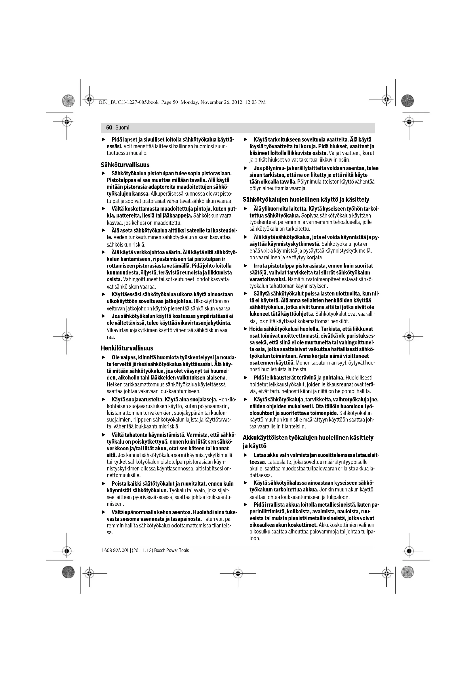 Valg av tilbehør – 147 VAROITUS OBJ_BUCH-1227-005.book Page 49 Monday, November 26, 2012 12:03 PM50 | Suomi 1 609 92A 00L | (26.11.12) Bosch Power Tools Pidä lapset ja sivulliset loitolla sähkötyökalua käyttä- essäsi. Voit menettää laitteesi hallinnan huomiosi suun- tautuessa muualle. Sähköturvallisuus Sähkötyökalun pistotulpan tulee sopia pistorasiaan. Pistotulppaa ei saa muuttaa millään tavalla. Älä käytä mitään pistorasia-adaptereita maadoitettujen sähkö- työkalujen kanssa. Alkuperäisessä kunnossa olevat pisto- tulpat ja sopivat pistorasiat vähentävät sähköiskun vaaraa. Vältä koskettamasta maadoitettuja pintoja, kuten put- kia, pattereita, liesiä tai jääkaappeja. Sähköiskun vaara kasvaa, jos kehosi on maadoitettu. Älä aseta sähkötyökalua alttiiksi sateelle tai kosteudel- le. Veden tunkeutuminen sähkötyökalun sisään kasvattaa sähköiskun riskiä. Älä käytä verkkojohtoa väärin. Älä käytä sitä sähkötyö- kalun kantamiseen, ripustamiseen tai pistotulpan ir- rottamiseen pistorasiasta vetämällä. Pidä johto loitolla kuumuudesta, öljystä, terävistä reunoista ja liikkuvista osista. Vahingoittuneet tai sotkeutuneet johdot kasvatta- vat sähköiskun vaaraa. Käyttäessäsi sähkötyökalua ulkona käytä ainoastaan ulkokäyttöön soveltuvaa jatkojohtoa. Ulkokäyttöön so- veltuvan jatkojohdon käyttö pienentää sähköiskun vaaraa. Jos sähkötyökalun käyttö kosteassa ympäristössä ei ole vältettävissä, tulee käyttää vikavirtasuojakytkintä. Vikavirtasuojakytkimen käyttö vähentää sähköiskun vaa- raa. Henkilöturvallisuus Ole valpas, kiinnitä huomiota työskentelyysi ja nouda- ta tervettä järkeä sähkötyökalua käyttäessäsi. Älä käy- tä mitään sähkötyökalua, jos olet väsynyt tai huumei- den, alkoholin tahi lääkkeiden vaikutuksen alaisena. Hetken tarkkaamattomuus sähkötyökalua käytettäessä saattaa johtaa vakavaan loukkaantumiseen. Käytä suojavarusteita. Käytä aina suojalaseja. Henkilö- kohtaisen suojavarustuksen käyttö, kuten pölynaamarin, luistamattomien turvakenkien, suojakypärän tai kuulon- suojaimien, riippuen sähkötyökalun lajista ja käyttötavas- ta, vähentää loukkaantumisriskiä. Vältä tahatonta käynnistämistä. Varmista, että sähkö- työkalu on poiskytkettynä, ennen kuin liität sen sähkö- verkkoon ja/tai liität akun, otat sen käteen tai kannat sitä. Jos kannat sähkötyökalua sormi käynnistyskytkimellä tai kytket sähkötyökalun pistotulpan pistorasiaan käyn- nistyskytkimen ollessa käyntiasennossa, altistat itsesi on- nettomuuksille. Poista kaikki säätötyökalut ja ruuvitaltat, ennen kuin käynnistät sähkötyökalun. Työkalu tai avain, joka sijait- see laitteen pyörivässä osassa, saattaa johtaa loukkaantu- miseen. Vältä epänormaalia kehon asentoa. Huolehdi aina tuke- vasta seisoma-asennosta ja tasapainosta. Täten voit pa- remmin hallita sähkötyökalua odottamattomissa tilanteis- sa. Käytä tarkoitukseen soveltuvia vaatteita. Älä käytä löysiä työvaatteita tai koruja. Pidä hiukset, vaatteet ja käsineet loitolla liikkuvista osista. Väljät vaatteet, korut ja pitkät hiukset voivat takertua liikkuviin osiin. Jos pölynimu- ja keräilylaitteita voidaan asentaa, tulee sinun tarkistaa, että ne on liitetty ja että niitä käyte- tään oikealla tavalla. Pölynimulaitteiston käyttö vähentää pölyn aiheuttamia vaaroja. Sähkötyökalujen huolellinen käyttö ja käsittely Älä ylikuormita laitetta. Käytä kyseiseen työhön tarkoi- tettua sähkötyökalua. Sopivaa sähkötyökalua käyttäen työskentelet paremmin ja varmemmin tehoalueella, jolle sähkötyökalu on tarkoitettu. Älä käytä sähkötyökalua, jota ei voida käynnistää ja py- säyttää käynnistyskytkimestä. Sähkötyökalu, jota ei enää voida käynnistää ja pysäyttää käynnistyskytkimellä, on vaarallinen ja se täytyy korjata. Irrota pistotulppa pistorasiasta, ennen kuin suoritat säätöjä, vaihdat tarvikkeita tai siirrät sähkötyökalun varastoitavaksi. Nämä turvatoimenpiteet estävät sähkö- työkalun tahattoman käynnistyksen. Säilytä sähkötyökalut poissa lasten ulottuvilta, kun nii- tä ei käytetä. Älä anna sellaisten henkilöiden käyttää sähkötyökalua, jotka eivät tunne sitä tai jotka eivät ole lukeneet tätä käyttöohjetta. Sähkötyökalut ovat vaaralli- sia, jos niitä käyttävät kokemattomat henkilöt. Hoida sähkötyökalusi huolella. Tarkista, että liikkuvat osat toimivat moitteettomasti, eivätkä ole puristukses- sa sekä, että siinä ei ole murtuneita tai vahingoittunei- ta osia, jotka saattaisivat vaikuttaa haitallisesti sähkö- työkalun toimintaan. Anna korjata nämä vioittuneet osat ennen käyttöä. Monen tapaturman syyt löytyvät huo- nosti huolletuista laitteista. Pidä leikkausterät terävinä ja puhtaina. Huolellisesti hoidetut leikkaustyökalut, joiden leikkausreunat ovat terä- viä, eivät tartu helposti kiinni ja niitä on helpompi hallita. Käytä sähkötyökaluja, tarvikkeita, vaihtotyökaluja jne. näiden ohjeiden mukaisesti. Ota tällöin huomioon työ- olosuhteet ja suoritettava toimenpide. Sähkötyökalun käyttö muuhun kuin sille määrättyyn käyttöön saattaa joh- taa vaarallisiin tilanteisiin. Akkukäyttöisten työkalujen huolellinen käsittely ja käyttö Lataa akku vain valmistajan suosittelemassa latauslait- teessa. Latauslaite, joka soveltuu määrätyntyyppiselle akulle, saattaa muodostaa tulipalovaaran erilaista akkua la- dattaessa. Käytä sähkötyökalussa ainoastaan kyseiseen sähkö- työkaluun tarkoitettua akkua. Jonkin muun akun käyttö saattaa johtaa loukkaantumiseen ja tulipaloon. Pidä irrallista akkua loitolla metalliesineistä, kuten pa- perinliittimistä, kolikoista, avaimista, nauloista, ruu- veista tai muista pienistä metalliesineistä, jotka voivat oikosulkea akun koskettimet. Akkukoskettimien välinen oikosulku saattaa aiheuttaa