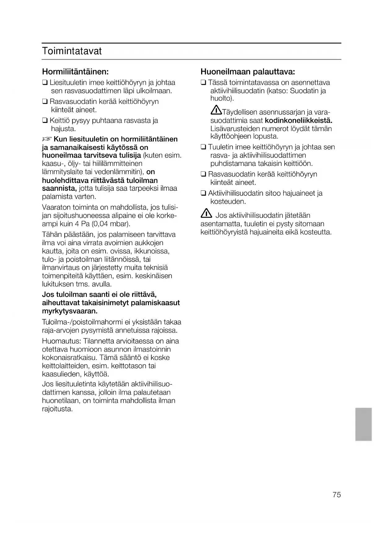 Kun liesituuletin on hormiliitäntäinen ja samanaikaisesti käytössä on huoneilmaa tarvitseva tulisija (kuten esim. kaasu-, öljy- tai hiililämmitteinen lämmityslaite tai vedenlämmitin), on huolehdittava riittävästä tuloilman saannista, jotta tulisija saa tarpeeksi ilmaa palamista varten. Vaaraton toiminta on mahdollista, jos tulisi- jan sijoitushuoneessa alipaine ei ole korke- ampi kuin 4 Pa (0,04 mbar). Tähän päästään, jos palamiseen tarvittava ilma voi aina virrata avoimien aukkojen kautta, joita on esim. ovissa, ikkunoissa, tulo- ja poistoilman liitännöissä, tai ilmanvirtaus on järjestetty muita teknisiä toimenpiteitä käyttäen, esim. keskinäisen lukituksen tms. avulla. Jos tuloilman saanti ei ole riittävä, aiheuttavat takaisinimetyt palamiskaasut myrkytysvaaran. Tuloilma-/poistoilmahormi ei yksistään takaa raja-arvojen pysymistä annetuissa rajoissa. Huomautus: Tilannetta arvioitaessa on aina otettava huomioon asunnon ilmastoinnin kokonaisratkaisu. Tämä sääntö ei koske keittolaitteiden, esim. keittotason tai kaasulieden, käyttöä. Jos liesituuletinta käytetään aktiivihiilisuo- dattimen kanssa, jolloin ilma palautetaan huonetilaan, on toiminta mahdollista ilman rajoitusta. Huoneilmaan palauttava: ❑ Tässä toimintatavassa on asennettava aktiivihiilisuodatin (katso: Suodatin ja huolto). Täydellisen asennussarjan ja vara- suodattimia saat kodinkoneliikkeistä. Lisävarusteiden numerot löydät tämän käyttöohjeen lopusta. ❑ Tuuletin imee keittiöhöyryn ja johtaa sen rasva- ja aktiivihiilisuodattimen puhdistamana takaisin keittiöön. ❑ Rasvasuodatin kerää keittiöhöyryn kiinteät aineet. ❑ Aktiivihiilisuodatin sitoo hajuaineet ja kosteuden. Jos aktiivihiilisuodatin jätetään asentamatta, tuuletin ei pysty sitomaan keittiöhöyryistä hajuaineita eikä kosteutta.76 Ennen ensimmäistä käyttöä Tärkeitä ohjeita: ❑ Tämä käyttöohje on tarkoitettu eri mallille. Tästä johtuen on mahdollista, että kaikki tässä kuvatut ominaisuudet ja varusteet eivät koske hankkimaasi laitetta. ❑ Tämä liesituuletin vastaa sähkölaitteita koskevia turvallisuusohjeita. Korjauksia saa suorittaa vain alan ammattimies. Ammattitaidottomasti tehdyt korjaukset voivat aiheuttaa laitteen käyttäjälle suuria vaaroja. ❑ Lue huolellisesti käyttöohjeet, ennen kuin käytät uutta laitetta. Niissä on tärkeää turvallisuuteen ja käyttöön liittyvää tietoa sekä laitteen hoito-ohjeita. ❑ Säilytä hyvin käyttö- ja asennusohjeet, jotta laitteen mahdollinen uusi omistaja voi tutustua niihin. Kaasulla toimivat keittotasot / liedet Paloturvallisuuden ja palovammojen ehkäisemisen vuoksi älä käytä kaikkia kaasulla toimivia keittoalueita samanaikaisesti maksimiteholla pidemmän aikaa (max. 15 minuuttia). Kun liesituuletin on asennettu kaasulla toimivan keittotason yläpuolelle, kytke liesituuletin maksimiteholle, jos käytät samanaikaisesti vähintään kolmea kaasulla toimivaa keittoaluetta. ❑ Tämän laitteen merkintä perustuu käytettyjä sähkö- ja elektroniikkalaitteita (waste electrical and electronic equipment – WEEE) koskevaan direktiiviin 2002/96/EG. Tämä direktiivi määrittää käytettyjen laitteiden palautus- ja kierrätys-säännökset koko EU:n alueella.