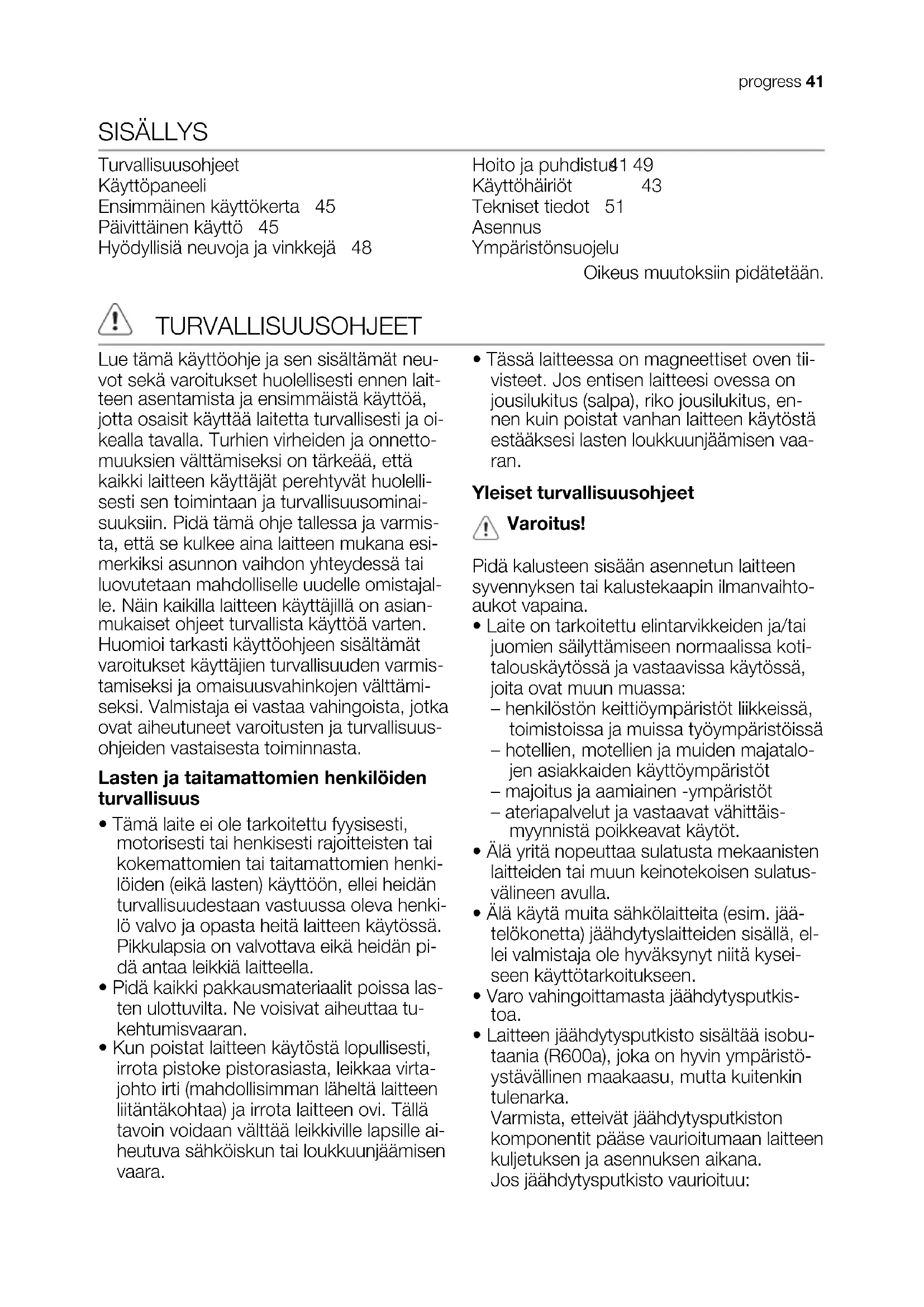 Seadme taga tuleb tagada piisav õhuring- lus. KESKKONNAINFO Sümboliga tähistatud materjalid võib ringlusse suunata. Selleks viige pakendid vastavatesse konteineritesse Aidake hoida keskkonda ja inimeste tervist ja suunake elektri- ja elektroonilised jäätmed ringlusse. Ärge visake sümboliga tähistatud seadmeid muude majapidamisjäätmete hulka. Viige seade kohalikku ringluspunkti või pöörduge abi saamiseks kohalikku omavalitsusse. 40 progressSISÄLLYS Turvallisuusohjeet 41 Käyttöpaneeli 43 Ensimmäinen käyttökerta 45 Päivittäinen käyttö 45 Hyödyllisiä neuvoja ja vinkkejä 48 Hoito ja puhdistus 49 Käyttöhäiriöt 50 Tekniset tiedot 51 Asennus 52 Ympäristönsuojelu 52 Oikeus muutoksiin pidätetään. TURVALLISUUSOHJEET Lue tämä käyttöohje ja sen sisältämät neu- vot sekä varoitukset huolellisesti ennen lait- teen asentamista ja ensimmäistä käyttöä, jotta osaisit käyttää laitetta turvallisesti ja oi- kealla tavalla. Turhien virheiden ja onnetto- muuksien välttämiseksi on tärkeää, että kaikki laitteen käyttäjät perehtyvät huolelli- sesti sen toimintaan ja turvallisuusominai- suuksiin. Pidä tämä ohje tallessa ja varmis- ta, että se kulkee aina laitteen mukana esi- merkiksi asunnon vaihdon yhteydessä tai luovutetaan mahdolliselle uudelle omistajal- le. Näin kaikilla laitteen käyttäjillä on asian- mukaiset ohjeet turvallista käyttöä varten. Huomioi tarkasti käyttöohjeen sisältämät varoitukset käyttäjien turvallisuuden varmis- tamiseksi ja omaisuusvahinkojen välttämi- seksi. Valmistaja ei vastaa vahingoista, jotka ovat aiheutuneet varoitusten ja turvallisuus- ohjeiden vastaisesta toiminnasta. Lasten ja taitamattomien henkilöiden turvallisuus