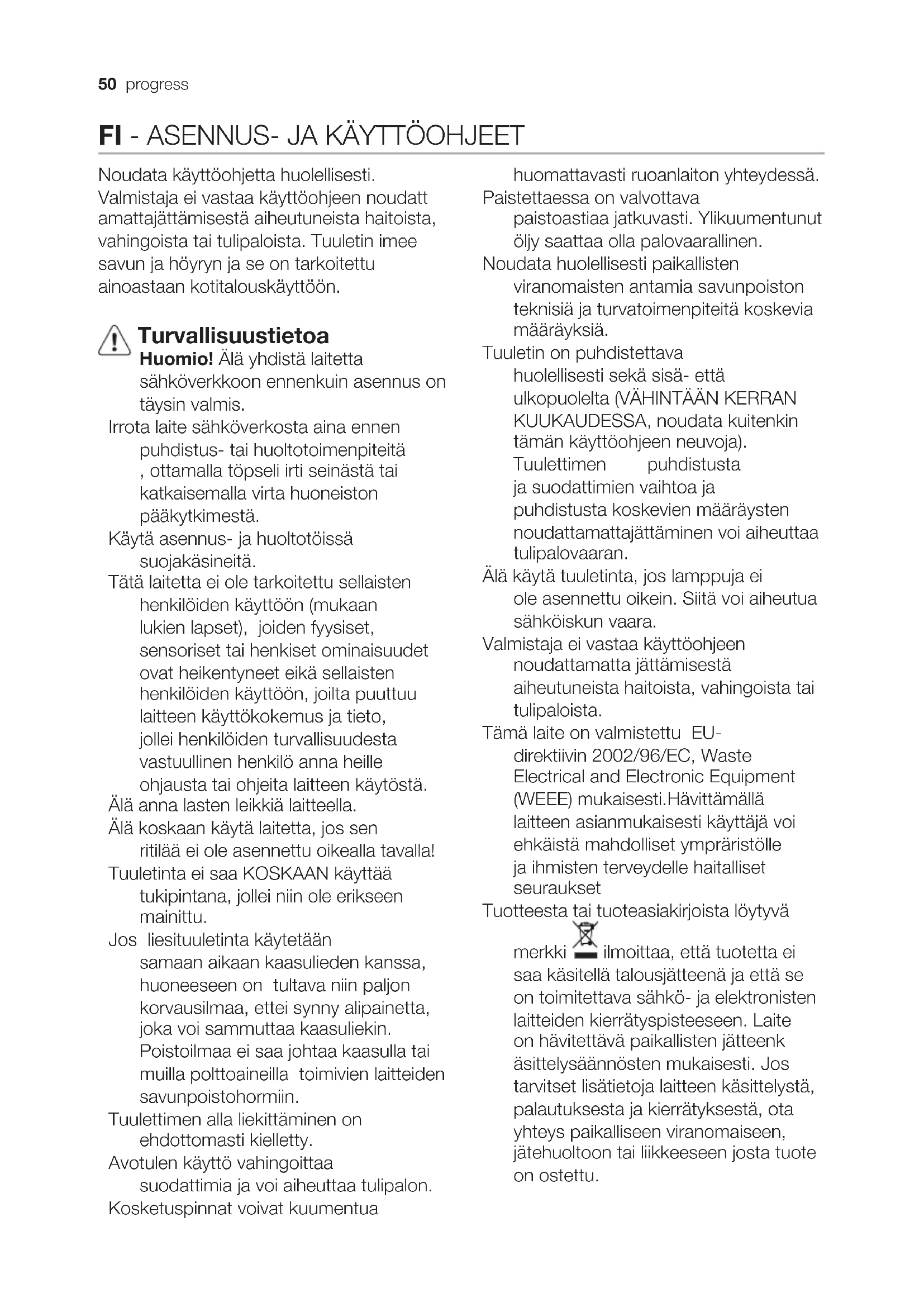 (4.), maksimal (5.). Bruk største hastighet ved høy dampkonsentrasjon på kjøkkenet. Vi anbefaler å slå på viften 5 minutter før du begynner å lage mat, og la den fortsette å virke i enda cirka 15 minutter etter du er ferdig med matlagingen. Vedlikehold Advarsel! Før enhver form for rengjøring eller vedlikehold må ventilatorhetten frakobles strømnettet ved å dra ut ledningen eller slå av husets hovedstrømbryter. Ventilatoren må rengjøres jevnlig, både innvendig og utvendig (minst så ofte som man utfører vedlikehold av fettfi ltrene). Til rengjøring benyttes en klut fuktet med et nøytralt rengjøringsmiddel. Unngå bruk av slipende eller etsende produkter. Advarsel: Hvis ikke reglene for rengjøring og utskifting av filtrene følges, kan det føre til brann. Det er derfor meget viktig å følge denne bruksanvisningen nøye. Produsenten fraskriver seg ethvert ansvar for eventuelle skader på motoren, brannprogress 49 som skyldes manglende vedlikehold eller andre skader som skyldes at instruksene over ikke er blitt fulgt. Fettfi lteret Fig. 1-17 Fettfi lteret må rengjøres en gang i måneden uten bruk av aggressive rengjøringsmidler, for hånd eller i oppvaskmaskin ved lav temperatur og med kort syklus. Ved vask i oppvaskmaskin kan fettfi lteret i metall miste fargen, men dets fi lterkarakteristikker endres absolutt ikke. Kullfi lter (kun med resirkulering av luften) Fig. 16 Type 20 LONG LIFE - Vaskbart aktivt kullfi lter Karbonfi lteret kan vaskes annenhver måned i varmt vann og med egnede rengjøringsmidler, eller i oppvaskmaskin ved 65°C (hvis man vasker det i oppvaskmaskin må det vaskes med full syklus uten annen oppvask i maskinen). Ta vekk overfl ødig vann uten å ødelegge fi lteret, ta deretter ut ”madrassen” inne i plastikkdekselet og sett den i stekeovnen ved 100°C i 10 minutter for å tørke den ordentlig. Skift ut ”madrassen” hvert 3. år og ellers hver gang stoffet er skadet. Type 15 - IKKE vaskbart aktivt kullfi lter Kullfi lteret må skiftes ut hver 4. måned ved middels bruk av ventilatoren, og oftere hvis ventilatoren brukes mye. Det kan IKKE vaskes eller benyttes om igjen Utskifting av lyspærer Fig. 18 Koble ventilatoren fra strømnettet. Merk! Forsikre deg om at lyspæren er kald før du tar i den. Bruk bare halogene lyspærer på maks 12V -20W - G4, og pass på å ikke røre dem med hendene.50 progress FI - ASENNUS- JA KÄYTTÖOHJEET Noudata käyttöohjetta huolellisesti. Valmistaja ei vastaa käyttöohjeen noudatt amattajättämisestä aiheutuneista haitoista, vahingoista tai tulipaloista. Tuuletin imee savun ja höyryn ja se on tarkoitettu ainoastaan kotitalouskäyttöön. Turvallisuustietoa Huomio! Älä yhdistä laitetta sähköverkkoon ennenkuin asennus on täysin valmis. Irrota laite sähköverkosta aina ennen puhdistus- tai huoltotoimenpiteitä , ottamalla töpseli irti seinästä tai katkaisemalla virta huoneiston pääkytkimestä. Käytä asennus- ja huoltotöissä suojakäsineitä. Tätä laitetta ei ole tarkoitettu sellaisten henkilöiden käyttöön (mukaan lukien lapset), joiden fyysiset, sensoriset tai henkiset ominaisuudet ovat heikentyneet eikä sellaisten henkilöiden käyttöön, joilta puuttuu laitteen käyttökokemus ja tieto, jollei henkilöiden turvallisuudesta vastuullinen henkilö anna heille ohjausta tai ohjeita laitteen käytöstä. Älä anna lasten leikkiä laitteella. Älä koskaan käytä laitetta, jos sen ritilää ei ole asennettu oikealla tavalla! Tuuletinta ei saa KOSKAAN käyttää tukipintana, jollei niin ole erikseen mainittu. Jos liesituuletinta käytetään samaan aikaan kaasulieden kanssa, huoneeseen on tultava niin paljon korvausilmaa, ettei synny alipainetta, joka voi sammuttaa kaasuliekin. Poistoilmaa ei saa johtaa kaasulla tai muilla polttoaineilla toimivien laitteiden savunpoistohormiin. Tuulettimen alla liekittäminen on ehdottomasti kielletty. Avotulen käyttö vahingoittaa suodattimia ja voi aiheuttaa tulipalon. Kosketuspinnat voivat kuumentua huomattavasti ruoanlaiton yhteydessä. Paistettaessa on valvottava paistoastiaa jatkuvasti. Ylikuumentunut öljy saattaa olla palovaarallinen. Noudata huolellisesti paikallisten viranomaisten antamia savunpoiston teknisiä ja turvatoimenpiteitä koskevia määräyksiä. Tuuletin on puhdistettava huolellisesti sekä sisä- että ulkopuolelta (VÄHINTÄÄN KERRAN KUUKAUDESSA, noudata kuitenkin tämän käyttöohjeen neuvoja). Tuulettimen puhdistusta ja suodattimien vaihtoa ja puhdistusta koskevien määräysten noudattamattajättäminen voi aiheuttaa tulipalovaaran. Älä käytä tuuletinta, jos lamppuja ei ole asennettu oikein. Siitä voi aiheutua sähköiskun vaara. Valmistaja ei vastaa käyttöohjeen noudattamatta jättämisestä aiheutuneista haitoista, vahingoista tai tulipaloista. Tämä laite on valmistettu EU- direktiivin 2002/96/EC, Waste Electrical and Electronic Equipment (WEEE) mukaisesti.Hävittämällä laitteen asianmukaisesti käyttäjä voi ehkäistä mahdolliset ympräristölle ja ihmisten terveydelle haitalliset seuraukset Tuotteesta tai tuoteasiakirjoista löytyvä merkki ilmoittaa, että tuotetta ei saa käsitellä talousjätteenä ja että se on toimitettava sähkö- ja elektronisten laitteiden kierrätyspisteeseen. Laite on hävitettävä paikallisten jätteenk äsittelysäännösten mukaisesti. Jos tarvitset lisätietoja laitteen käsittelystä, palautuksesta ja kierrätyksestä, ota yhteys paikalliseen viranomaiseen, jätehuoltoon tai liikkeeseen josta tuote on ostettu.progress 51 Käyttö Tuuletin on tarkoitettu käytettäväksi joko imukupuversiona ulkoisella poistolla tai suodatinversiona sisäiseen kiertoon. Asennus Hyvin painava tuote, liesituulettimen siirtäminen ja asennus vaatii ainakin kaksi henkilöä. Lieden keittotason tukipinnan ja keittiötuulettimen alimman osan välinen minimietäisyys on oltava vähintään 50cm sähköliesien osalta ja 65cm kaasu- ja sekaliesien osalta. Jos kaasulieden käyttöohjeissa va