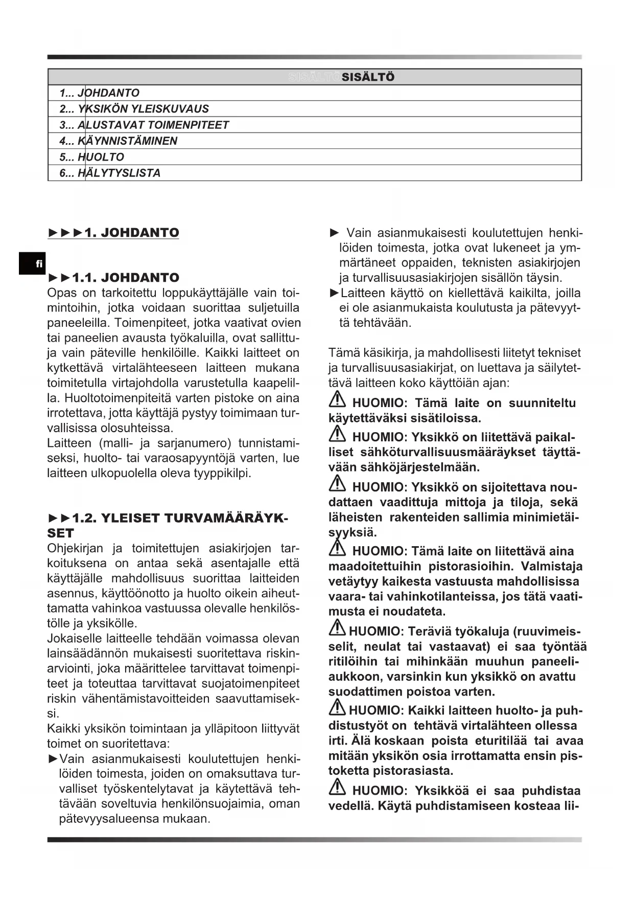 SET Ohjekirjan ja toimitettujen asiakirjojen tar- koituksena on antaa sekä asentajalle että käyttäjälle mahdollisuus suorittaa laitteiden asennus, käyttöönotto ja huolto oikein aiheut- tamatta vahinkoa vastuussa olevalle henkilös- tölle ja yksikölle. Jokaiselle laitteelle tehdään voimassa olevan lainsäädännön mukaisesti suoritettava riskin- arviointi, joka määrittelee tarvittavat toimenpi- teet ja toteuttaa tarvittavat suojatoimenpiteet riskin vähentämistavoitteiden saavuttamisek- si. Kaikki yksikön toimintaan ja ylläpitoon liittyvät toimet on suoritettava: ►Vain asianmukaisesti koulutettujen henki- löiden toimesta, joiden on omaksuttava tur- valliset työskentelytavat ja käytettävä teh- tävään soveltuvia henkilönsuojaimia, oman pätevyysalueensa mukaan. ► Vain asianmukaisesti koulutettujen henki- löiden toimesta, jotka ovat lukeneet ja ym- märtäneet oppaiden, teknisten asiakirjojen ja turvallisuusasiakirjojen sisällön täysin. ►Laitteen käyttö on kiellettävä kaikilta, joilla ei ole asianmukaista koulutusta ja pätevyyt- tä tehtävään. Tämä käsikirja, ja mahdollisesti liitetyt tekniset ja turvallisuusasiakirjat, on luettava ja säilytet- tävä laitteen koko käyttöiän ajan: HUOMIO: Tämä laite on suunniteltu käytettäväksi sisätiloissa. HUOMIO: Yksikkö on liitettävä paikal- liset sähköturvallisuusmääräykset täyttä- vään sähköjärjestelmään. HUOMIO: Yksikkö on sijoitettava nou- dattaen vaadittuja mittoja ja tiloja, sekä läheisten rakenteiden sallimia minimietäi- syyksiä. HUOMIO: Tämä laite on liitettävä aina maadoitettuihin pistorasioihin. Valmistaja vetäytyy kaikesta vastuusta mahdollisissa vaara- tai vahinkotilanteissa, jos tätä vaati- musta ei noudateta. HUOMIO: Teräviä työkaluja (ruuvimeis- selit, neulat tai vastaavat) ei saa työntää ritilöihin tai mihinkään muuhun paneeli- aukkoon, varsinkin kun yksikkö on avattu suodattimen poistoa varten. HUOMIO: Kaikki laitteen huolto- ja puh- distustyöt on tehtävä virtalähteen ollessa irti. Älä koskaan poista eturitilää tai avaa mitään yksikön osia irrottamatta ensin pis- toketta pistorasiasta. HUOMIO: Yksikköä ei saa puhdistaa vedellä. Käytä puhdistamiseen kosteaa lii-en