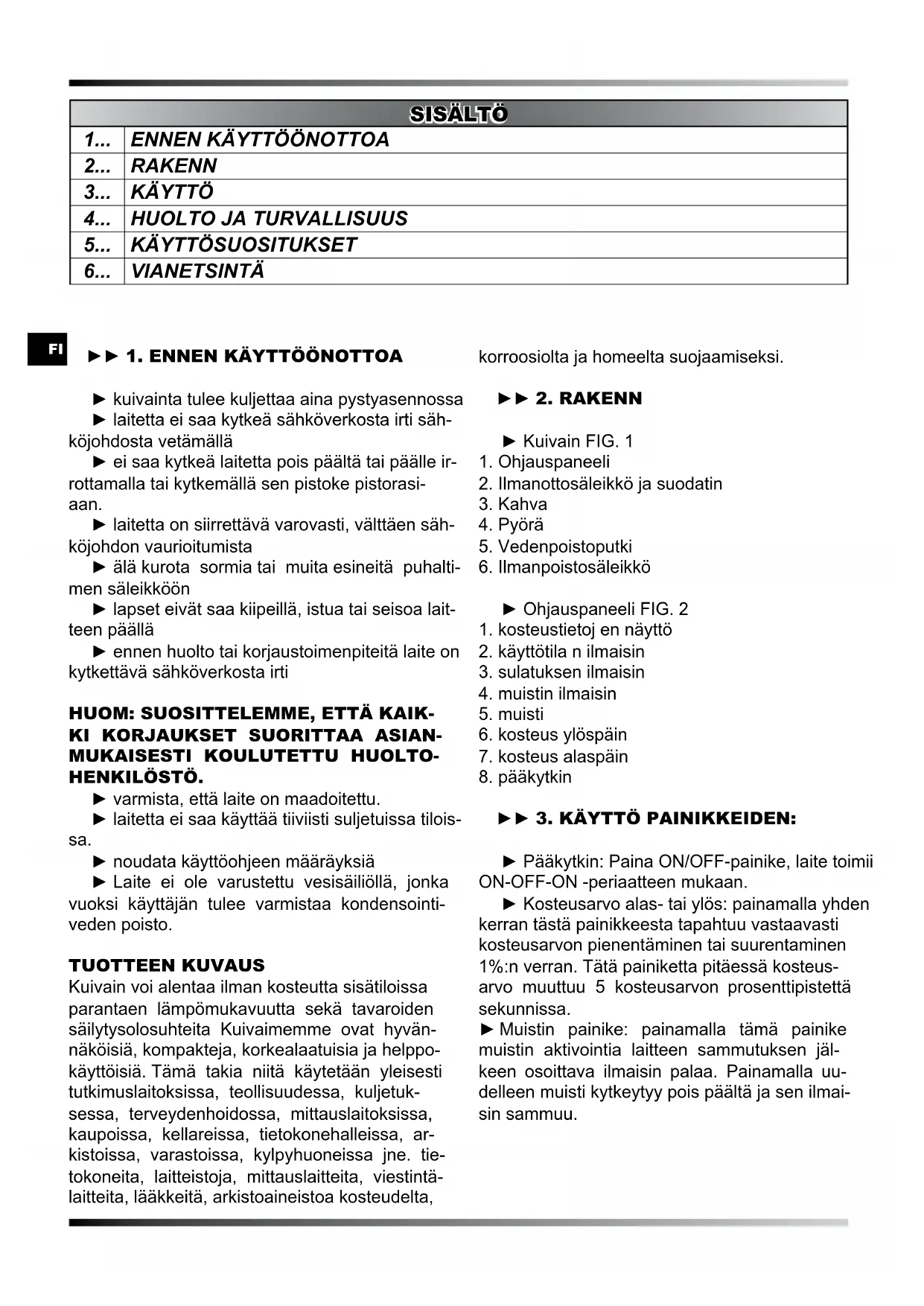 ► 1. ENNEN KäYTTööNOTTOA ► kuivainta tulee kuljettaa aina pystyasennossa ► laitetta ei saa kytkeä sähköverkosta irti säh- köjohdosta vetämällä ► ei saa kytkeä laitetta pois päältä tai päälle ir- rottamalla tai kytkemällä sen pistoke pistorasi- aan. ► laitetta on siirrettävä varovasti, välttäen säh- köjohdon vaurioitumista ► älä kurota sormia tai muita esineitä puhalti- men säleikköön ► lapset eivät saa kiipeillä, istua tai seisoa lait- teen päällä ► ennen huolto tai korjaustoimenpiteitä laite on kytkettävä sähköverkosta irti HUOM: SUOSITTELEMME, ETTä KAIK-