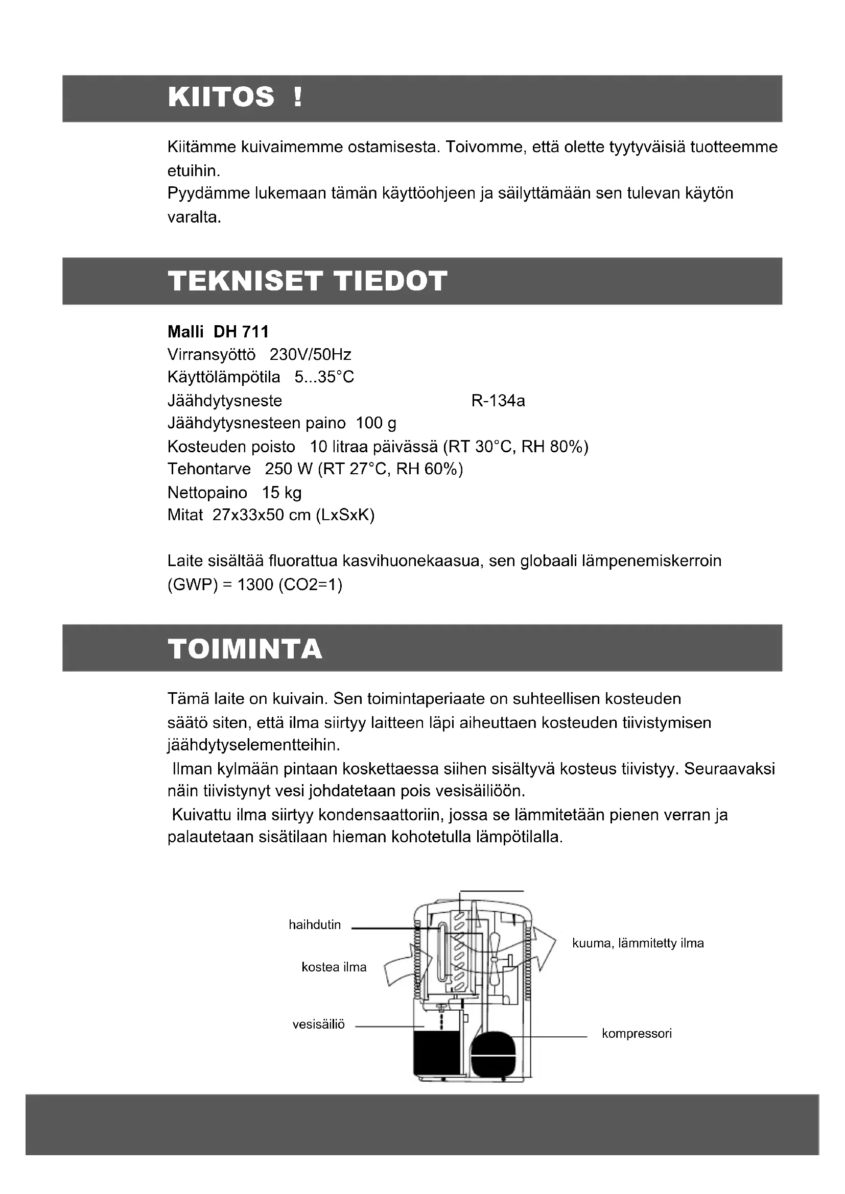 =1) Urządzenie zawiera fluorowany gaz cieplarniany, jego wspóáczynnik ocieplenia globalnego wynosi (GWP) = 1300 kuuma, lämmitetty ilmakompressorivesisäiliökostea ilmahaihdutin KIITOS ! Kiitämme kuivaimemme ostamisesta. Toivomme, että olette tyytyväisiä tuotteemme etuihin. Pyydämme lukemaan tämän käyttöohjeen ja säilyttämään sen tulevan käytön varalta. TEKNISET TIEDOT Malli DH 711 Virransyöttö 230V/50Hz Käyttölämpötila 5...35°C Jäähdytysneste R-134a Jäähdytysnesteen paino 100 g Kosteuden poisto 10 litraa päivässä (RT 30°C, RH 80%) Tehontarve 250 W (RT 27°C, RH 60%) Nettopaino 15 kg Mitat 27x33x50 cm (LxSxK) Laite sisältää fl uorattua kasvihuonekaasua, sen globaali lämpenemiskerroin (GWP) = 1300 (CO2=1) TOIMINTA Tämä laite on kuivain. Sen toimintaperiaate on suhteellisen kosteuden säätö siten, että ilma siirtyy laitteen läpi aiheuttaen kosteuden tiivistymisen jäähdytyselementteihin. Ilman kylmään pintaan koskettaessa siihen sisältyvä kosteus tiivistyy. Seuraavaksi näin tiivistynyt vesi johdatetaan pois vesisäiliöön. Kuivattu ilma siirtyy kondensaattoriin, jossa se lämmitetään pienen verran ja palautetaan sisätilaan hieman kohotetulla lämpötilalla.KÄYTTÖTARKOITUS Tämä kuivain on tarkoitettu kosteuden poistamiseen sekä terveellisen ja miellyttävän ilmapiirin luomiseen. Soveltuu käytettäväksi KELLAREISSA, VARASTOISSA, KAAPEISSA, KÄYTTÖTILOISSA, KEITTIÖISSÄ, KIRJASTOISSA, GALLERIOISSA, TIETOKONEHALLEISSA, ARKISTOISSA, OLOHUONEISSA, MAKUUHUONEISSA...