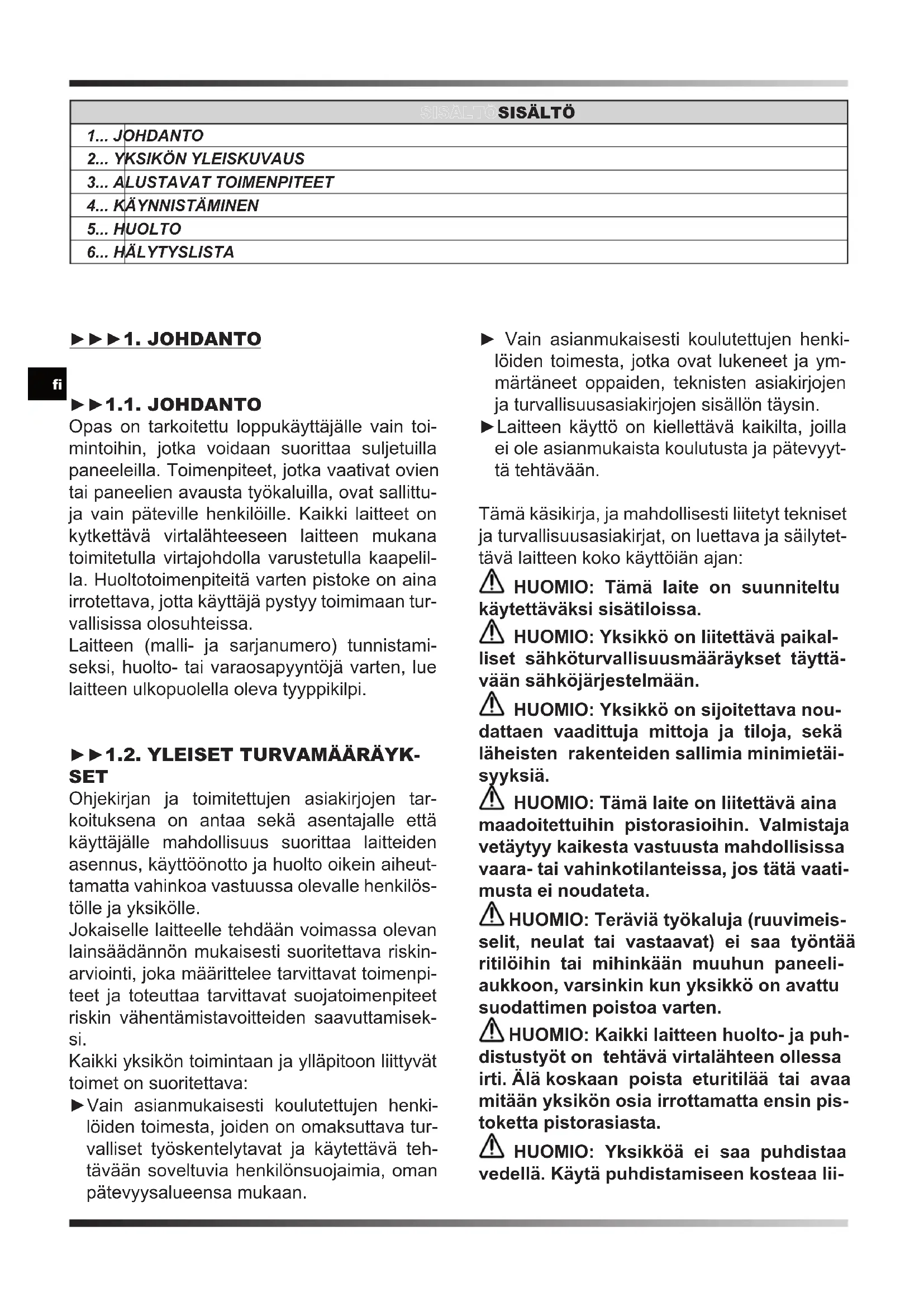 SET Yksikössä on seuraavat varoitusmerkit, joita on noudatettava: Lue käyttöopas. Lue tekninen opas. Sähköiskun vaara. Syttyvän materiaalin vaara. HUOMIO: On ehdottomasti kiellettyä pois- taa yksikössä olevia varoitusmerkkejä.