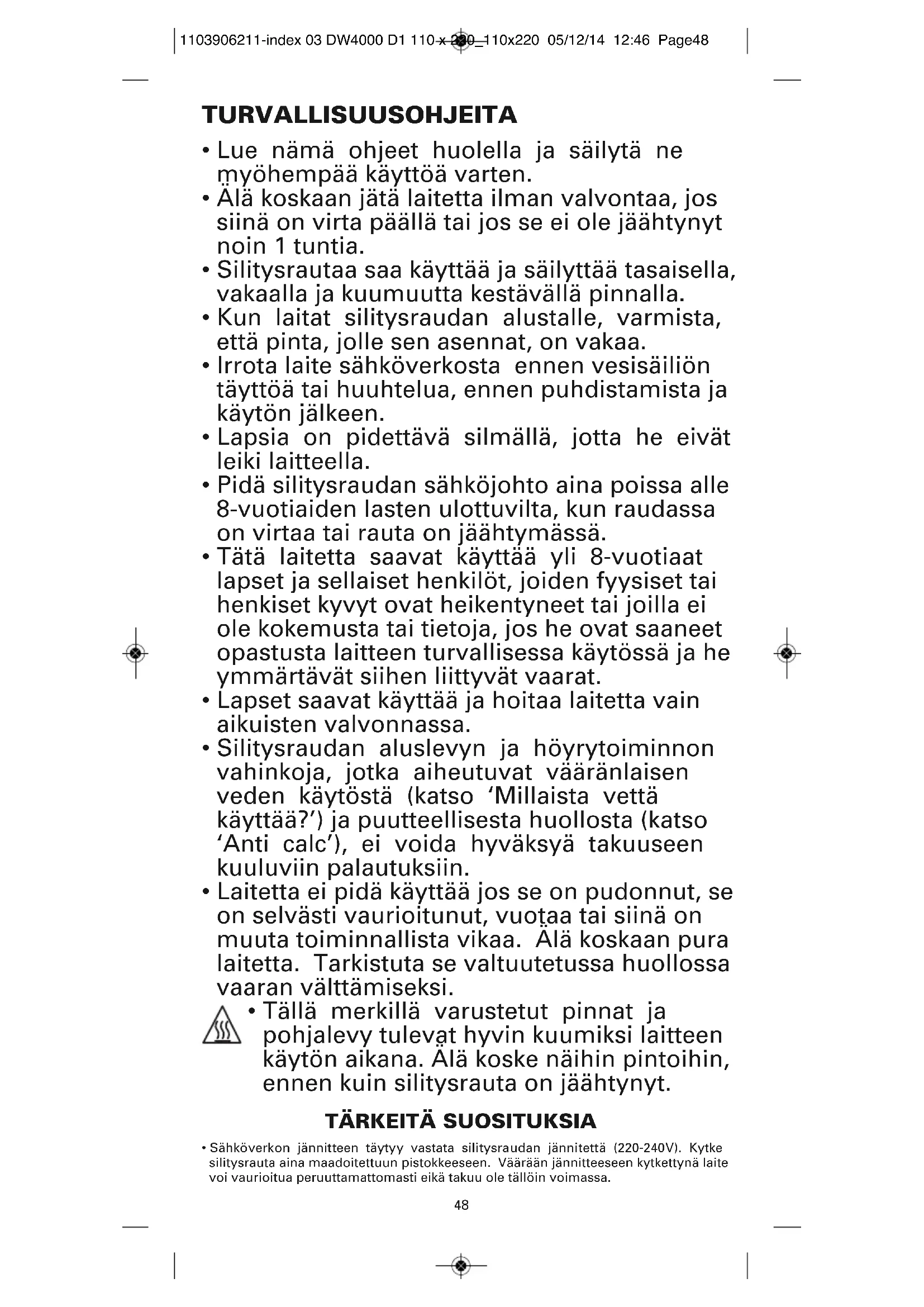 - Sähköverkon jännitteen täytyy vastata silitysraudan jännitettä (220-240V). Kytke silitysrauta aina maadoitettuun pistokkeeseen. Väärään jännitteeseen kytkettynä laite voi vaurioitua peruuttamattomasti eikä takuu ole tällöin voimassa. 1103906211-index 03 DW4000 D1 110 x 220_110x220 05/12/14 12:46 Page4849