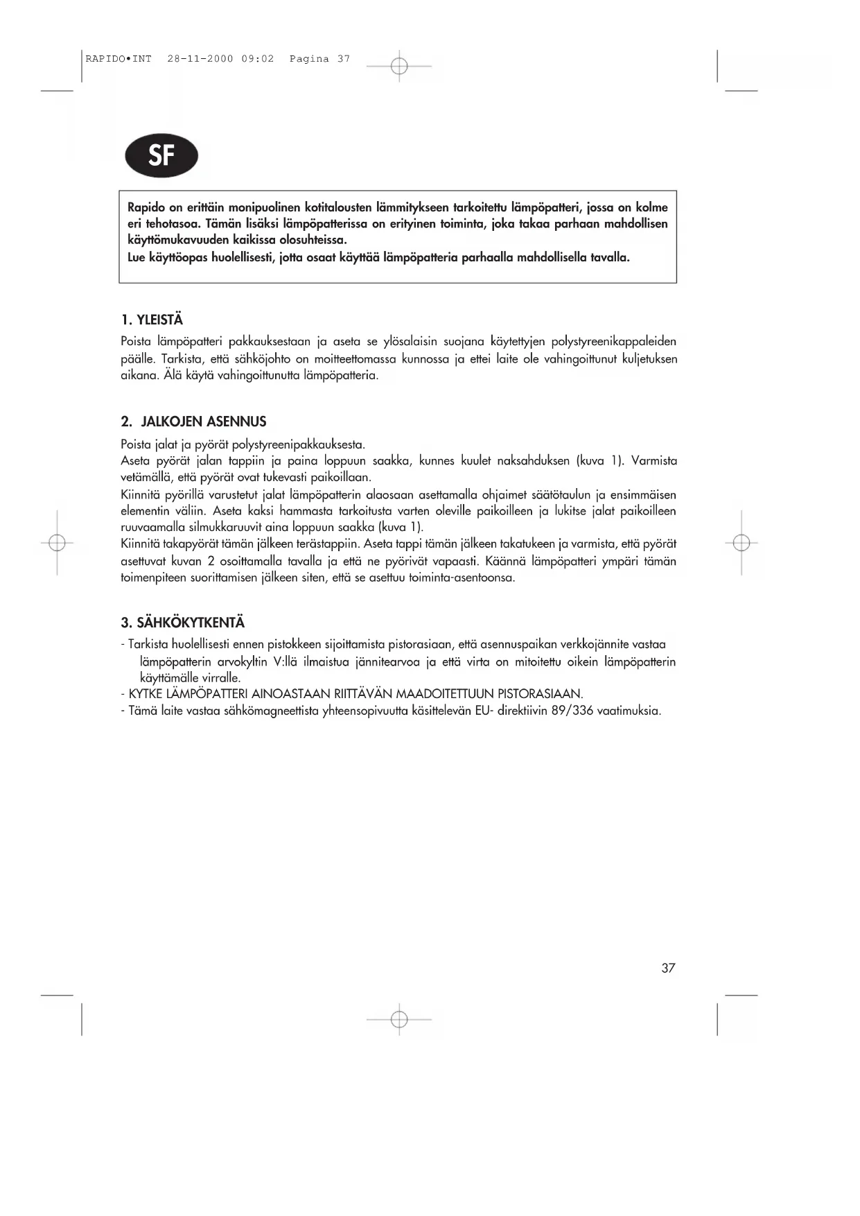 RAPIDO•INT 28-11-2000 09:02 Pagina 3637 Rapido on erittäin monipuolinen kotitalousten lämmitykseen tarkoitettu lämpöpatteri, jossa on kolme eri tehotasoa. Tämän lisäksi lämpöpatterissa on erityinen toiminta, joka takaa parhaan mahdollisen käyttömukavuuden kaikissa olosuhteissa. Lue käyttöopas huolellisesti, jotta osaat käyttää lämpöpatteria parhaalla mahdollisella tavalla.