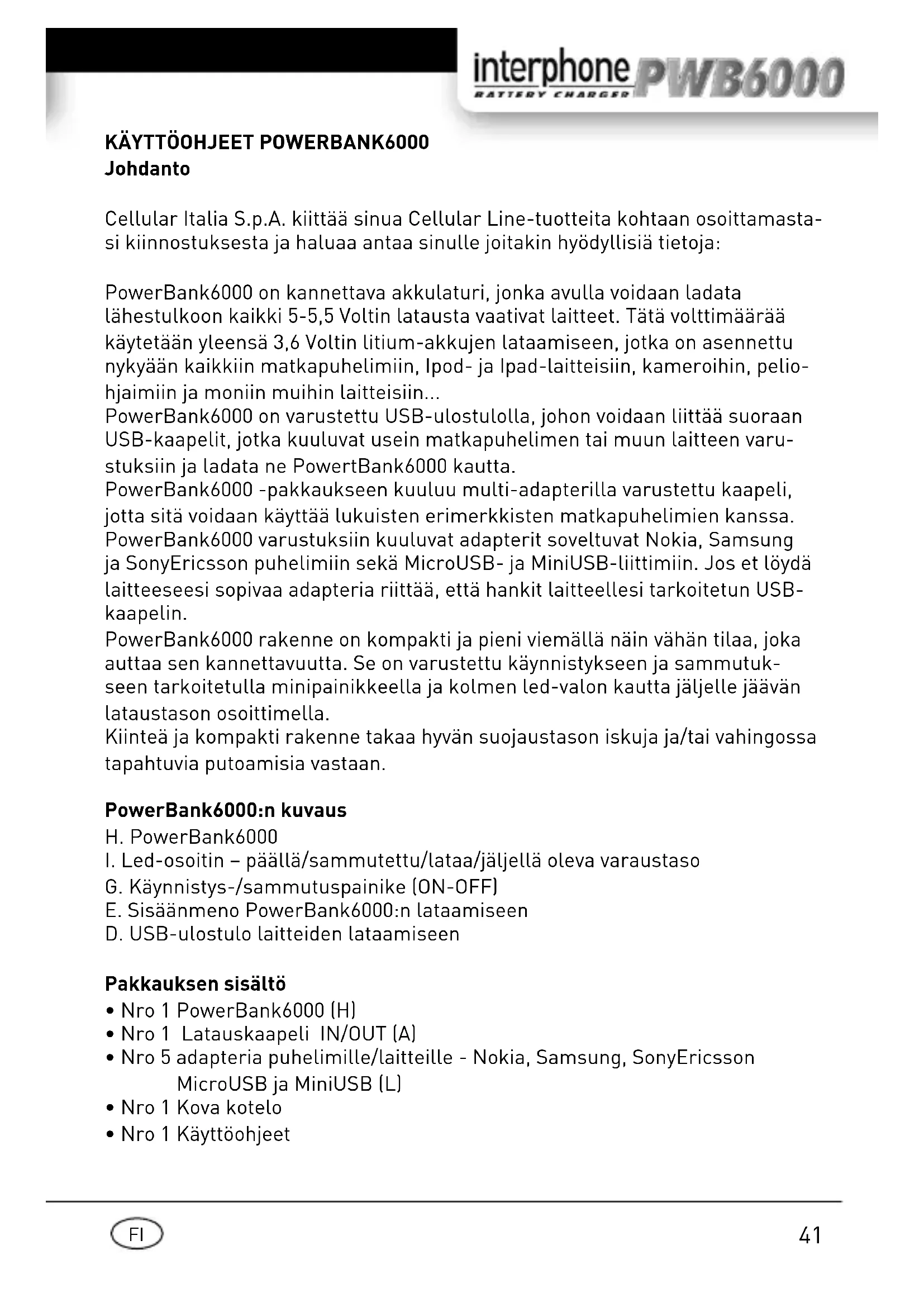 Interphone PWB6000 - Kannettava akku Cellular Line - Ilmainen käyttöohje ja opas