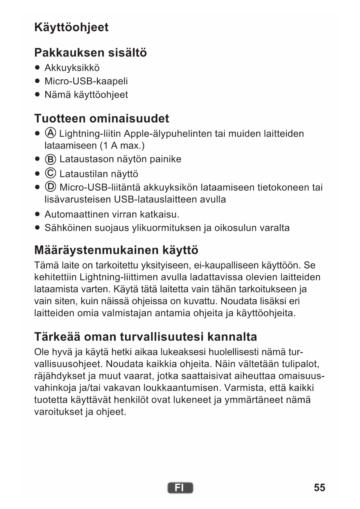 Sähköinen suojaus ylikuormituksen ja oikosulun varalta Määräystenmukainen käyttö Tämä laite on tarkoitettu yksityiseen, ei-kaupalliseen käyttöön. Se kehitettiin Lightning-liittimen avulla ladattavissa olevien laitteiden lataamista varten. Käytä tätä laitetta vain tähän tarkoitukseen ja vain siten, kuin näissä ohjeissa on kuvattu. Noudata lisäksi eri laitteiden omia valmistajan antamia ohjeita ja käyttöohjeita. Tärkeää oman turvallisuutesi kannalta Ole hyvä ja käytä hetki aikaa lukeaksesi huolellisesti nämä tur- vallisuusohjeet. Noudata kaikkia ohjeita. Näin vältetään tulipalot, räjähdykset ja muut vaarat, jotka saattaisivat aiheuttaa omaisuus- vahinkoja ja/tai vakavan loukkaantumisen. Varmista, että kaikki tuotetta käyttävät henkilöt ovat lukeneet ja ymmärtäneet nämä varoitukset ja ohjeet.56