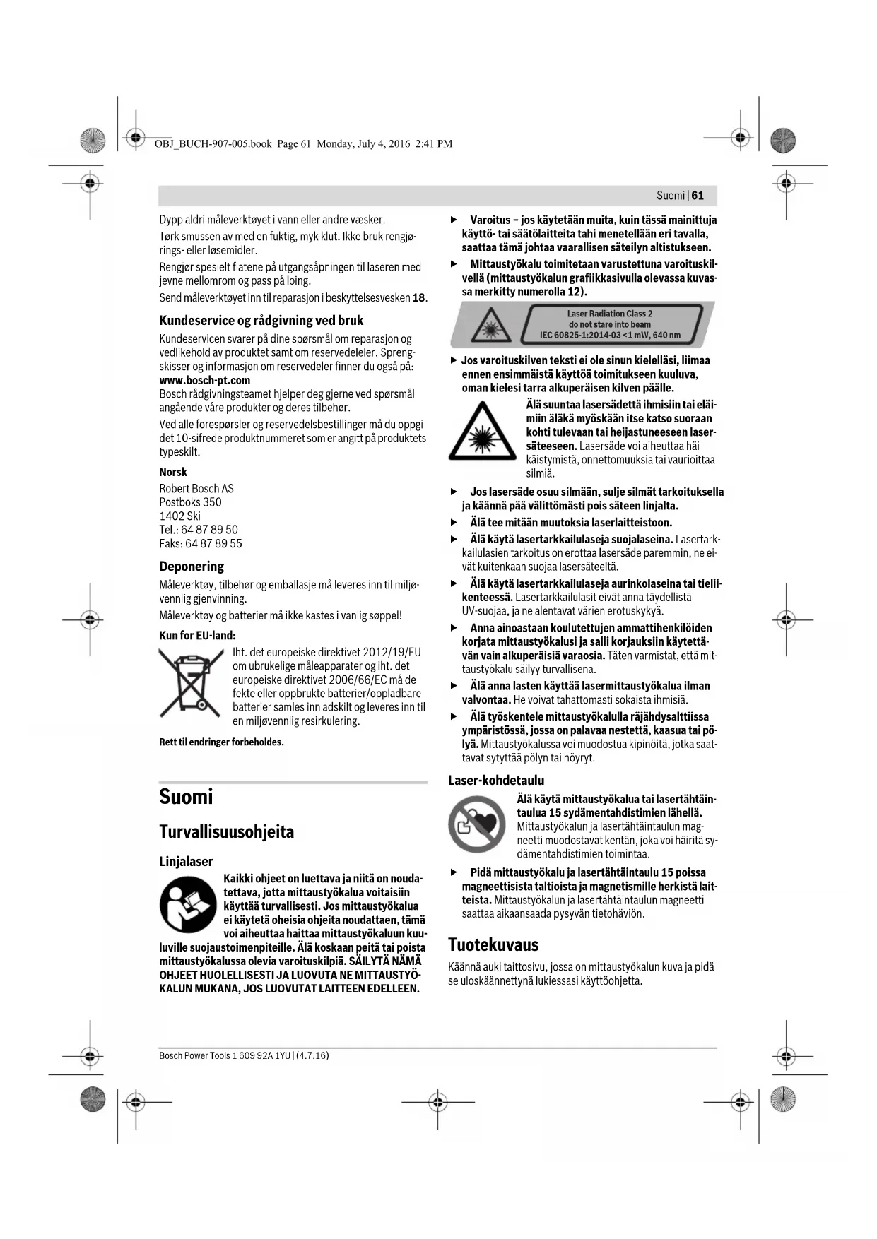 OBJ_BUCH-907-005.book Page 65 Monday, July 4, 2016 2:41 PM66 | Ελληνικά 1 609 92A 1YU | (4.7.16) Bosch Power Tools Hoito ja huolto Huolto ja puhdistus Säilytä ja kuljeta mittauslaite vain toimitukseen kuuluvassa suojataskussa. Pidä aina mittaustyökalu puhtaana. Älä koskaan upota mittaustyökalua veteen tai muihin nestei- siin. Pyyhi pois lika kostealla pehmeällä rievulla. Älä käytä puhdis- tusaineita tai liuottimia. Puhdista erityisesti pinnat laserin ulostuloaukossa säännölli- sesti ja varo nukkaa. Lähetä korjaustapauksessa mittaustyökalu suojalaukussa 18 korjattavaksi. Asiakaspalvelu ja käyttöneuvonta Asiakaspalvelu vastaa tuotteesi korjausta ja huoltoa sekä va- raosia koskeviin kysymyksiin. Räjähdyspiirustuksia ja tietoja varaosista löydät myös osoitteesta: www.bosch-pt.com Boschin asiakaspalvelu auttaa mielellään sinua tuotteitamme ja niiden lisätarvikkeita koskevissa kysymyksissä. Ilmoita kaikissa kyselyissä ja varaosatilauksissa 10-numeroi- nen tuotenumero, joka on ilmoitettu tuotteen mallikilvessä. Suomi Robert Bosch Oy Bosch-keskushuolto Pakkalantie 21 A 01510 Vantaa Voitte tilata varaosat suoraan osoitteesta www.bosch-pt.fi. Puh.: 0800 98044 Faksi: 010 296 1838 www.bosch.fi Hävitys Toimita mittaustyökalut, lisätarvikkeet ja pakkausmateriaali ympäristöystävälliseen kierrätykseen. Älä heitä mittaustyökaluja tai akkuja/paristoja talousjätteisiin! Vain EU-maita varten: Eurooppalaisen direktiivin 2012/19/EU mu- kaan käyttökelvottomat mittaustyökalut ja eurooppalaisen direktiivin 2006/66/EY mu- kaan vialliset tai loppuun käytetyt akut/paris- tot täytyy kerätä erikseen ja toimittaa ympä- ristöystävälliseen kierrätykseen. Oikeus teknisiin muutoksiin pidätetään.