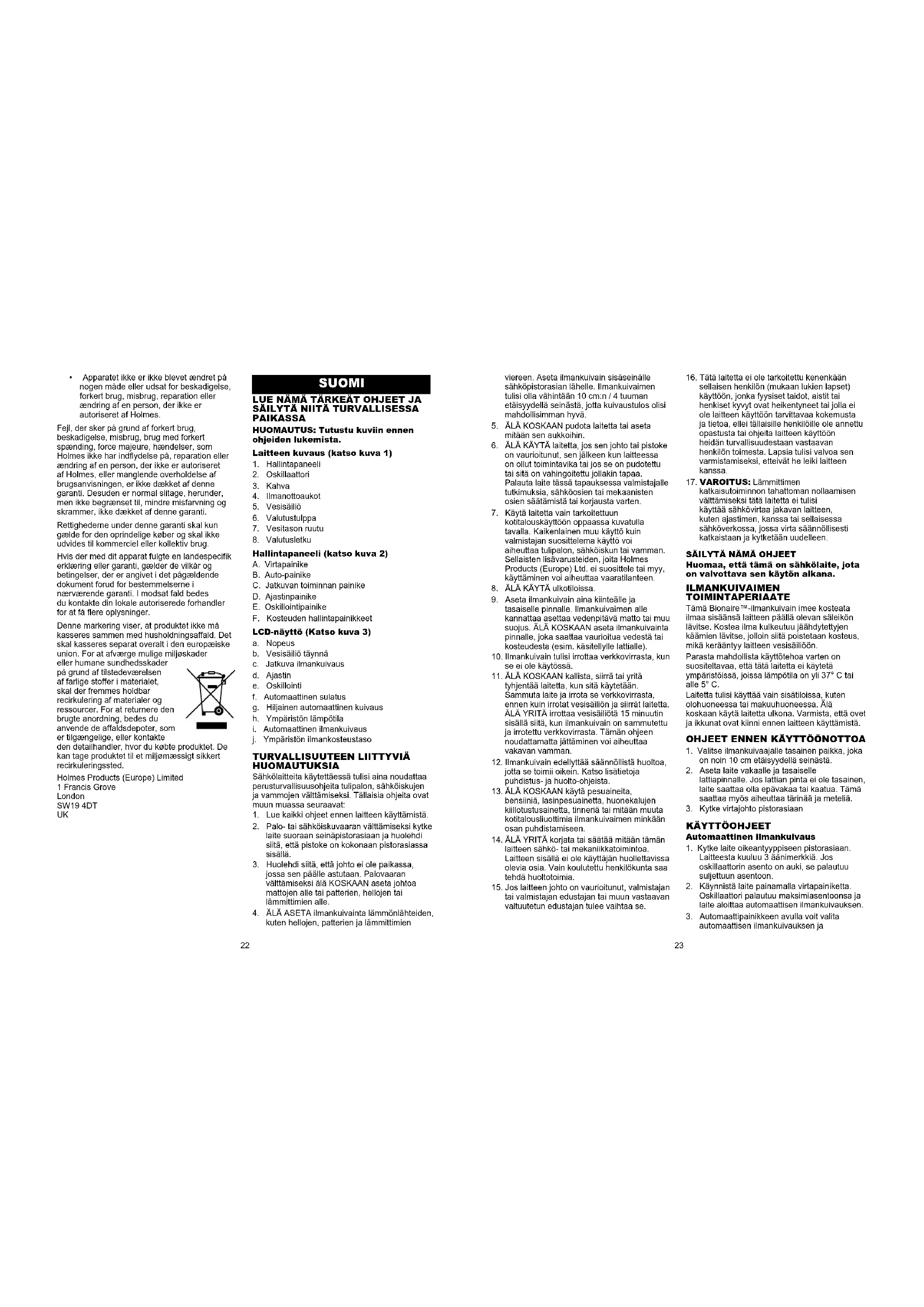 - Laitettaeiolemuutettumitenkään tai kohdeltu kaltoin tai vahingoitettu eikä sen korjaukseen tai muutostöihin ole osallistunut muita kuin Holmesin valtuuttamia henkilöitä. Takuu ei kata virheellisestä käytöstä, vahingoittumisesta, laitteen kohtelemisesta väärin, laitteen väärällä jännitteellä käyttämisestä, luonnonmullistuksista, muista asioista, joihin Holmesilla ei ole vaikutusvaltaa, muun kuin Holmesin valtuuttaman henkilön 2524tekemistä korjaus- tai muutostöistä tai ohjeiden noudattamatta jättämisestä aiheutuvia ongelmia. Lisäksi takuu ei kata tavallista kulumista, muun muassa pieniä värin muutoksia tai naarmuja. Tässä takuussa myönnetyt oikeudet koskevat vain alkuperäistä ostajaa eivätkä ne ulotu kaupalliseen tai yhteisölliseen käyttöön. Jos laitteella on maakohtainen takuu, käytä kyseisen takuun ehtoja tämän takuun sijasta tai pyydä lisätietoja paikalliselta valtuutetulta jälleenmyyjältä. Tämä merkki osoittaa, että tuotetta ei saa hävittää kotitalousjätteen mukana, vaan se on kierrätettävä asianmukaisesti koko EU:n alueella. Tuote saattaa sisältää ympäristölle ja terveydelle vaarallisia aineita, mistä syystä se on kierrätettävä asianmukaisesti, ja materiaalia on käytettävä uudelleen mahdollisuuksien mukaan luonnonvarojen säästämiseksi. Kun on tullut aika hävittää laite, käytä asianmukaista kierrätysjärjestelmää tai palauta laite ostopisteeseen. Myyjä toimittaa laitteen asianmukaisesti kierrätysjärjestelmään. Holmes Products (Europe) Limited 1 Francis Grove London SW19 4DT