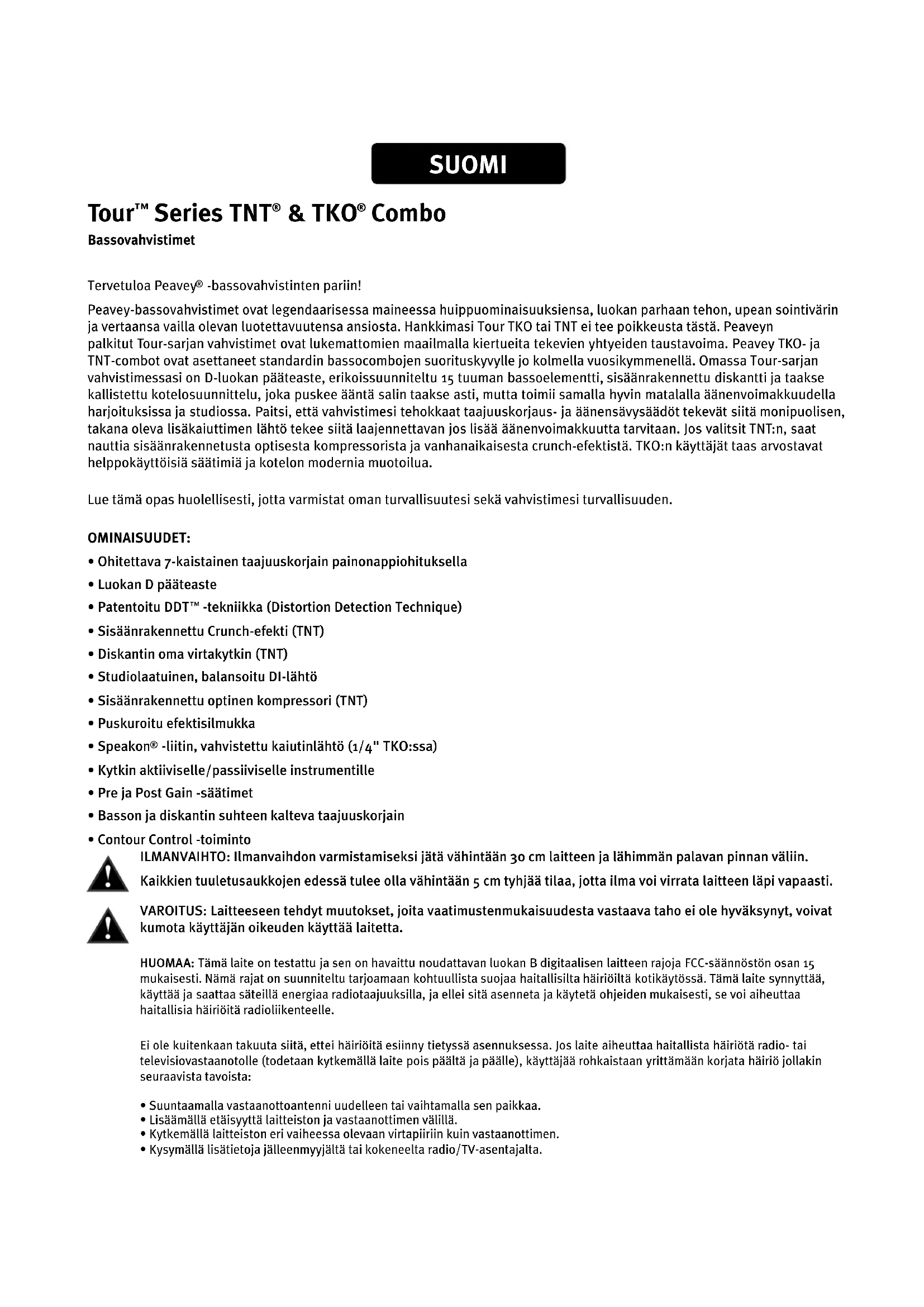 -bassovahvistinten pariin! Peavey-bassovahvistimet ovat legendaarisessa maineessa huippuominaisuuksiensa, luokan parhaan tehon, upean sointivärin ja vertaansa vailla olevan luotettavuutensa ansiosta. Hankkimasi Tour TKO tai TNT ei tee poikkeusta tästä. Peaveyn palkitut Tour-sarjan vahvistimet ovat lukemattomien maailmalla kiertueita tekevien yhtyeiden taustavoima. Peavey TKO- ja TNT-combot ovat asettaneet standardin bassocombojen suorituskyvylle jo kolmella vuosikymmenellä. Omassa Tour-sarjan vahvistimessasi on D-luokan pääteaste, erikoissuunniteltu 15 tuuman bassoelementti, sisäänrakennettu diskantti ja taakse kallistettu kotelosuunnittelu, joka puskee ääntä salin taakse asti, mutta toimii samalla hyvin matalalla äänenvoimakkuudella harjoituksissa ja studiossa. Paitsi, että vahvistimesi tehokkaat taajuuskorjaus- ja äänensävysäädöt tekevät siitä monipuolisen, takana oleva lisäkaiuttimen lähtö tekee siitä laajennettavan jos lisää äänenvoimakkuutta tarvitaan. Jos valitsit TNT:n, saat nauttia sisäänrakennetusta optisesta kompressorista ja vanhanaikaisesta crunch-efektistä. TKO:n käyttäjät taas arvostavat helppokäyttöisiä säätimiä ja kotelon modernia muotoilua. Lue tämä opas huolellisesti, jotta varmistat oman turvallisuutesi sekä vahvistimesi turvallisuuden. OMINAISUUDET: