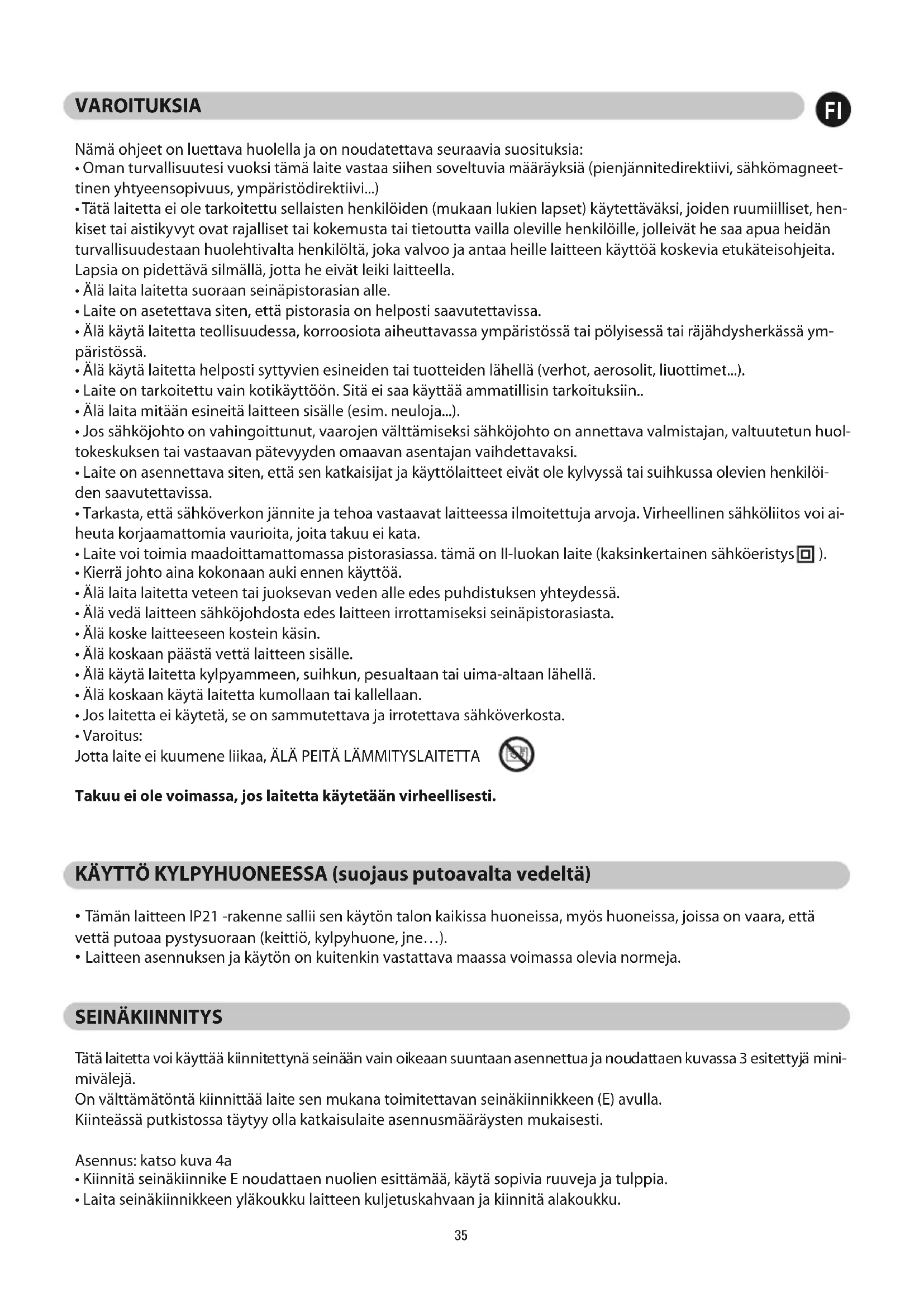 - Laitteen asennuksen ja käytön on kuitenkin vastattava maassa voimassa olevia normeja. SEINÄKIINNITYS Tätä laitetta voi käyttää kiinnitettynä seinään vain oikeaan suuntaan asennettua ja noudattaen kuvassa 3 esitettyjä mini- mivälejä. On välttämätöntä kiinnittää laite sen mukana toimitettavan seinäkiinnikkeen (E) avulla. Kiinteässä putkistossa täytyy olla katkaisulaite asennusmääräysten mukaisesti. Asennus: katso kuva 4a