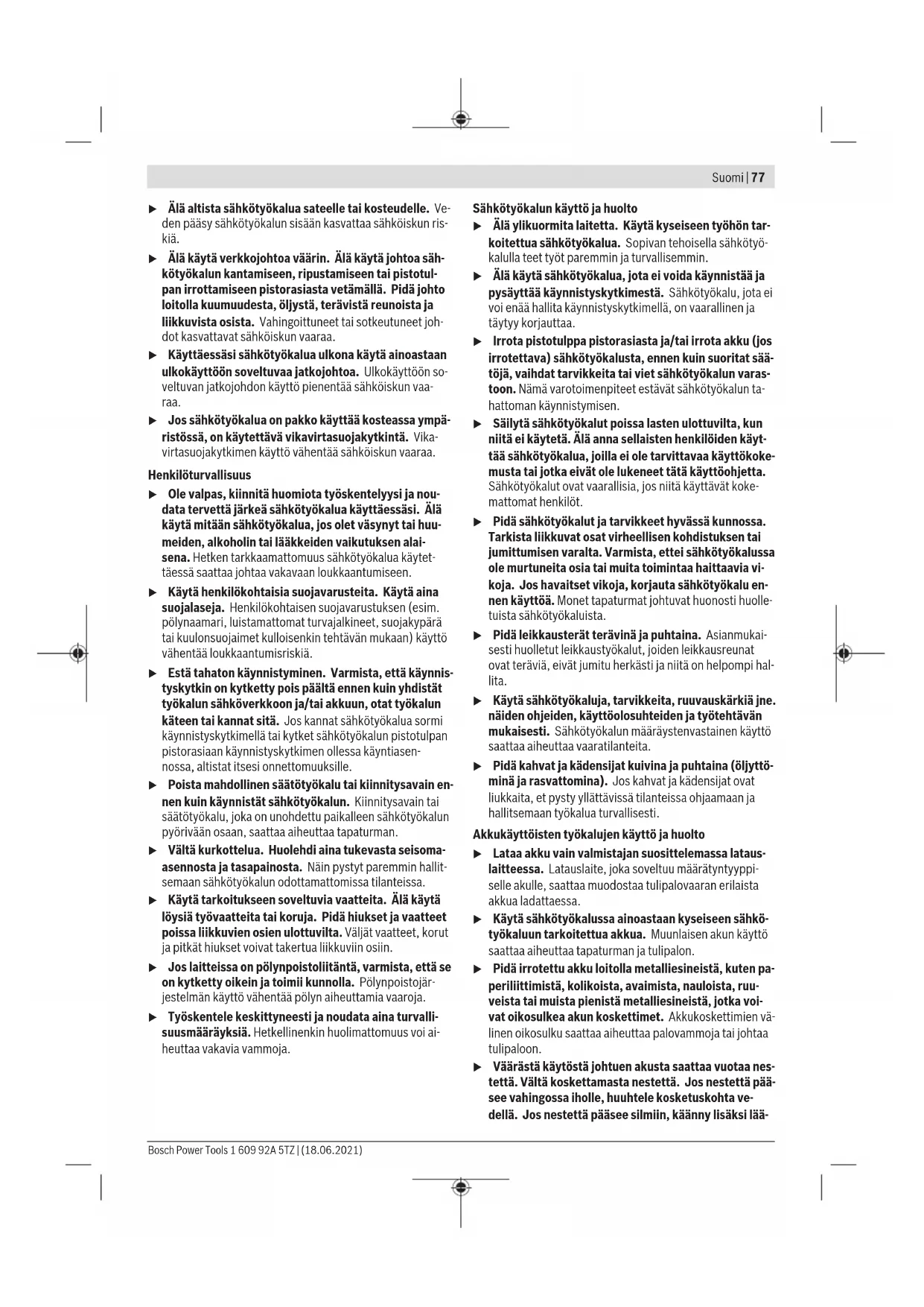 Høyt turtall, til arbeid med liten bordiameter. Inn-/utkobling For å slå på elektroverktøyet trykker du på av/på-bryteren (18) og holder den inne. LED-lampen (15) lyser når av/på-bryteren (18) trykkes litt eller helt inn og gir mulighet til å lyse opp arbeidsplassen ved ugunstige lysforhold. For å slå av elektroverktøyet slipper du av/på-bryteren (18). Hurtigutkobling (Kickback Control) u Hurtigutkoblingen (Kickback Control) gir bedre kontroll over elektroverktøyet og gir dermed økt beskyttelse for brukeren sammenlignet med elektroverktøy uten Kickback Control. Hvis elektroverktøyet plutselig og uforutsett roterer rundt borakselen, kobles elektroverktøyet ut. Hurtigutkoblingen signaliseres ved at arbeidslyset på elektroverktøyet blinker. For å starte igjen slipper du av/på-bryteren og trykker den inn på nytt. u Hvis funksjonen Kickback Control er defekt, kan ikke bormaskinen slås på. Elektroverktøyet må kun repareres av kvalifisert fagpersonale og kun med originale reservedeler. Innstilling av turtallet Du kan regulere turtallet til det innkoblede elektroverktøyet trinnløst, avhengig av hvor langt inn du trykker av/på- bryteren (18). Et lett trykk på av/på-bryteren (18) gir lavt turtall. Turtallet stiger med økende trykk. Temperaturavhengig overbelastningsvern Ved forskriftsmessig bruk kan ikke elektroverktøyet overbelastes. Ved for stor belastning eller hvis batteritemperaturen ikke er innenfor tillatt område reduseres turtallet. Elektroverktøyet går ikke med fullt turtall igjen før tillatt batteritemperatur er nådd. Det temperaturavhengige overbelastningsvernet indikeres ved at lysdioden (16) på elektroverktøyet lyser rødt. Hvis lysdioden (16) slukker, har verktøyet igjen tillatt batteritemperatur. Arbeidshenvisninger u Sett elektroverktøyet bare mot skruen når det er slått av. Innsatsverktøy som roterer, kan gli av. Et hjelpeverktøy kan brukes når skrumaskinbits eller en universalbitsholder skal tas ut. Belteklips Bosch Power Tools 1 609 92A 5TZ | (18.06.2021)76 | Suomi Med belteklipset (11) kan du f.eks. henge elektroverktøyet i et belte. Du har da begge hender ledig og elektroverktøyet er alltid lett tilgjengelig. Fargeklips (se bilde D) Med fargeklipset (10) kan du merke elektroverktøyet individuelt. Service og vedlikehold Vedlikehold og rengjøring u Ta alltid batteriet ut av elektroverktøyet før arbeider på elektroverktøyet utføres (f.eks. vedlikehold, verktøyskifte osv.) og før transport og oppbevaring. Det er fare for skader hvis du trykker på av/på-bryteren ved en feiltagelse. u Hold selve elektroverktøyet og ventilasjonsslissene alltid rene, for å kunne arbeide bra og sikkert. Kundeservice og kundeveiledning Kundeservice hjelper deg ved spørsmål om reparasjon og vedlikehold av produktet ditt og reservedelene. Du finner også sprengskisser og informasjon om reservedeler på www.bosch-pt.com Boschs kundeveilederteam hjelper deg gjerne hvis du har spørsmål om våre produkter og tilbehør. Ved alle forespørsler og reservedelsbestillinger må du oppgi det 10‑sifrede produktnummeret som er angitt på produktets typeskilt. Norsk Robert Bosch AS Postboks 350 1402 Ski Tel.: 64 87 89 50 Faks: 64 87 89 55 Du finner adresser til andre verksteder på: www.bosch-pt.com/serviceaddresses Transport Li-ion-batteriene i verktøyet underligger kravene for farlig gods. Batteriene kan transporteres på veier av brukeren uten ytterligere krav. Ved forsendelse gjennom tredje personer (f.eks.: lufttransport eller spedisjon) må det oppfylles spesielle krav til emballasje og merking. Du må konsultere en ekspert for farlig gods ved forberedelse av forsendelsen. Send batterier kun hvis huset ikke er skadet. Lim igjen de åpne kontaktene og pakk batteriet slik at det ikke beveger seg i emballasjen. Ta også hensyn til videreførende nasjonale forskrifter. Deponering Elektroverktøy, batterier, tilbehør og emballasje må leveres inn til miljøvennlig gjenvinning. Elektroverktøy og batterier må ikke kastes i vanlig søppel! Bare for land i EU: Iht. det europeiske direktivet 2012/19/EU om brukt elektrisk utstyr og iht. det europeiske direktivet 2006/66/ EC må defekte eller brukte batterier/oppladbare batterier samles adskilt og leveres inn for miljøvennlig resirkulering. (Oppladbare) batterier: Li-ion: Se informasjonen i avsnittet Transport (se „Transport“, Side76). Suomi Turvallisuusohjeet Yleiset sähkötyökalujen turvaohjeet VAROITUS Lue kaikki tämän sähkötyökalun mukana toimitetut varoitukset, oh- jeet, kuvat ja tekniset tiedot. Alla mainittujen ohjeiden noudattamisen laiminlyönti saattaa aiheuttaa sähköiskun, tu- lipalon ja/tai vakavan loukkaantumisen. Säilytä kaikki turvallisuusohjeet ja muut ohjeet tulevai- suutta varten. Turvallisuusohjeissa käytetty käsite "sähkötyökalu" käsittää verkkokäyttöisiä sähkötyökaluja (verkkojohdolla) ja akku- käyttöisiä sähkötyökaluja (ilman verkkojohtoa). Työpaikan turvallisuus u Pidä työskentelyalue puhtaana ja hyvin valaistuna. Työpaikan epäjärjestys tai valaisemattomat työalueet voi- vat johtaa tapaturmiin. u Älä työskentele sähkötyökalulla räjähdysalttiissa ym- päristössä, jossa on palavaa nestettä, kaasua tai pö- lyä. Sähkötyökalu muodostaa kipinöitä, jotka saattavat sytyttää pölyn tai höyryn. u Pidä lapset ja sivulliset loitolla sähkötyökalua käyt- täessäsi. Voit menettää laitteen hallinnan, jos suuntaat huomiosi muualle. Sähköturvallisuus u Sähkötyökalun pistotulpan tulee sopia pistorasiaan. Pistotulppaa ei saa muuttaa millään tavalla. Älä käytä minkäänlaisia pistorasia-adaptereita maadoitettujen sähkötyökalujen kanssa. Alkuperäisessä kunnossa ole- vat pistotulpat ja sopivat pistorasiat vähentävät sähköis- kun vaaraa. u Vältä maadoitettujen pintojen, kuten putkien, patte- reiden, liesien tai jääkaappien koskettamista. Säh- köiskun vaara kasvaa, jos kehosi on maadoitettu. 1 609 92A 5TZ |