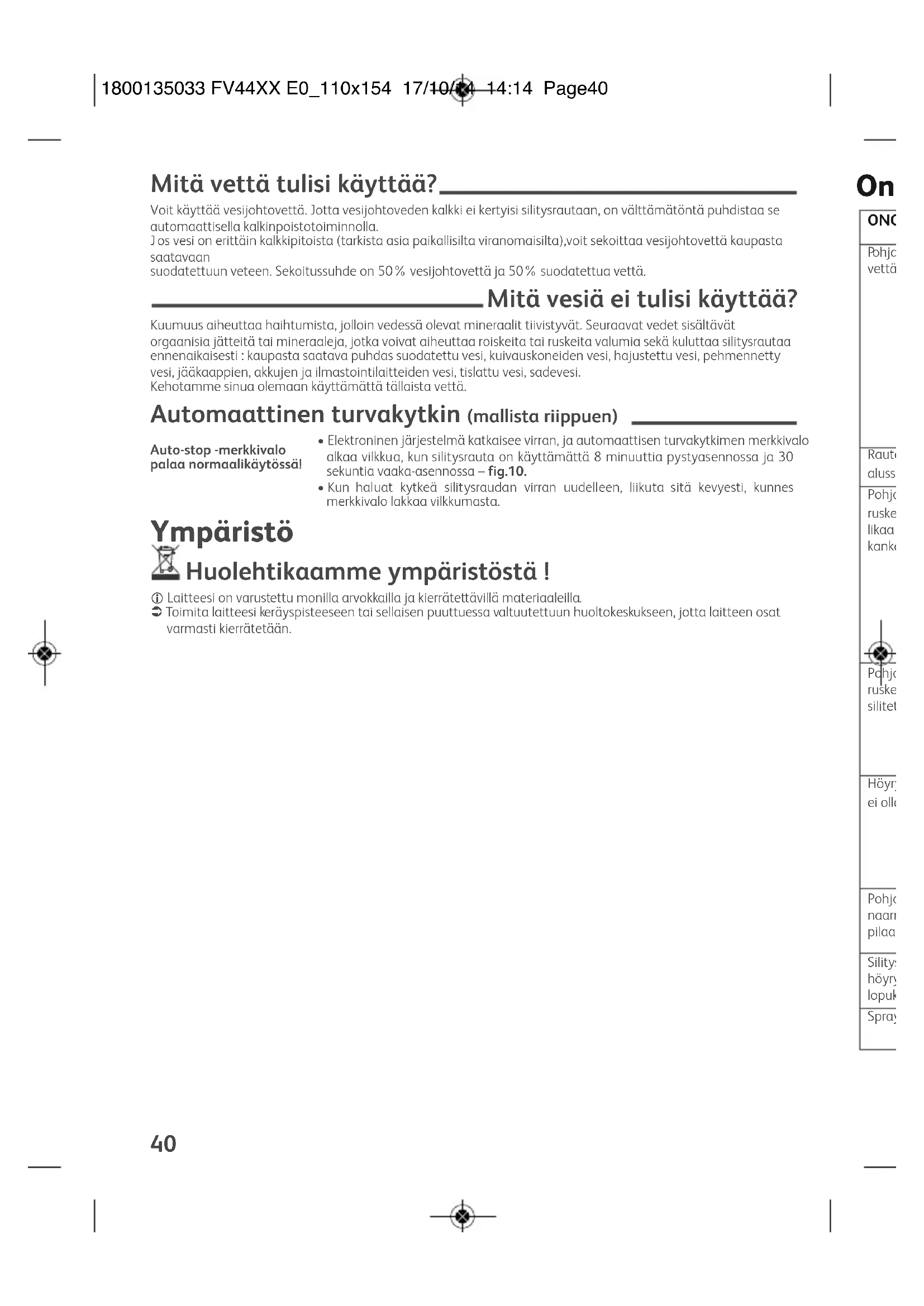 - Kun haluat kytkeä silitysraudan virran uudelleen, liikuta sitä kevyesti, kunnes merkkivalo lakkaa vilkkumasta. Ympäristö Huolehtikaamme ympäristöstä ! i Laitteesi on varustettu monilla arvokkailla ja kierrätettävillä materiaaleilla. ‹ Toimita laitteesi keräyspisteeseen tai sellaisen puuttuessa valtuutettuun huoltokeskukseen, jotta laitteen osat varmasti kierrätetään. Auto-stop -merkkivalopalaa normaalikäytössä! 1800135033 FV44XX E0_110x154 17/10/14 14:14 Page40ONGELMA MAHDOLLISIA SYITÄ RATKAISU
