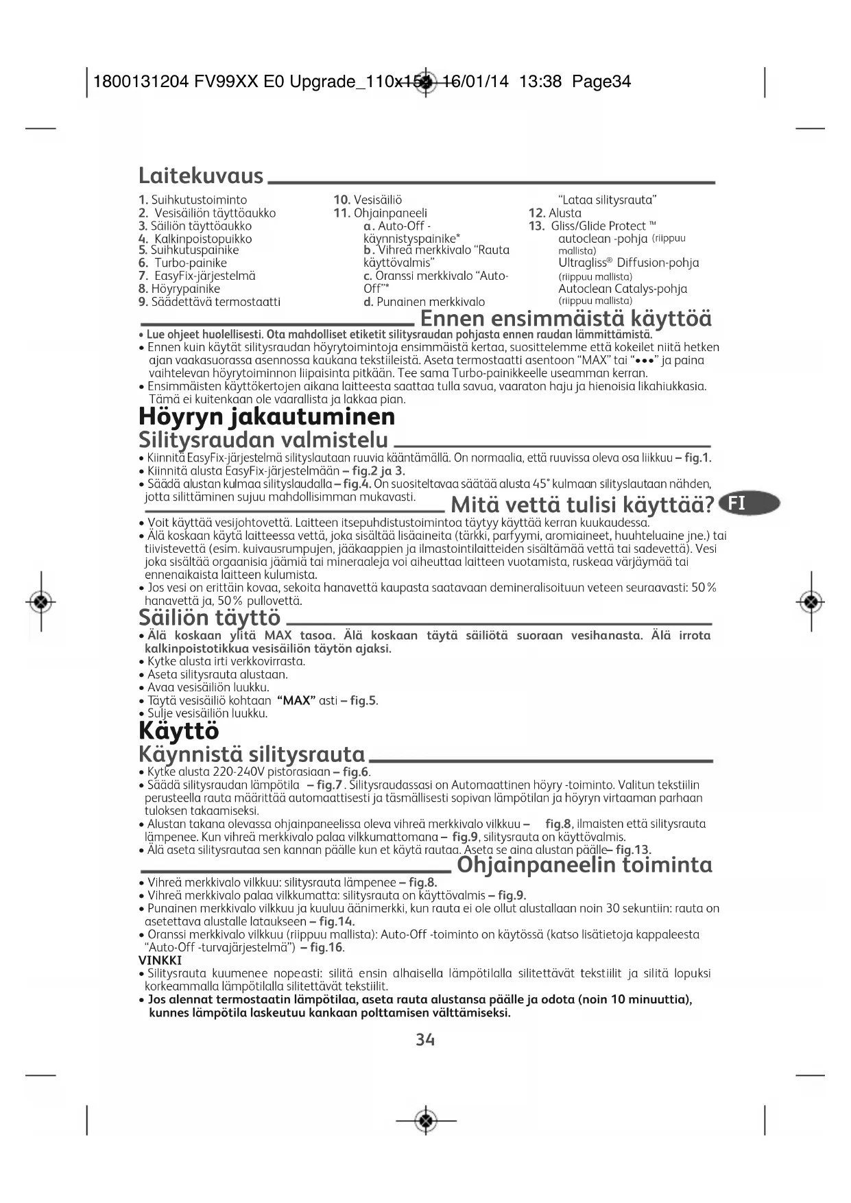 - Jos alennat termostaatin lämpötilaa, aseta rauta alustansa päälle ja odota (noin 10 minuuttia), kunnes lämpötila laskeutuu kankaan polttamisen välttämiseksi. 1800131204FV99XXE0Upgrade_110x15416/01/1413:38Page34• Jos silität sekakuitukangasta: säädä silityksen lämpötila herkimmille tekstiileille sopivaksi. Vaihtelevan höyryn/kuivasilityksen käyttö