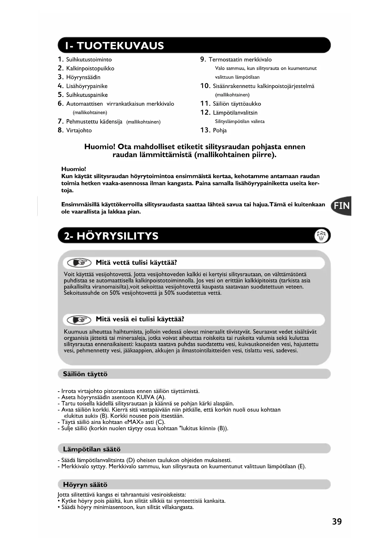 Mitä vettä tulisi käyttää? Voit käyttää vesijohtovettä. Jotta vesijohtoveden kalkki ei kertyisi silitysrautaan, on välttämätöntä puhdistaa se automaattisella kalkinpoistotoiminnolla. Jos vesi on erittäin kalkkipitoista (tarkista asia paikallisilta viranomaisilta),voit sekoittaa vesijohtovettä kaupasta saatavaan suodatettuun veteen.Sekoitussuhde on 50% vesijohtovettä ja 50% suodatettua vettä. Mitä vesiä ei tulisi käyttää? Kuumuus aiheuttaa haihtumista, jolloin vedessä olevat mineraalit tiivistyvät. Seuraavat vedet sisältävätorgaanisia jätteitä tai mineraaleja, jotka voivat aiheuttaa roiskeita tai ruskeita valumia sekä kuluttaa silitysrautaa ennenaikaisesti: kaupasta saatava puhdas suodatettu vesi, kuivauskoneiden vesi, hajustettuvesi, pehmennetty vesi, jääkaappien, akkujen ja ilmastointilaitteiden vesi, tislattu vesi, sadevesi.Huomio!Kun käytät silitysraudan höyrytoimintoa ensimmäistä kertaa, kehotamme antamaan raudantoimia hetken vaaka-asennossa ilman kangasta. Paina samalla lisähöyrypainiketta useita ker-toja.Ensimmäisillä käyttökerroilla silitysraudasta saattaa lähteä savua tai hajua.Tämä ei kuitenkaanole vaarallista ja lakkaa pian. Huomio! Ota mahdolliset etiketit silitysraudan pohjasta ennen raudan lämmittämistä (mallikohtainen piirre).