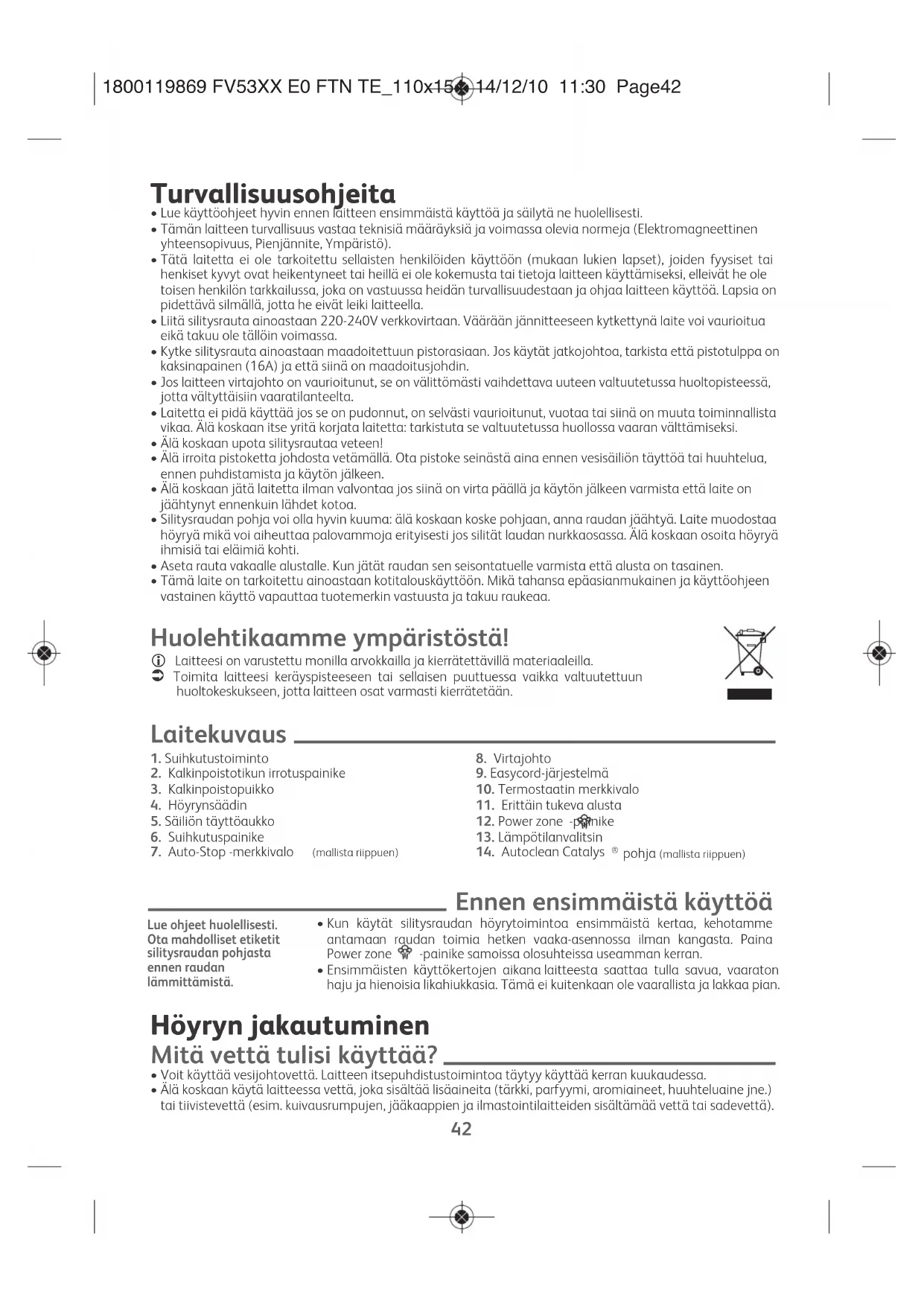 - Älä koskaan käytä laitteessa vettä, joka sisältää lisäaineita (tärkki, parfyymi, aromiaineet, huuhteluaine jne.) tai tiivistevettä (esim. kuivausrumpujen, jääkaappien ja ilmastointilaitteiden sisältämää vettä tai sadevettä). Lue ohjeet huolellisesti. Ota mahdolliset etiketit silitysraudan pohjasta ennen raudan lämmittämistä. 1800119869 FV53XX E0 FTN TE_110x154 14/12/10 11:30 Page42EN