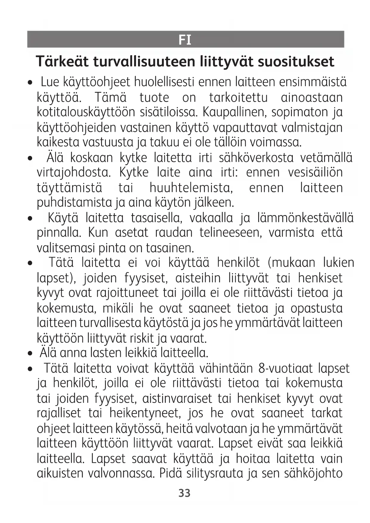 - Tätä laitetta voivat käyttää vähintään 8-vuotiaat lapset ja henkilöt, joilla ei ole riittävästi tietoa tai kokemusta tai joiden fyysiset, aistinvaraiset tai henkiset kyvyt ovat rajalliset tai heikentyneet, jos he ovat saaneet tarkat ohjeet laitteen käytössä, heitä valvotaan ja he ymmärtävät laitteen käyttöön liittyvät vaarat. Lapset eivät saa leikkiä laitteella. Lapset saavat käyttää ja hoitaa laitetta vain aikuisten valvonnassa. Pidä silitysrauta ja sen sähköjohto 33aina poissa alle 8-vuotiaiden lasten ulottuvilta, kun raudassa on virtaa tai rauta on jäähtymässä.