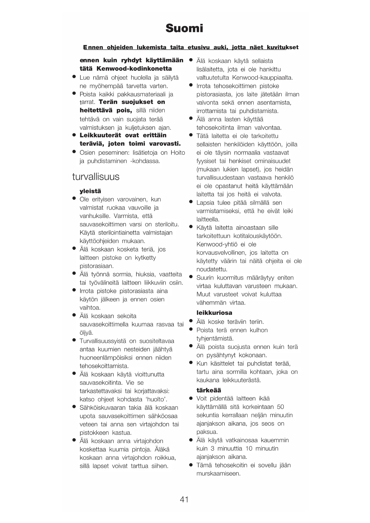 Käytä laitetta ainoastaan sille tarkoitettuun kotitalouskäytöön. Kenwood-yhtiö ei ole korvausvelvollinen, jos laitetta on käytetty väärin tai näitä ohjeita ei ole noudatettu.