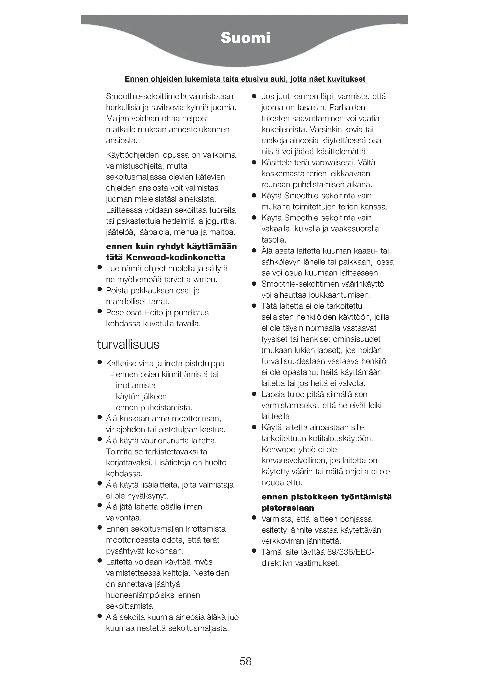 laitteen huolto- tai korjaustöissä, ota yhteys laitteen ostopaikkaan. valmistusohjeita Aamiaissmoothiet Kiireisen aamiainen 1 annos (300 ml) 2 jääkuutiota 60 ml rasvatonta maitoa 50 g vähärasvaista jogurttia 50 g banaania leikattuna 2 cm:n viipaleiksi 75 g omenaa 2 cm:n palasina 5 ml vehnänalkioita 5 ml juoksevaa kirkasta hunajaa 1 Laita jääkuutiot, maito ja jogurtti sekoitusmaljaan. Lisää banaani, omena ja vehnänalkiot. Ravista hyvin ennen sekoittamista. 2 Käännä Low-asentoon 5 sekunniksi ja High-asentoon 20 sekunniksi. Tarkista makeus ja lisää tarvittaessa hunajaa. verigreippijuoma 1 annos (250 ml) 150 ml verigreippimehua 50 ml luonnonjogurttia 50 g banaania leikattuna 2 cm:n viipaleiksi 1 rkl kaurahiutaleita 1 rkl juoksevaa kirkasta hunajaa 1 Laita greippimehu ja jogurtti sekoitusmaljaan. Lisää banaani ja kaurahiutaleet. Ravista hyvin ennen sekoittamista. 2 Käännä High-asentoon 15 sekunniksi. Tarkista makeus ja lisää tarvittaessa hunajaa. 60pähkinäinen banaanismoothie 1 annos (250 ml) 75 ml kevytmaitoa 115 g vähärasvaista pähkinäjogurttia 50 g banaania leikattuna 2 cm:n viipaleiksi 3 kuivattua aprikoosia 1 cm:n palasina 1 Laita greippimehu ja jogurtti sekoitusmaljaan. Lisää banaani ja aprikoosi. Ravista hyvin ennen sekoittamista. 2 Käännä Low-asentoon 5 sekunniksi ja High-asentoon 25 sekunniksi. Hedelmäsmoothiet jäinen mansikkajuoma 1 annos (250 ml) 2 jääkuutiota 70 ml omenamehua 60 g mansikoita puhdistettuina ja puolitettuna 80 g cantaloupemelonia ilman siemeniä 2 cm:n paloina 5 ml juoksevaa kirkasta hunajaa 1 Laita jääpalat ja omenamehu sekoitusmaljaan. Lisää mansikat ja meloni. 2 Käännä Low-asentoon 5 sekunniksi ja High-asentoon 20 sekunniksi. Tarkista makeus ja lisää tarvittaessa hunajaa. mango-, ananas- ja passionhedelmäsmoothie 1 annos (300 ml) 150 ml vastapuristettua appelsiinimehua 85 g kypsää mangoa 2 cm:n palasina 65 g ananasta 2 cm:n palasina passionhedelmän puolikas 1 Laita appelsiinimehu sekoitusmaljaan. Lisää mango, ananas ja passionhedelmä. 2 Käännä High-asentoon 20 sekunniksi. papaija- ja persikkanektari 1 annos (250 ml) 100 ml greippimehua 100 g hedelmämehuun säilöttyä persikkaa 70 g papaijaa ilman siemeniä 2 cm:n paloina 1 Laita greippimehu, persikka ja papaija sekoitusmaljaan. 2 Käännä High-asentoon 15 sekunniksi. marjasmoothie 1 annos (250 ml) 100 ml karpalomehua 25 ml omenamehua 75 g vadelmia 40 g mustikoita 1 Laita karpalo- ja omenamehu sekoitusmaljaan. Lisää marjat. 2 Käännä High-asentoon 20 sekunniksi. 61jäähedelmäjuoma 1 annos (300 ml) 2 jääkuutiota 100 ml appelsiinimehua 50 g kiivihedelmä 2 cm:n paloina 75 g mansikoita puhdistettuina ja puolitettuna 1 Laita jääpalat ja appelsiinimehu sekoitusmaljaan. Lisää kiivi ja mansikat. 2 Käännä Low-asentoon 5 sekunniksi ja High-asentoon 20 sekunniksi. kesähedelmäsmoothie 1 annos (250 ml) 50 g pakastettua kesähedelmäsekoitusta 200 ml kevytmaitoa 1 Laita hedelmät ja maito sekoitusmaljaan. 2 Käännä Low-asentoon 5 sekunniksi ja High-asentoon 25 sekunniksi. Kasvissmoothiet mintunmakuinen lassi 1 annos (250 ml) 2 jääkuutiota 150 ml luonnonjogurttia 90 g kurkkua kuorittuna ja ilman siemeniä 2 cm:n palasina 4 mintunlehteä 1 Laita jääkuutiot, jogurtti, kurkku ja minttu sekoitusmaljaan. 2 Käännä Low-asentoon 5 sekunniksi ja High-asentoon 25 sekunniksi. avokadosmoothie 1 annos (300 ml) 200 ml greippimehua 10 ml sitruunamehua 50g avocadoa ilman kiveä, kuorittuna ja pilkottuna 6 palaksi 60 g kypsää päärynää kuorittuna, ilman siemeniä 2 cm:n paloina muutama tippa tabascoa (voidaan jättää pois) 1 Laita greippi- ja sitruunamehu, avocado ja päärynä sekoitusmaljaan. 2 Käännä High-asentoon 20 sekunniksi. punajuurijuoma 1 annos (250 ml) 50 ml vastapuristettua appelsiinimehua 100 ml omenamehua 15 g raastettua porkkanaa 5 g tuoretta inkivääriä kuorittuna ja raastettuna 50 g vastakeitettyä punajuurta 2 cm:n palasina. 1 Laita appelsiini- ja omenamehu sekoitusmaljaan. Lisää porkkana, inkivääri ja punajuuri. 2 Käännä Low-asentoon 5 sekunniksi ja High-asentoon 25 sekunniksi. 62Smoothie Blender’ınızı lezzetli ve besleyici soğuk içecekler yapmak için kullanabilirsiniz. Dağıtım kapağı, kabın kolaylıkla seyahat kupasına çevrilebileceği anlamına gelir. Tarifler, talimatların arkasındadır ve kupanın üzerindeki el işaretleri istediğiniz malzemeleri karıştırmanızı sağlar. Meyve ve yoğurt (taze veya donmuş) karışımları, dondurma, buz küpleri, meyve suyu ve süt kullanılabilir. Kenwood cihazınızı kullanmadan önce
