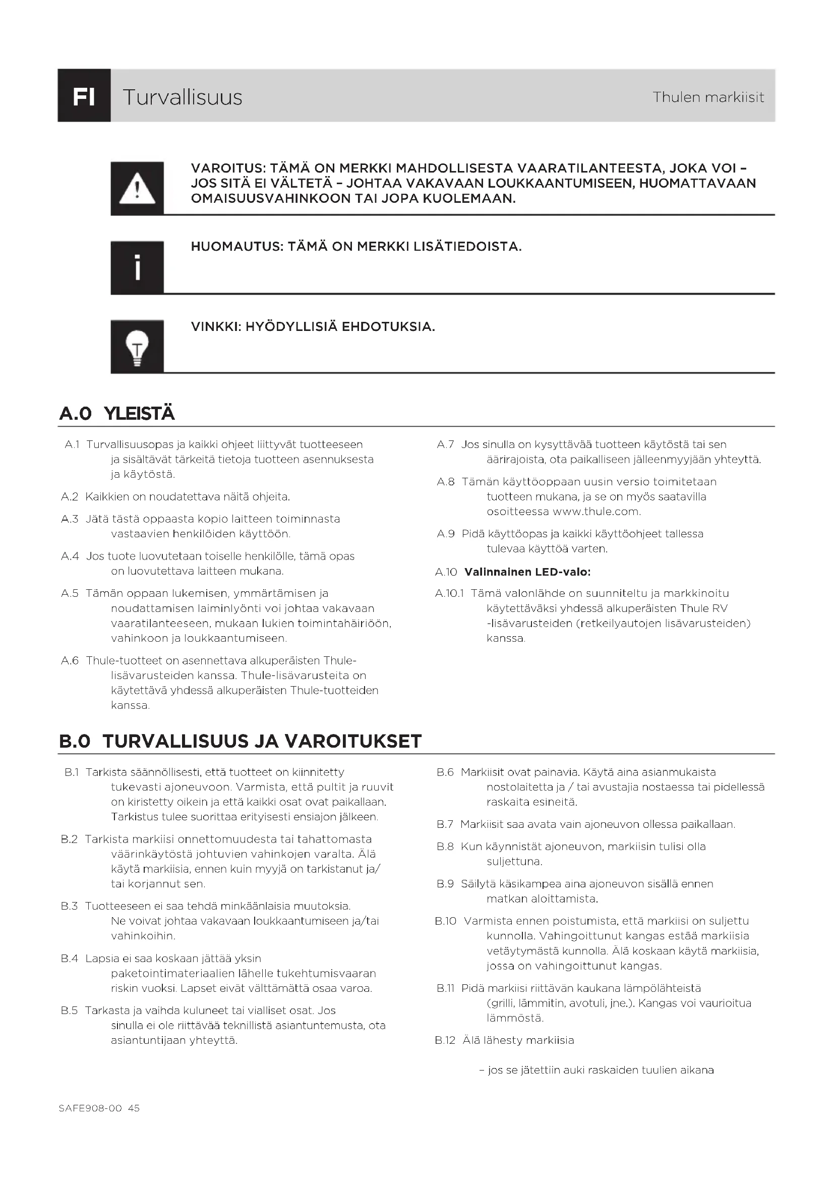 B.1 Tarkista säännöllisesti, että tuotteet on kiinnitetty tukevasti ajoneuvoon. Varmista, että pultit ja ruuvit on kiristetty oikein ja että kaikki osat ovat paikallaan. Tarkistus tulee suorittaa erityisesti ensiajon jälkeen.B.2 Tarkista markiisi onnettomuudesta tai tahattomasta väärinkäytöstä johtuvien vahinkojen varalta. Älä käytä markiisia, ennen kuin myyjä on tarkistanut ja/tai korjannut sen.B.3 Tuotteeseen ei saa tehdä minkäänlaisia muutoksia. Ne voivat johtaa vakavaan loukkaantumiseen ja/tai vahinkoihin.B.4 Lapsia ei saa koskaan jättää yksin paketointimateriaalien lähelle tukehtumisvaaran riskin vuoksi. Lapset eivät välttämättä osaa varoa.B.5 Tarkasta ja vaihda kuluneet tai vialliset osat. Jos sinulla ei ole riittävää teknillistä asiantuntemusta, ota asiantuntijaan yhteyttä.B.6 Markiisit ovat painavia. Käytä aina asianmukaista nostolaitetta ja / tai avustajia nostaessa tai pidellessä raskaita esineitä.B.7 Markiisit saa avata vain ajoneuvon ollessa paikallaan.B.8 Kun käynnistät ajoneuvon, markiisin tulisi olla suljettuna.B.9 Säilytä käsikampea aina ajoneuvon sisällä ennen matkan aloittamista.B.10 Varmista ennen poistumista, että markiisi on suljettu kunnolla. Vahingoittunut kangas estää markiisia vetäytymästä kunnolla. Älä koskaan käytä markiisia, jossa on vahingoittunut kangas.B.11 Pidä markiisi riittävän kaukana lämpölähteistä (grilli, lämmitin, avotuli, jne.). Kangas voi vaurioitua lämmöstä.B.12 Älä lähesty markiisia – jos se jätettiin auki raskaiden tuulien aikanaSAFE908-00 45– jos siihen on muodostunut lätäköitä – jos siihen on kertynyt lunta – jos markiisin kankaassa on roskaa. Markiisi saattaa liikahtaa yhtäkkiä, muuttua epävakaaksi, taittua tai hajota. Varo, ettet vahingoita itseäsi. B.13 Jos sadetta on luvassa, aseta markiisin yksi puoli alemmas, jotta vesi valuu helposti pois. B.14 Vedä markiisi sisään, jos luvassa on voimakas tuuli, rankkasade tai lumisade. B.15 Vakauta markiisi käyttämällä myrskyhihnasarjaa ja kiristystankoa ennen kuin kiristät teltan kokonaan. B.16 Älä avaa markiisia, jos luvassa on voimakas tuuli, rankkasade tai lumisade. B.17 Sijoita tukijalat aina ± 1 metrin etäisyydelle, jotta ajoneuvo ei vaurioidu. B.18 Aseta tukijalat vain kiinteälle maaperälle. Varmista, että tukijalat pysyvät paikallaan. B.19 Älä riipusta markiisiin, etupalkkiin tai markiisin varsiin muita esineitä kuin tarkoitukseen suunniteltuja Thule-lisävarusteita. B.20 Moottorilla varustetut markiisit: B.20.1 Jos markiisin liitäntäkaapeli on vaurioitunut, se on vaihdettava uuteen asiantuntijan toimesta. B.20.2 Katkaise virta painamalla virtakytkintä ennen kuin puhdistat markiisia tai sen vieressä olevaa ajoneuvoa. B.20.3 Sähkölaitteilla ei saa leikkiä. Säilytä lasten ulottumattomissa. Älä päästä lapsia kytkimen lähelle. B.20.4 Älä käytä sähkölaitteita, jos sinun on vaikea keskittyä, et ole tietoinen ympäristöstäsi tai olet huumeiden, alkoholin tai lääkkeiden vaikutuksen alla. Pienikin huolimattomuus voi johtaa vakavaan onnettomuuteen ja henkilövahinkoihin. B.20.5 Irrota pyöräteline sähköverkosta sähkömyrskyn aikana ja kun pyörätelinettä ei käytetä. B.21 Valinnainen LED-valo: B.21.1 Älä koskaan leikkaa LED-nauhaa muualta kuin merkityistä kohdista. B.21.2 Älä sytytä LED-nauhaa, kun se on käärittynä. Jos sitä ei ole avattu oikein, voit kytkeä virran 10 sekunniksi ja tarkistaa, että LED-nauha toimii. Käytä nykyisten määräysten mukaisesti vain SELV-virtalähdettä. Älä käytä kemiallisia tuotteita, liimaa, liuotinta tai happoa LED-nauhan pinnan puhdistamiseen. LED-nauha tai LED-valon pinta voi vahingoittua tai syöpyä, ja tällöin LED-nauhan korreloitu värilämpötila tai käyttöikä voi muuttua. B.21.3 Älä kytke LED-nauhaa johdinjännitteeseen. B.21.4 Älä kytke virtaa, ennen kuin LED-nauha on liitetty. B.21.5 Älä peitä LED-nauhaa. B.21.6 Älä ripusta tai kiinnitä esineitä LED-nauhaan. B.21.7 Älä katso suoraan LED-nauhaan, kun sen virta on kytketty. B.21.8 Älä kuormita LED-nauhaa mekaanisesti tai käyristä sitä halkaisijaltaan enempää kuin 60 mm, jotta LED-valot tai sisäinen virtapiiri eivät vahingoitu. Älä taivuta LED-nauhaa. B.21.9 Älä väännä LED-nauhaa. B.21.10 Parhaan mahdollisen suorituskyvyn varmistamiseksi LED-nauha on 5 metrin välein kytkettävä asianmukaiseen virtalähteeseen tai ohjaimeen. Valon määrä voi vähetä, jos useita LED-nauhoja kytketään sarjaan. B.21.11 Staattinen sähkö (ESD) voi vahingoittaa LED- nauhaa. Suosittelemme, että käytät LED-nauhaa käsiteltäessä rannepantaa tai staattisilta purkauksilta suojaavaa käsinettä. Suosittelemme myös, että ryhdyt tarvittaviin toimenpiteisiin virtapiikkien välttämiseksi laitteessa, johon LED-nauha asennetaan. B.21.12 Älä vedä liitäntäkaapelia LED-nauhan asentamisen jälkeen, jotta sähköliitäntä ei vahingoitu. B.21.13 Käänteinen napaisuus on vaarallista LED-nauhalle. Kiinnitä huomiota liitännän positiiviseen ja negatiiviseen napaan äläkä käännä niitä keskenään. B.21.14 Suosittelemme, että käytät laadukasta virtalähdettä, jotta korkeajännite tai virtapiikki ei pääse vahingoittamaan LED-nauhaa.