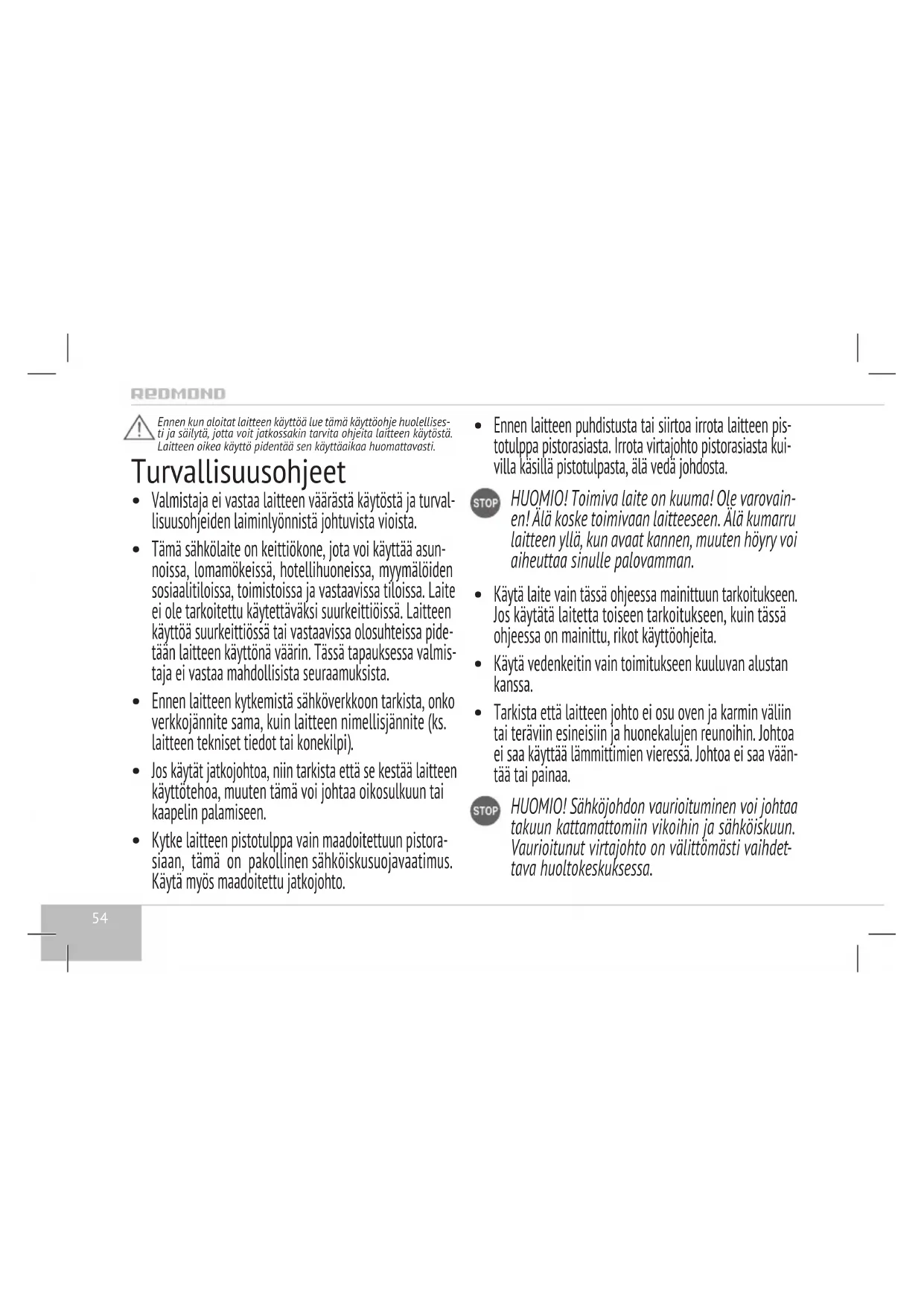 Ennen laitteen puhdistusta tai siirtoa irrota laitteen pis- totulppa pistorasiasta. Irrota virtajohto pistorasiasta kui- villa käsillä pistotulpasta, älä vedä johdosta. HUOMIO! Toimiva laite on kuuma! Ole varovain- en! Älä koske toimivaan laitteeseen. Älä kumarru laitteen yllä, kun avaat kannen, muuten höyry voi aiheuttaa sinulle palovamman.
