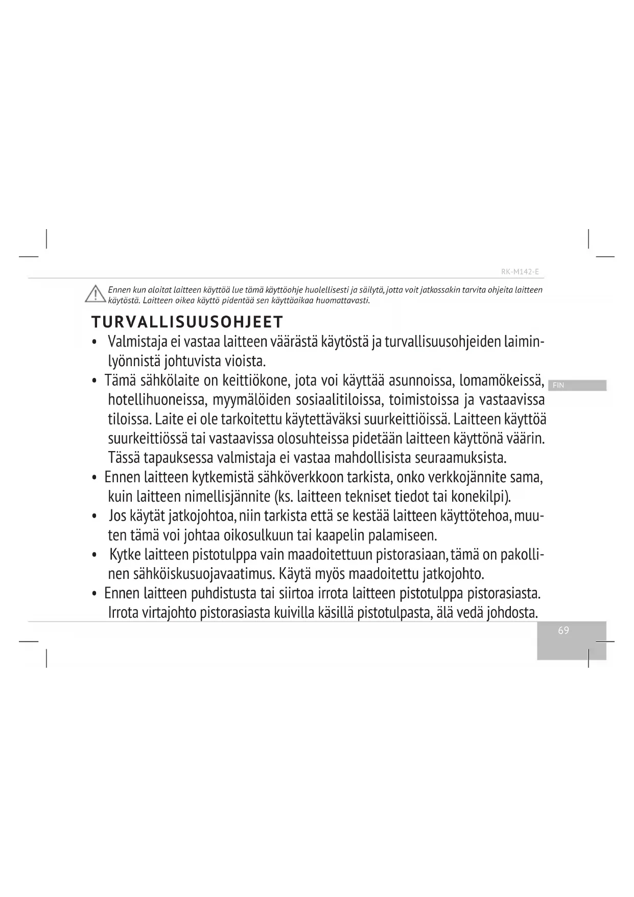 - Älä käytä laitetta ulkona. Kosteus tai vieraat esineet sen rungossa voivat ai- heuttaa laitteen vakavia vaurioita.71 FIN RK-M142-E