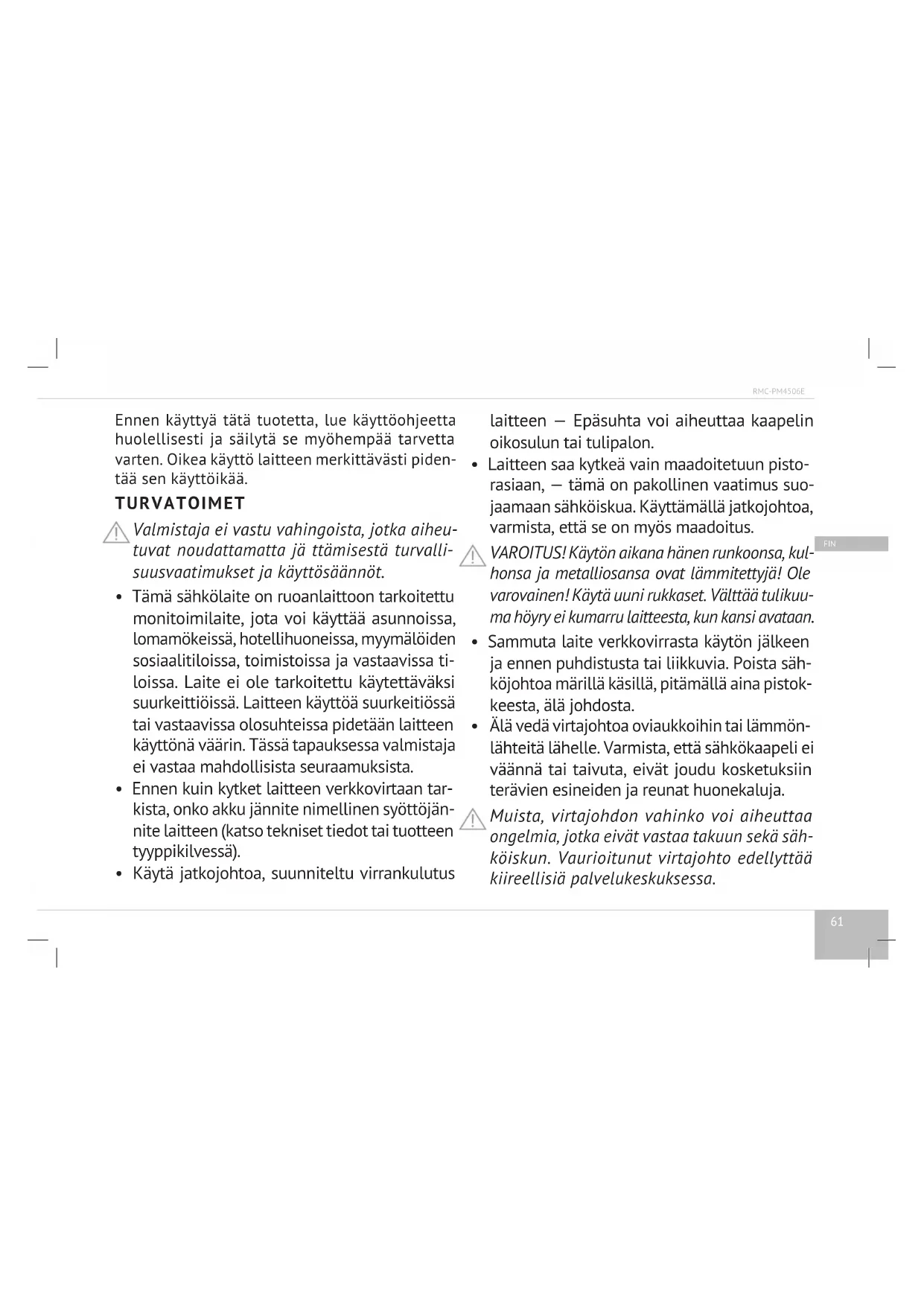 - Älä koskaan yritä korjata tai tehdä muutok- sia sen rakenteeseen. Kaikki huolto-ja kor- jaustyöt saa suorittaa valtuutetussa palve- lukeskuksessa. Epäammattimaista työtä voi johtaa laitevika, ja vaurioittaa omaisuutta.63 FIN RMC-PM4506E Tekniset tiedot Malli ........................................................................................................ RMC-PM4506E Teho ........................................................................................................................ 900 W Jännite .............................................................................................. 220–240 V, 50 Hz Kulhon tilavuus ......................................................................................................4,8 l Kulhon pinnoite ...................................................tarttumaton pinnoite DAIKIN® Näyttö ............................................................................................................LED-näyttö Höyryventtiili ............................................................................................... irrotettava Suojajärjestelmä ...................................................... 4-tasoinen suojajärjestelmä: