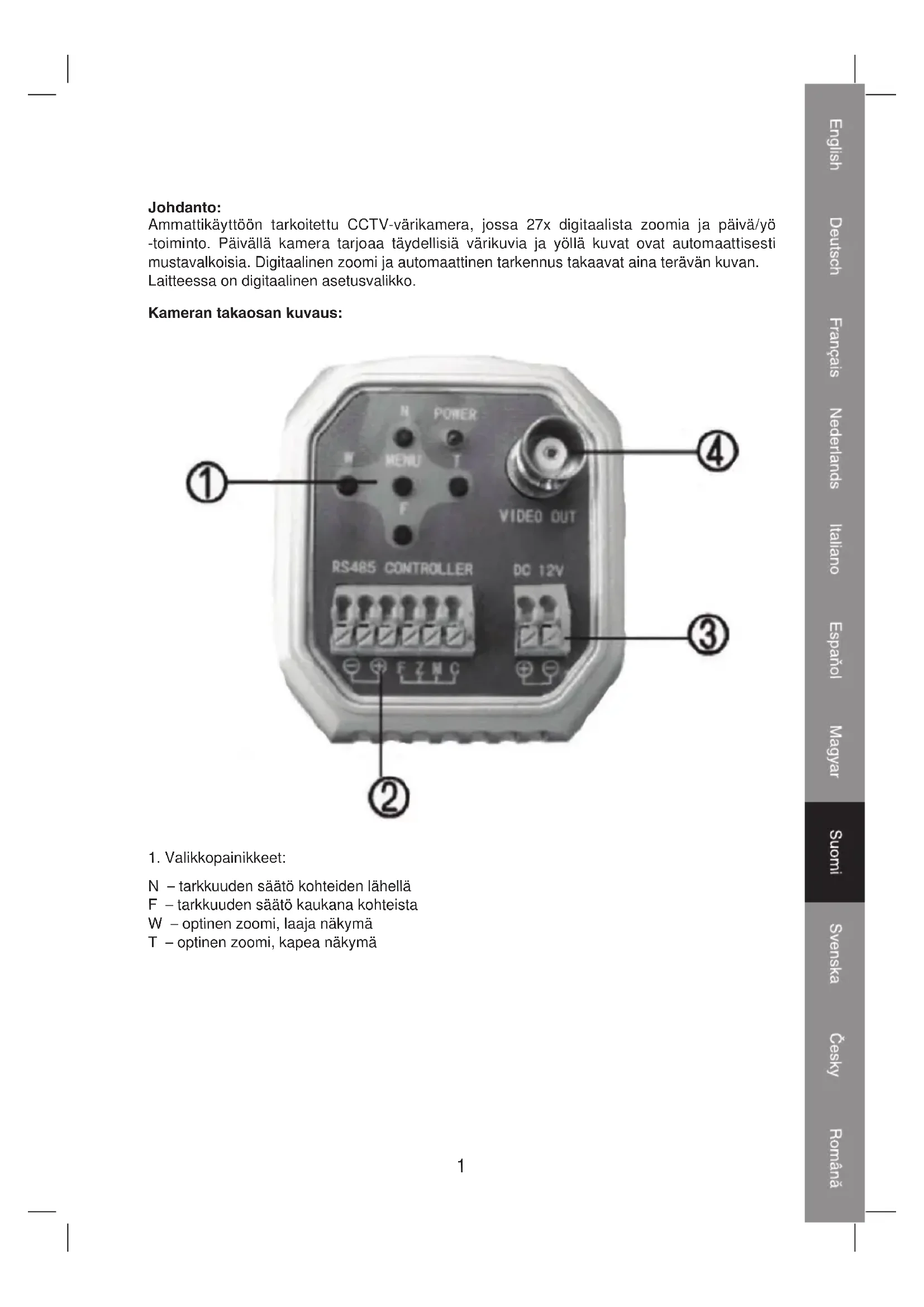 CCTV 27x ZOOMIKAMERA1 Johdanto: Ammattikäyttöön tarkoitettu CCTV-värikamera, jossa 27x digitaalista zoomia ja päivä/yö -toiminto. Päivällä kamera tarjoaa täydellisiä värikuvia ja yöllä kuvat ovat automaattisesti mustavalkoisia. Digitaalinen zoomi ja automaattinen tarkennus takaavat aina terävän kuvan. Laitteessa on digitaalinen asetusvalikko. Kameran takaosan kuvaus: