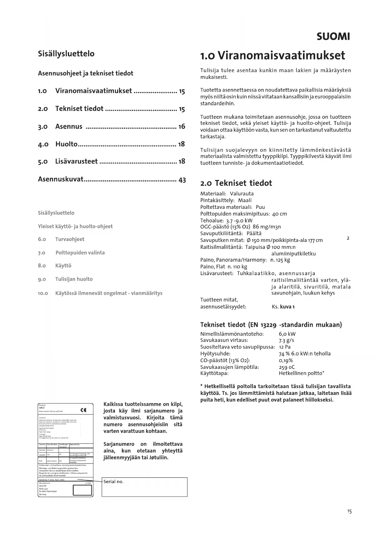 Tuotteen mukana toimitetaan asennusohje, jossa on tuotteen tekniset tiedot, sekä yleiset käytto- ja huolto-ohjeet. Tulisija voidaan ottaa käyttoön vasta, kun sen on tarkastanut valtuutettu tarkastaja.