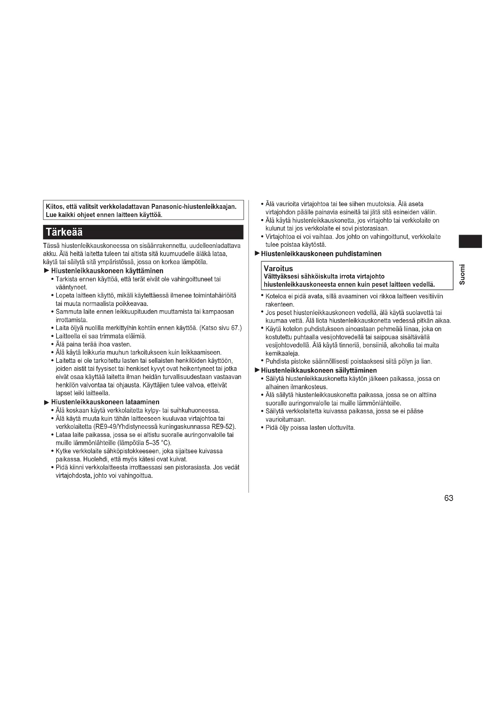 Kiitos, että valitsit verkkoladattavan Panasonic-hiustenleikkaajan. Lue kaikki ohjeet ennen laitteen käyttöä. Tärkeää Tässä hiustenleikkauskoneessa on sisäänrakennettu, uudelleenladattava akku. Älä heitä laitetta tuleen tai altista sitä kuumuudelle äläkä lataa, käytä tai säilytä sitä ympäristössä, jossa on korkea lämpötila. Hiustenleikkauskoneen käyttäminen Tarkista ennen käyttöä, että terät eivät ole vahingoittuneet tai vääntyneet. Lopeta laitteen käyttö, mikäli käytettäessä ilmenee toimintahäiriöitä tai muuta normaalista poikkeavaa. Sammuta laite ennen leikkuupituuden muuttamista tai kampaosan irrottamista. Laita öljyä nuolilla merkittyihin kohtiin ennen käyttöä. (Katso sivu 67.) Laitteella ei saa trimmata eläimiä. Älä paina terää ihoa vasten. Älä käytä leikkuria muuhun tarkoitukseen kuin leikkaamiseen. Laitetta ei ole tarkoitettu lasten tai sellaisten henkilöiden käyttöön, joiden aistit tai fyysiset tai henkiset kyvyt ovat heikentyneet tai jotka eivät osaa käyttää laitetta ilman heidän turvallisuudestaan vastaavan henkilön valvontaa tai ohjausta. Käyttäjien tulee valvoa, etteivät lapset leiki laitteella. Hiustenleikkauskoneen lataaminen Älä koskaan käytä verkkolaitetta kylpy‑ tai suihkuhuoneessa. Älä käytä muuta kuin tähän laitteeseen kuuluvaa virtajohtoa tai verkkolaitetta (RE9‑49/Yhdistyneessä kuningaskunnassa RE9‑52). Lataa laite paikassa, jossa se ei altistu suoralle auringonvalolle tai muille lämmönlähteille (lämpötila 5–35 °C). Kytke verkkolaite sähköpistokkeeseen, joka sijaitsee kuivassa paikassa. Huolehdi, että myös kätesi ovat kuivat. Pidä kiinni verkkolaitteesta irrottaessasi sen pistorasiasta. Jos vedät virtajohdosta, johto voi vahingoittua.