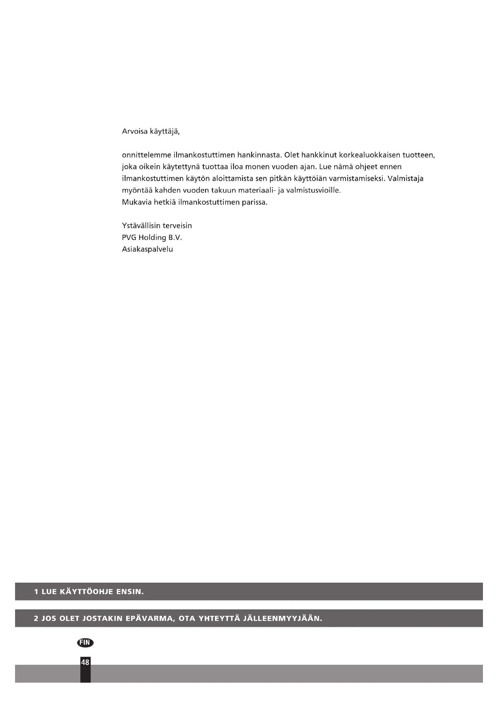 Arvoisa käyttäjä, onnittelemme ilmankostuttimen hankinnasta. Olet hankkinut korkealuokkaisen tuotteen, joka oikein käytettynä tuottaa iloa monen vuoden ajan. Lue nämä ohjeet ennen ilmankostuttimen käytön aloittamista sen pitkän käyttöiän varmistamiseksi. Valmistaja myöntää kahden vuoden takuun materiaali- ja valmistusvioille. Mukavia hetkiä ilmankostuttimen parissa. Ystävällisin terveisin PVG Holding B.V. AsiakaspalveluBELANGRIJKE ONDERDELEN Bedieningspaneel Uitlaat van droge lucht Uitneembaar waterreservoir Inlaat van vochtige lucht Luchtfilter Afvoertuit (ø 13 mm) met dop Zwenkwieltje Stekker en snoer Handvat