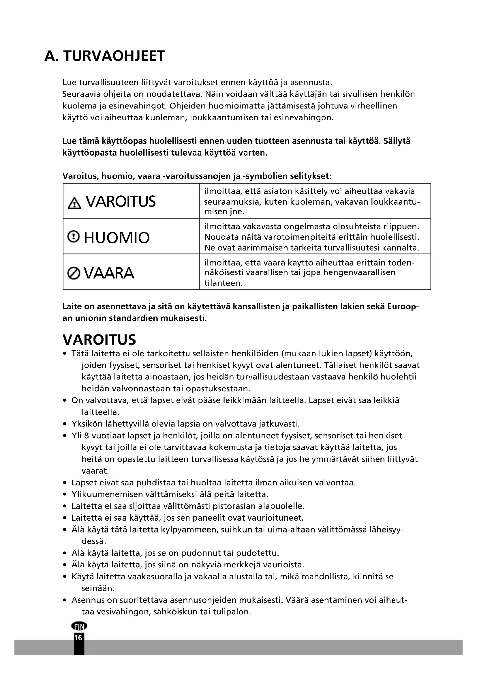15A. TURVAOHJEET Lue turvallisuuteen liittyvät varoitukset ennen käyttöä ja asennusta. Seuraavia ohjeita on noudatettava. Näin voidaan välttää käyttäjän tai sivullisen henkilön kuolema ja esinevahingot. Ohjeiden huomioimatta jättämisestä johtuva virheellinen käyttö voi aiheuttaa kuoleman, loukkaantumisen tai esinevahingon. Lue tämä käyttöopas huolellisesti ennen uuden tuotteen asennusta tai käyttöä. Säilytä käyttöopasta huolellisesti tulevaa käyttöä varten. Varoitus, huomio, vaara -varoitussanojen ja -symbolien selitykset: VAROITUS ilmoittaa, että asiaton käsittely voi aiheuttaa vakavia seuraamuksia, kuten kuoleman, vakavan loukkaantu- misen jne. HUOMIO ilmoittaa vakavasta ongelmasta olosuhteista riippuen. Noudata näitä varotoimenpiteitä erittäin huolellisesti. Ne ovat äärimmäisen tärkeitä turvallisuutesi kannalta. VAARA ilmoittaa, että väärä käyttö aiheuttaa erittäin toden- näköisesti vaarallisen tai jopa hengenvaarallisen tilanteen. Laite on asennettava ja sitä on käytettävä kansallisten ja paikallisten lakien sekä Euroop- an unionin standardien mukaisesti. VAROITUS