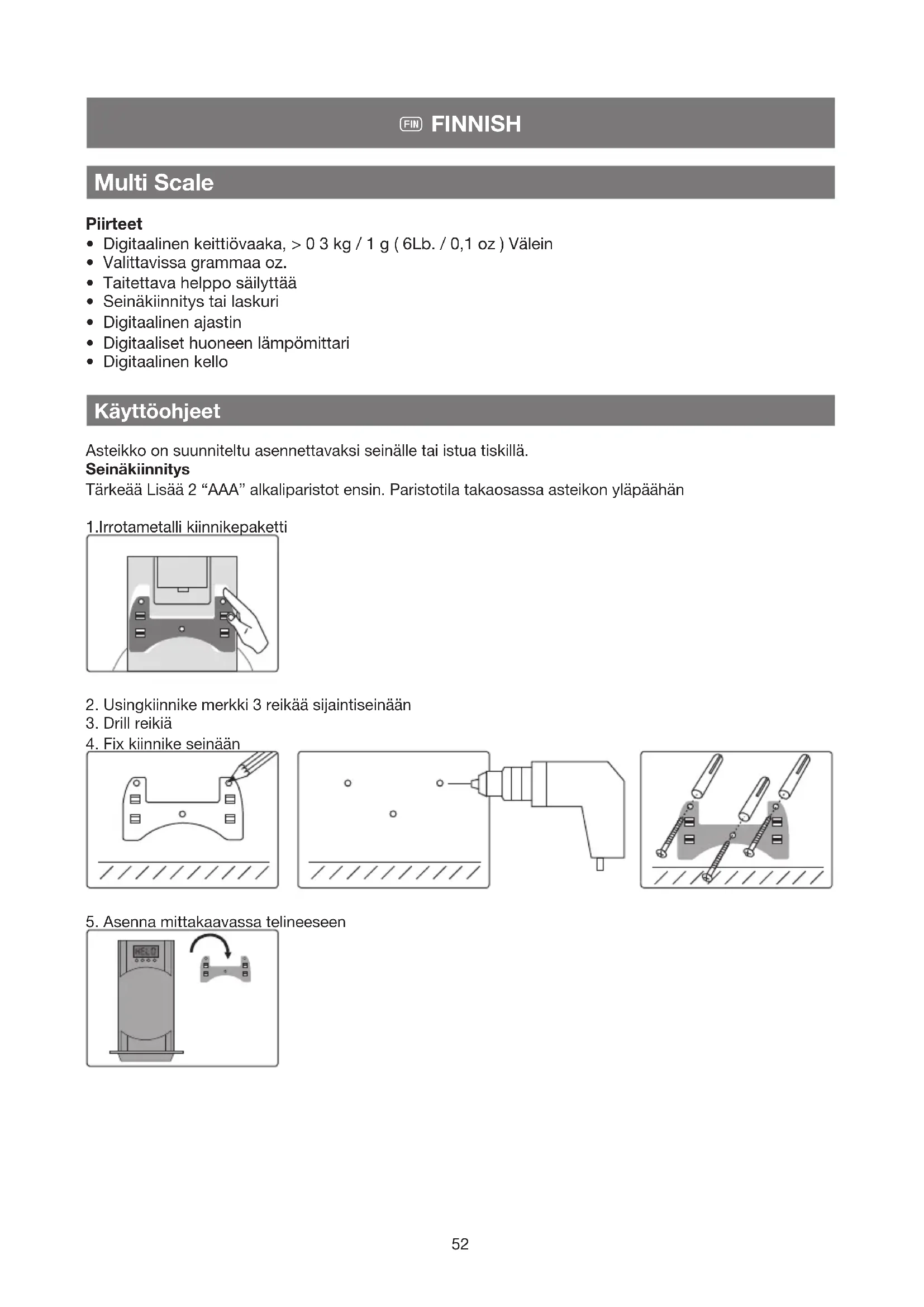 - Digitaalinen kello Käyttöohjeet Asteikko on suunniteltu asennettavaksi seinälle tai istua tiskillä. Seinäkiinnitys Tärkeää Lisää 2 “AAA” alkaliparistot ensin. Paristotila takaosassa asteikon yläpäähän 1.Irrotametalli kiinnikepaketti