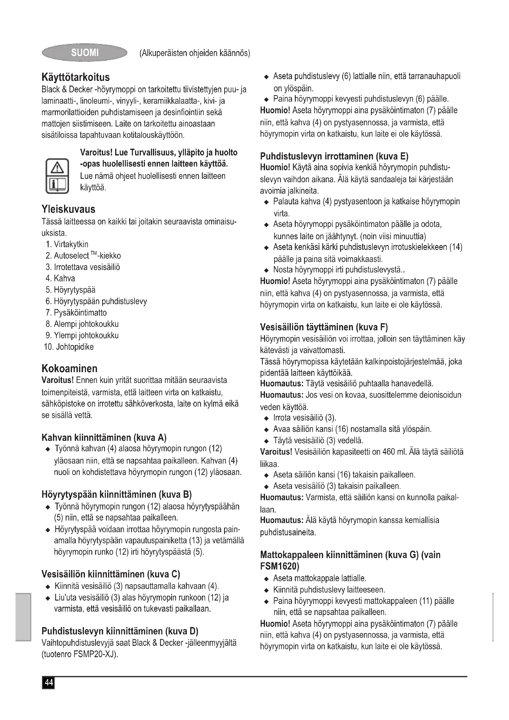Kokoaminen Varoitus! Ennen kuin yrität suorittaa mitään seuraavista toimenpiteistä, varmista, että laitteen virta on katkaistu, sähköpistoke on irrotettu sähköverkosta, laite on kylmä eikä se sisällä vettä. Kahvan kiinnittäminen (kuva A) u Työnnä kahvan (4) alaosa höyrymopin rungon (12) yläosaan niin, että se napsahtaa paikalleen. Kahvan (4) nuoli on kohdistettava höyrymopin rungon (12) yläosaan. Höyrytyspään kiinnittäminen (kuva B) u Työnnä höyrymopin rungon (12) alaosa höyrytyspäähän (5) niin, että se napsahtaa paikalleen. u Höyrytyspää voidaan irrottaa höyrymopin rungosta pain- amalla höyrytyspään vapautuspainiketta (13) ja vetämällä höyrymopin runko (12) irti höyrytyspäästä (5). Vesisäiliön kiinnittäminen (kuva C) u Kiinnitä vesisäiliö (3) napsauttamalla kahvaan (4). u Liu'uta vesisäiliö (3) alas höyrymopin runkoon (12) ja varmista, että vesisäiliö on tukevasti paikallaan. Puhdistuslevyn kiinnittäminen (kuva D) Vaihtopuhdistuslevyjä saat Black & Decker -jälleenmyyjältä (tuotenro FSMP20-XJ). u Aseta puhdistuslevy (6) lattialle niin, että tarranauhapuoli on ylöspäin. u Paina höyrymoppi kevyesti puhdistuslevyn (6) päälle. Huomio! Aseta höyrymoppi aina pysäköintimaton (7) päälle niin, että kahva (4) on pystyasennossa, ja varmista, että höyrymopin virta on katkaistu, kun laite ei ole käytössä. Puhdistuslevyn irrottaminen (kuva E) Huomio! Käytä aina sopivia kenkiä höyrymopin puhdistu- slevyn vaihdon aikana. Älä käytä sandaaleja tai kärjestään avoimia jalkineita. u Palauta kahva (4) pystyasentoon ja katkaise höyrymopin virta. u Aseta höyrymoppi pysäköintimaton päälle ja odota, kunnes laite on jäähtynyt. (noin viisi minuuttia) u Aseta kenkäsi kärki puhdistuslevyn irrotuskielekkeen (14) päälle ja paina sitä voimakkaasti. u Nosta höyrymoppi irti puhdistuslevystä.. Huomio! Aseta höyrymoppi aina pysäköintimaton (7) päälle niin, että kahva (4) on pystyasennossa, ja varmista, että höyrymopin virta on katkaistu, kun laite ei ole käytössä. Vesisäiliön täyttäminen (kuva F) Höyrymopin vesisäiliön voi irrottaa, jolloin sen täyttäminen käy kätevästi ja vaivattomasti. Tässä höyrymopissa käytetään kalkinpoistojärjestelmää, joka pidentää laitteen käyttöikää. Huomautus: Täytä vesisäiliö puhtaalla hanavedellä. Huomautus: Jos vesi on kovaa, suosittelemme deionisoidun veden käyttöä. u Irrota vesisäiliö (3). u Avaa säiliön kansi (16) nostamalla sitä ylöspäin. u Täytä vesisäiliö (3) vedellä. Varoitus! Vesisäiliön kapasiteetti on 460 ml. Älä täytä säiliötä liikaa. u Aseta säiliön kansi (16) takaisin paikalleen. u Aseta vesisäiliö (3) takaisin paikalleen. Huomautus: Varmista, että säiliön kansi on kunnolla paikal- laan. Huomautus: Älä käytä höyrymopin kanssa kemiallisia puhdistusaineita. Mattokappaleen kiinnittäminen (kuva G) (vain FSM1620) u Aseta mattokappale lattialle. u Kiinnitä puhdistuslevy laitteeseen. u Paina höyrymoppi kevyesti mattokappaleen (11) päälle niin, että se napsahtaa paikalleen. Huomio! Aseta höyrymoppi aina pysäköintimaton (7) päälle niin, että kahva (4) on pystyasennossa, ja varmista, että höyrymopin virta on katkaistu, kun laite ei ole käytössä.45 (Alkuperäisten ohjeiden käännös) SUOMI Mattokappaleen irrottaminen (kuva G) (vain FSM1620) Huomio! Käytä aina sopivia kenkiä höyrymopin mattokap- paleen vaihdon aikana. Älä käytä sandaaleja tai kärjestään avoimia jalkineita. u Palauta kahva (4) pystyasentoon ja katkaise höyrymopin virta. u Aseta höyrymoppi pysäköintimaton päälle ja odota, kunnes laite on jäähtynyt. (noin viisi minuuttia) u Aseta kenkäsi kärki mattokappaleen irrotuskielekkeen (15) päälle ja paina sitä voimakkaasti. u Nosta höyrymoppi irti mattokappaleesta (11). Huomio! Aseta höyrymoppi aina pysäköintimaton (7) päälle niin, että kahva (4) on pystyasennossa, ja varmista, että höyrymopin virta on katkaistu, kun laite ei ole käytössä. Käyttö Tärkeää! Tämä laite tappaa 99.9 % bakteereista ja basilleista, kun sitä käytetään tämän oppaan ohjeiden mukaisesti 90 sekunnin ajan mikrokuitulevy asennettuna. Käynnistäminen ja pysäyttäminen u Käynnistä laite painamalla virtakytkintä (1). Höyrymoppi lämpenee noin 15 sekunnissa. Huomautus: Kun höyrymoppiin kytketään virta, vesisäiliö hehkuu punaisena. Kun höyrymoppi on valmiina käyttöön, vesisäiliö hehkuu sinisenä. u Voit sammuttaa laitteen painamalla virtakytkintä (1). Huomio! Älä jätä höyrymoppia pidemmäksi ajaksi yhteen paikkaan. Aseta höyrymoppi aina pysäköintimaton (7) päälle niin, että kahva (4) on pystyasennossa, ja varmista, että höyrymopin virta on katkaistu, kun laite ei ole käytössä. Huomio! Tyhjennä höyrymoppi aina käytön jälkeen. Huomautus: Höyryn muodostuminen voi kestää 45 sekuntia ensimmäisen täytön tai kuivakäytön jälkeen. Autoselect