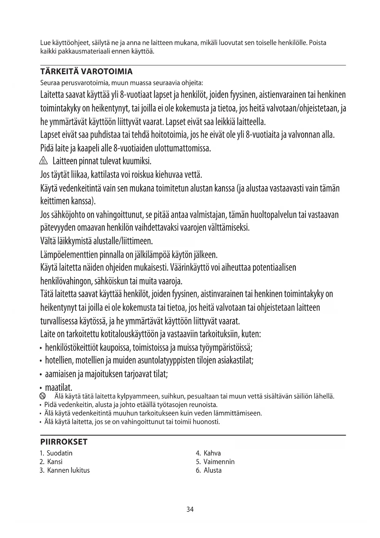 Seuraa perusvarotoimia, muun muassa seuraavia ohjeita: Laitetta saavat käyttää yli 8-vuotiaat lapset ja henkilöt, joiden fyysinen, aistienvarainen tai henkinen toimintakyky on heikentynyt, tai joilla ei ole kokemusta ja tietoa, jos heitä valvotaan/ohjeistetaan, ja he ymmärtävät käyttöön liittyvät vaarat. Lapset eivät saa leikkiä laitteella. Lapset eivät saa puhdistaa tai tehdä hoitotoimia, jos he eivät ole yli 8-vuotiaita ja valvonnan alla. Pidä laite ja kaapeli alle 8-vuotiaiden ulottumattomissa. h Laitteen pinnat tulevat kuumiksi. Jos täytät liikaa, kattilasta voi roiskua kiehuvaa vettä. Käytä vedenkeitintä vain sen mukana toimitetun alustan kanssa (ja alustaa vastaavasti vain tämän keittimen kanssa). Jos sähköjohto on vahingoittunut, se pitää antaa valmistajan, tämän huoltopalvelun tai vastaavan pätevyyden omaavan henkilön vaihdettavaksi vaarojen välttämiseksi. Vältä läikkymistä alustalle/liittimeen. Lämpöelementtien pinnalla on jälkilämpöä käytön jälkeen. Käytä laitetta näiden ohjeiden mukaisesti. Väärinkäyttö voi aiheuttaa potentiaalisen henkilövahingon, sähköiskun tai muita vaaroja. Tätä laitetta saavat käyttää henkilöt, joiden fyysinen, aistinvarainen tai henkinen toimintakyky on heikentynyt tai joilla ei ole kokemusta tai tietoa, jos heitä valvotaan tai ohjeistetaan laitteen turvallisessa käytössä, ja he ymmärtävät käyttöön liittyvät vaarat. Laite on tarkoitettu kotitalouskäyttöön ja vastaaviin tarkoituksiin, kuten: