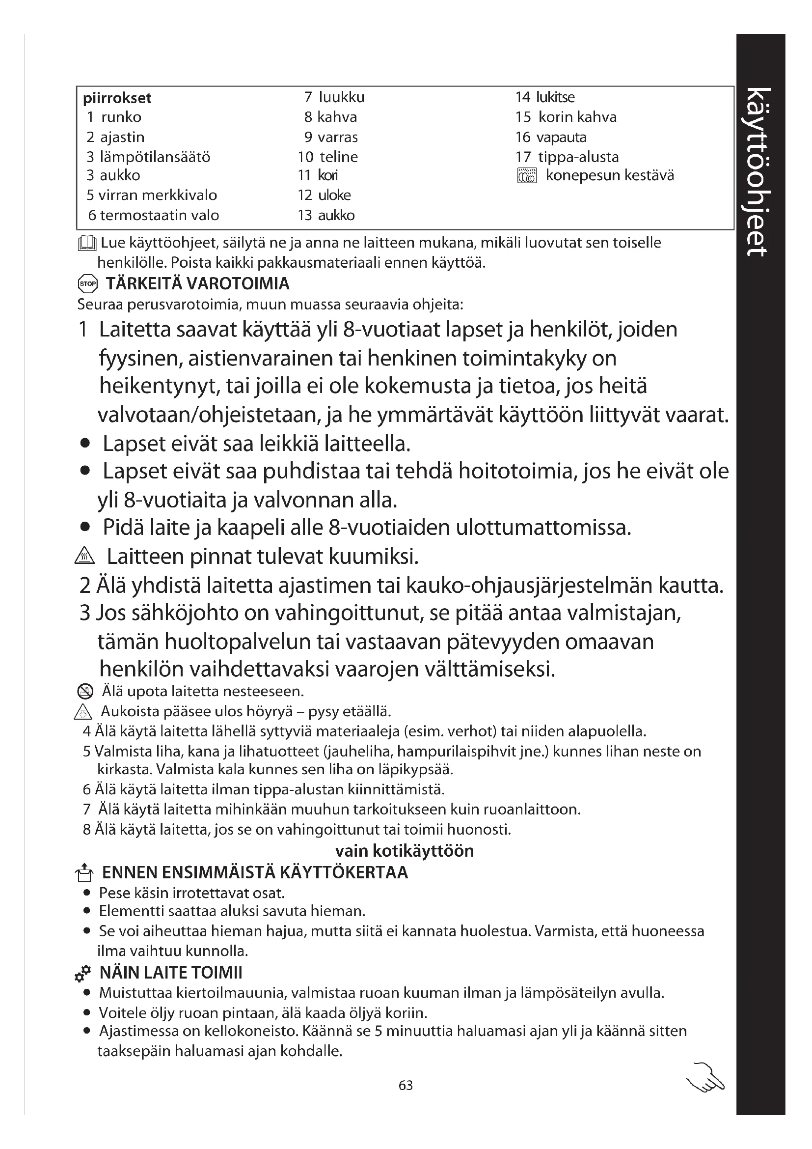 - Ajastimessa on kellokoneisto. Käännä se 5 minuuttia haluamasi ajan yli ja käännä sitten taaksepäin haluamasi ajan kohdalle. käyttöohjeet piirrokset 1 runko 2 ajastin 3 lämpötilansäätö 3 aukko 5 virran merkkivalo 6 termostaatin valo 7 luukku 8 kahva 9 varras 10 teline 11 kori 12 uloke 13 aukko 14 lukitse 15 korin kahva 16 vapauta 17 tippa-alusta ` konepesun kestävä64 C VALMISTELU 1 Aseta laite vakaalla, tasaiselle ja kuumuutta kestävälle alustalle. 2 Jätä vähintään 50 mm tyhjä tila laitteen ympärille. 3 Käytä uunikintaita (tai patalappuja) käsissä.
