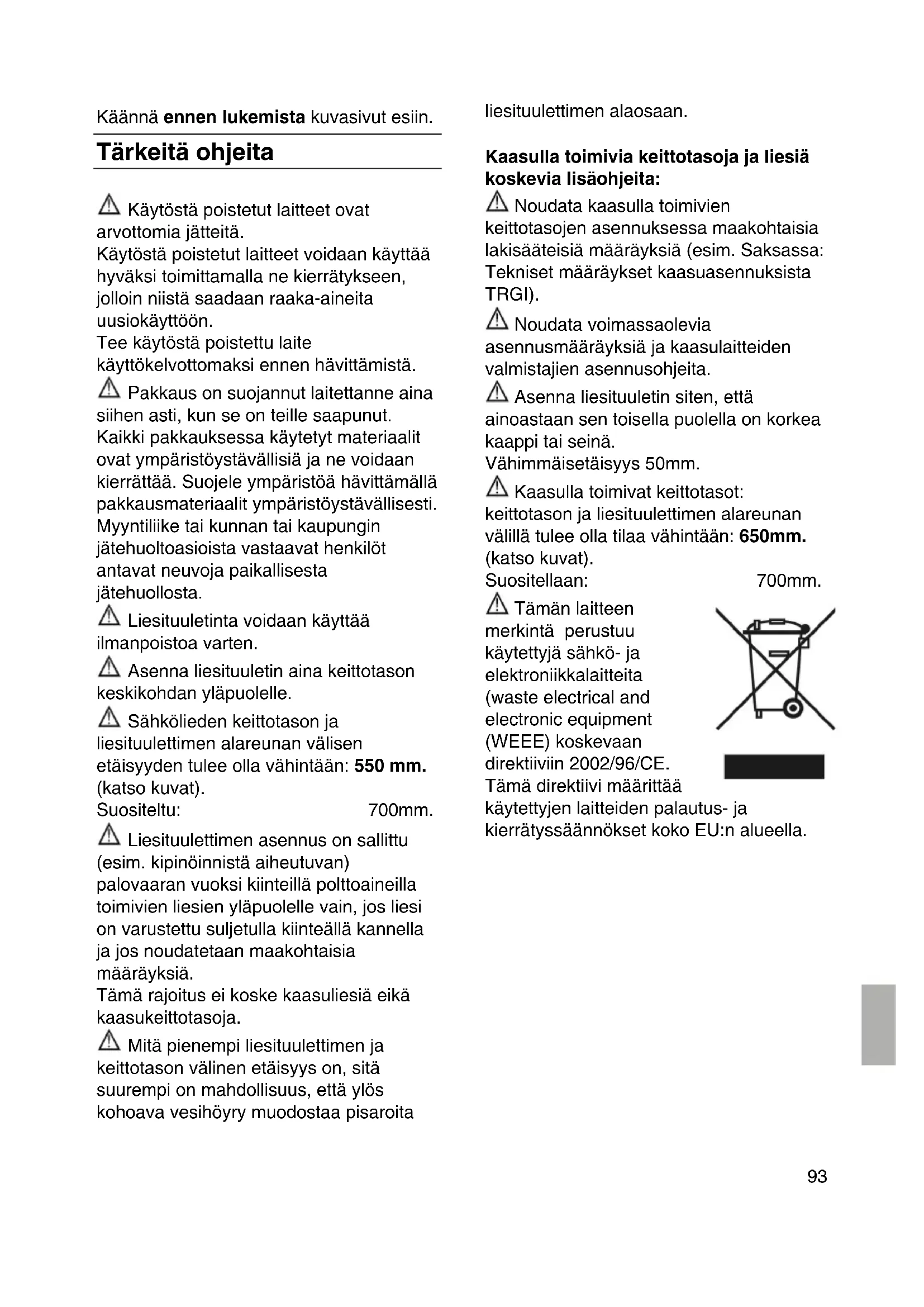 Käännä ennen lukemista kuvasivut esiin. Tärkeitä ohjeita Käytöstä poistetut laitteet ovat arvottomia jätteitä. Käytöstä poistetut laitteet voidaan käyttää hyväksi toimittamalla ne kierrätykseen, jolloin niistä saadaan raaka-aineita uusiokäyttöön. Tee käytöstä poistettu laite käyttökelvottomaksi ennen hävittämistä. Pakkaus on suojannut laitettanne aina siihen asti, kun se on teille saapunut. Kaikki pakkauksessa käytetyt materiaalit ovat ympäristöystävällisiä ja ne voidaan kierrättää. Suojele ympäristöä hävittämällä pakkausmateriaalit ympäristöystävällisesti. Myyntiliike tai kunnan tai kaupungin jätehuoltoasioista vastaavat henkilöt antavat neuvoja paikallisesta jätehuollosta. Liesituuletinta voidaan käyttää ilmanpoistoa varten. Asenna liesituuletin aina keittotason keskikohdan yläpuolelle. Sähkölieden keittotason ja liesituulettimen alareunan välisen etäisyyden tulee olla vähintään: 550 mm. (katso kuvat). Suositeltu: 700mm. Liesituulettimen asennus on sallittu (esim. kipinöinnistä aiheutuvan) palovaaran vuoksi kiinteillä polttoaineilla toimivien liesien yläpuolelle vain, jos liesi on varustettu suljetulla kiinteällä kannella ja jos noudatetaan maakohtaisia määräyksiä. Tämä rajoitus ei koske kaasuliesiä eikä kaasukeittotasoja. Mitä pienempi liesituulettimen ja keittotason välinen etäisyys on, sitä suurempi on mahdollisuus, että ylös kohoava vesihöyry muodostaa pisaroita liesituulettimen alaosaan. Kaasulla toimivia keittotasoja ja liesiä koskevia lisäohjeita: Noudata kaasulla toimivien keittotasojen asennuksessa maakohtaisia lakisääteisiä määräyksiä (esim. Saksassa: Tekniset määräykset kaasuasennuksista TRGI). Noudata voimassaolevia asennusmääräyksiä ja kaasulaitteiden valmistajien asennusohjeita. Asenna liesituuletin siten, että ainoastaan sen toisella puolella on korkea kaappi tai seinä. Vähimmäisetäisyys 50mm. Kaasulla toimivat keittotasot: keittotason ja liesituulettimen alareunan välillä tulee olla tilaa vähintään: 650mm. (katso kuvat). Suositellaan: 700mm. Tämän laitteen merkintä perustuu käytettyjä sähkö- ja elektroniikkalaitteita (waste electrical and electronic equipment (WEEE) koskevaan direktiiviin 2002/96/CE. Tämä direktiivi määrittää käytettyjen laitteiden palautus- ja kierrätyssäännökset koko EU:n alueella.94