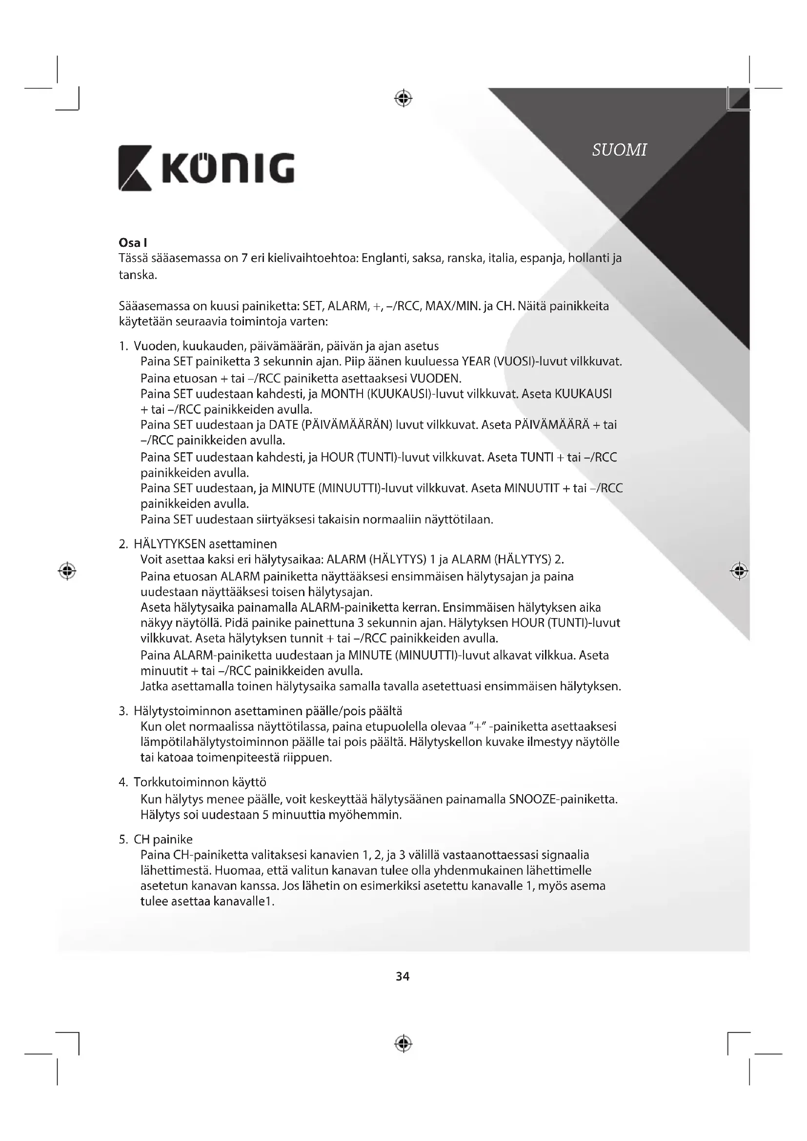 ÄLÄ AVAA Turvallisuustoimenpiteet: Sähköiskun riskin pienentämiseksi, AINOASTAAN valtuutettu huoltohenkilö saa avata tämän laitteen huoltoa varten. Jos ongelmia ilmenee, irrota laite verkkovirrasta ja muista laitteista. Älä altista laitetta vedelle ja kosteudelle. Huolto: Puhdista ainoastaan kuivalla liinalla. Älä käytä liuottimia tai hankausaineita. Takuu: Takuu ja vastuuvelvollisuus mitätöityvät, jos tuote vaurioituu siihen tehtyjen muutoksien tai sen väärinkäytön takia. Yleistä: Muutoksia malliin ja teknisiin ominaisuuksiin voidaan tehdä ilmoituksetta. Kaikki logot, merkit ja tuotenimet ovat niiden vastaavien omistajien tuotemerkkejä tai rekisteröityjä tuotemerkkejä ja niitä on käsiteltävä sellaisina. Säilytä käyttöohjeet ja pakkaus myöhempää käyttötarvetta varten. Huomio: Tämä tuote on merkitty tällä symbolilla. Se merkitsee, ettei käytettyjä sähkö- tai elektronisia tuotteita saa hävittää kotitalousjätteen mukana. Kyseisille tuotteille on olemassa erillinen keräysjärjestelmä. Tämä tuote on valmistettu ja toimitettu noudattaen kaikkia sitä koskevia asetuksia ja direktiivejä, jotka ovat voimassa kaikissa Euroopan unionin jäsenvaltioissa. Se täyttää myös kaikki myyntimaassa sovellettavat vaatimukset ja määräykset. Viralliset asiakirjat ovat saatavilla pyynnöstä. Asiakirjoihin sisältyvät seuraavat, mutta näihin rajoittumatta: Vaatimustenmukaisuusvakuutus (ja tuotteen tunniste), käyttöturvallisuustiedote, tuotteen testiraportti. Saat neuvoja ottamalla yhteyttä asiakaspalveluumme: verkkosivun kautta: http://www.nedis./-/ota-yhteytta/yhteyslomake.htm sähköpostilla: service@nedis.com puhelimitse: +31 (0)73-5993965 (toimistoaikoina) NEDIS B.V., De Tweeling 28, 5215 MC ’s-Hertogenbosch, ALANKOMAAT38 SVENSKA Del I Väderstationen har sju olika språkalternativ: engelska, tyska, franska, italienska, spanska, holländska och danska. Väderstationen har 6 olika knappar: SET, ALARM, +, –/RCC, MAX/MIN och CH. Knapparna har följande funktioner: