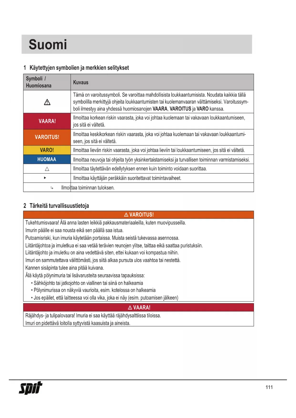 seen, jos sitä ei vältetä. VARO! Ilmoittaa lievän riskin vaarasta, joka voi johtaa lieviin tai loukkaantumiseen, jos sitä ei vältetä. HUOMAA Ilmoittaa neuvoja tai ohjeita työn yksinkertaistamiseksi ja turvallisen toiminnan varmistamiseksi.