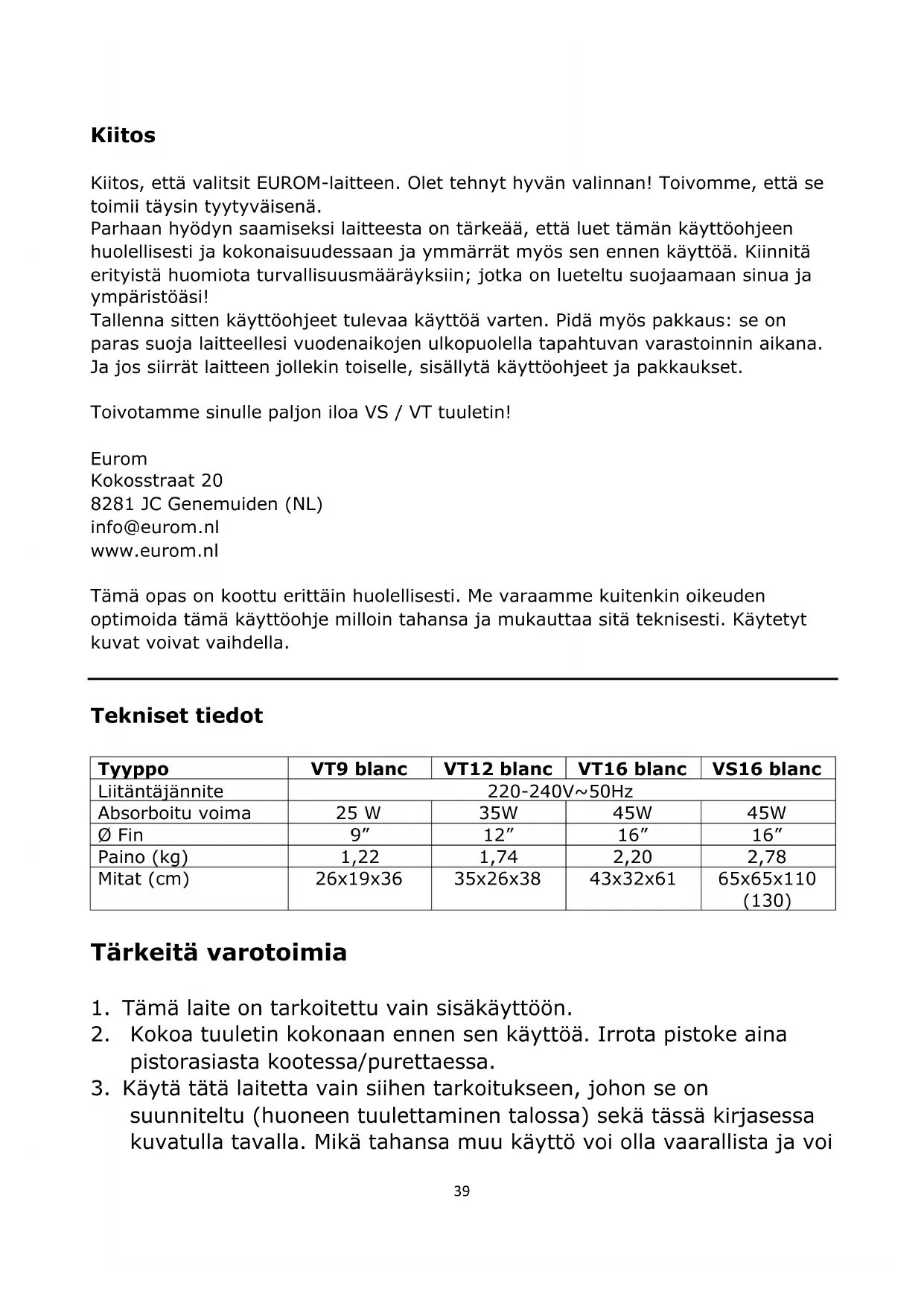 pultilla. Toiminta Tuulettimet toimivat eri nopeuksilla: VT9 blancissa on kaksi nopeutta ja VT12 blanc, VT16 blanc sekä VS16 blanc tarjoavat kolme nopeutta. Kaikissa tyypeissä on kääntötoiminto (45 °). Kun: - tuuletin on koottu kokonaan - kaikki liitännät on kiristetty - kaikkia turvallisuusmääräyksiä on noudatettu voit aloittaa tuulettimen käytön: Aseta pistoke pistorasiaan. Valitse teho: 0 = pois päältä, 1 = vakio, 2 = nopea ja 3 = erittäin nopea. Tuuletin alkaa nyt toimia. Paina haluttaessasi moottorin päällä olevaa kääntöpainiketta: tuuletin kääntyy nyt 45 °:n kulmassa. Vetämällä tätä painiketta ylöspäin, kytket kääntötoiminnon (tai oskilloinnin) pois päältä. Jotta tuuletin puhaltaa ylös tai alas hieman enemmän, voit säätää moottorin lohkoa tuulettimen yläosassa ylös tai alas suhteessa jalustaan. Ennen kuin teet tämän, sammuta tuuletin ja poista pistoke pistorasiasta! Voit sammuttaa tuulettimen painamalla 0-painiketta. Jos haluat keskeyttää käytön yli muutaman minuutin ajan, sinun on myös poistettava pistoke pistorasiasta. Puhdistus ja huolto Sammuta tuuletin ja irrota se, kun puhdistat tai huollat laitetta. Tuuletin vaatii vain yleistä ulkoista huoltoa. Pyyhi pölyt säännöllisesti pehmeällä liinalla tai pölyhuiskalla tai imuroi se pehmeällä pölynimurin harjalla. Jos se on hyvin likainen, avaa etusäleikkö ja pyyhi säleiköt ja päällisosat hieman kostutetulla liinalla ja miedolla puhdistusaineella. Kuivaa kaikki osat kunnolla, anna tuulettimen kuivua perusteellisesti ja kokoa se kokonaan uudelleen ennen käyttöä. Varmista, ettei vettä pääse muihin osiin kuin säleikköön ja siipiosiin! Älä koskaan huuhtele tai suihkuta tuuletinta! Älä käytä suihkeita. Värjäytymisen välttämiseksi tai materiaalin muodonmuutoksen estämiseksi älä koskaan käytä aggressiivisia tai syövyttäviä (puhdistusaineita) aineita. Jos haluat varastoida tuulettimen kauden lopussa, laita se alkuperäispakkaukseen: se tarjoaa parhaan suojan. Laita se turvalliseen, kuivaan paikkaan, joka ei ole kovin kuuma tai kylmä.45 Ongelmat ja vianmääritys Tuulettimen siivet eivät pyöri tuulettimen ollessa päällä Onko pistoke asetettu oikein pistorasiaan? Onko pistorasiassa virtaa? Onko painiketta 1, 2 tai 3 painettu? Onko siivet jossain jumissa, esimerkiksi vaurioiden tai suojaverkkojen muodonmuutoksen tai vieraan esineen takia? Epänormaali ääni käynnistyksen aikana Tarkista, että tuulettimen siivet on sijoitettu niin pitkälle moottorin akselin yli kuin mahdollista. Tarkista mahdolliset pienet epäsäännöllisyydet siipien ympärillä. Tarkista, koskettaako siipi suojaritilän epämuodostunutta osaa. Varoitus: Vain pätevät teknikot saavat suorittaa korjauksia. Tämä pätee myös sähköjohdon ja pistokkeen vaihtamiseen tai korjaamiseen. Pyydä aina alkuperäisiä osia korjauksiin. Laitteeseen tehdyt muutokset ja vääränlaiset korjaukset mitätöivät automaattisesti takuun ja sulkevat pois toimittajan, maahantuojan ja valmistajan vastuun. Poistaminen EU: ssa tämä symboli tarkoittaa, että tätä tuotetta ei saa hävittää tavallisen talousjätteen mukana. Jätelaitteet sisältävät arvokkaita materiaaleja, joita voidaan ja pitää käyttää uudelleen, jotta sääntelemättömän jätteenkeräyksen avulla ei vahingoiteta ympäristöä ja terveyttä. Siksi vie hävitetyt välineet nimettyyn keräyspisteeseen tai ota yhteyttä yritykseen, josta ostit laitteen. He voivat varmistaa, että mahdollisimman monta laitteen osaa käytetään uudelleen. CE-vakuutus Katso sive 46.46 CE–declaration Eurom Kokosstraat 20 8281 JC Genemuiden The Netherlands declares the following device in sole responsibility: Product: ventilator Brand name: EUROM Model: VT9 blanc / VT12 blanc / VT16 blanc / VS16 blanc Item number: 385427 / 385434 / 385441 / 385458 Complies with the following harmonization rules: Low Voltage Directive: LVD 2014/35/EU Electromagnetic compatibility Directive: EMC 2014/30/EU Restriction of Hazardous Substances RoHS Directive:2011/65/EU&(EU)2015/863 Applied harmonized standards: EN 60335-2-80:2003+A1:2004+A2:2009 EN 60335-1:2012+A11:2014+A13:2017 EN 62233:2008 EN 55014-1:2017