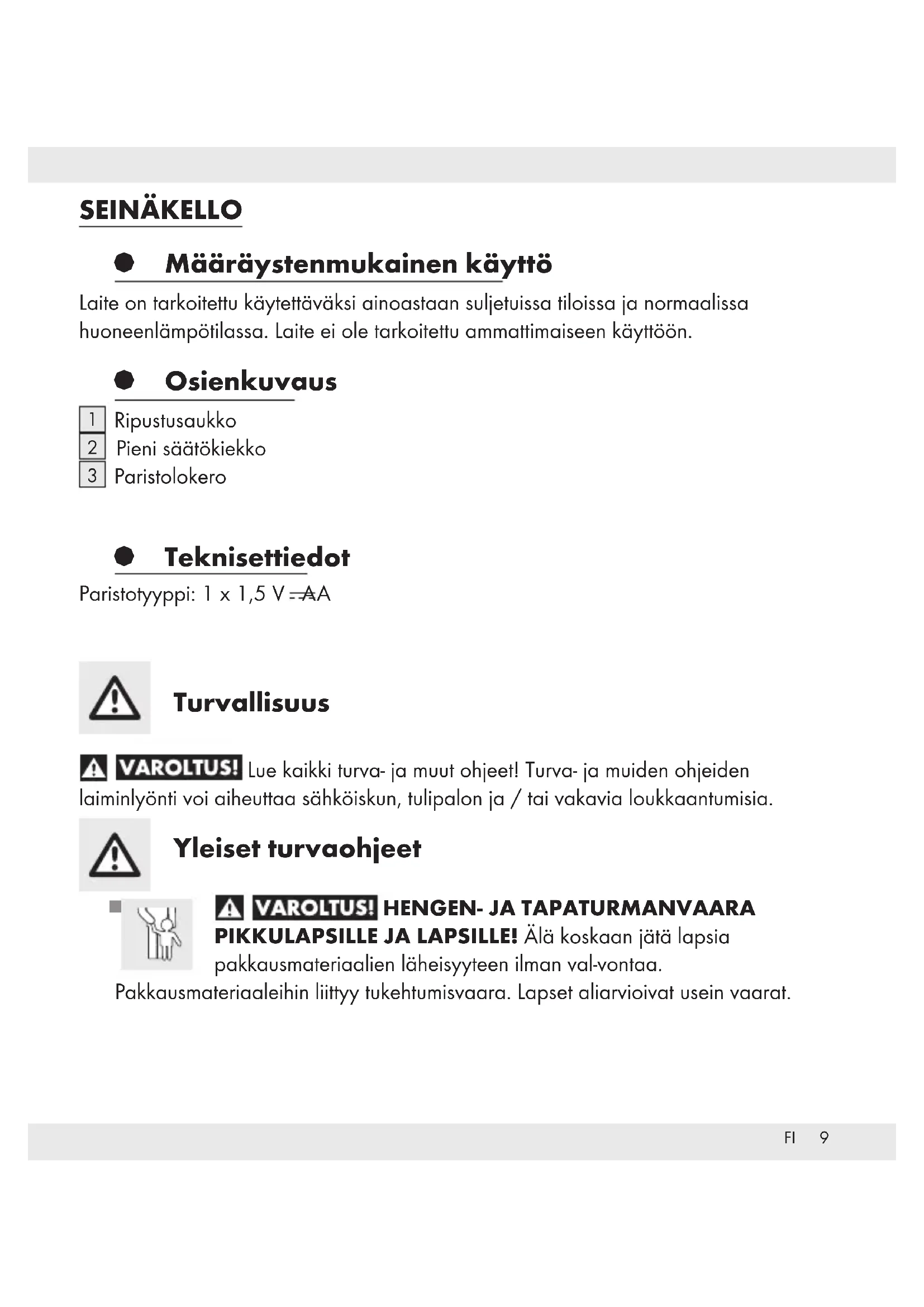 Paristolokero § Tekniset tiedot Paristotyyppi: 1 x 1,5 V AA Turvallisuus Lue kaikki turva- ja muut ohjeet! Turva- ja muiden ohjeiden laiminlyönti voi aiheuttaa sähköiskun, tulipalon ja / tai vakavia loukkaantumisia. Yleiset turvaohjeet